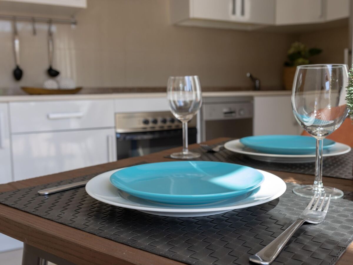Cuisine ouverte (four, lave-vaisselle, 4 plaques vitrocéramiques, grille-pain, bouilloire électrique, micro-ondes, cafetière électrique, Capsules pour machine à café (Dolce Gusto)).