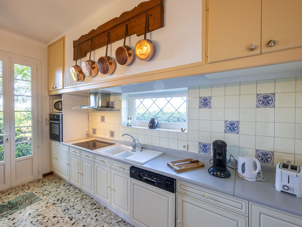 Cuisine (four, lave-vaisselle, 4 plaques vitrocéramiques, grille-pain, bouilloire électrique, micro-ondes, congélateur, cafetière électrique) avec air-conditionné.