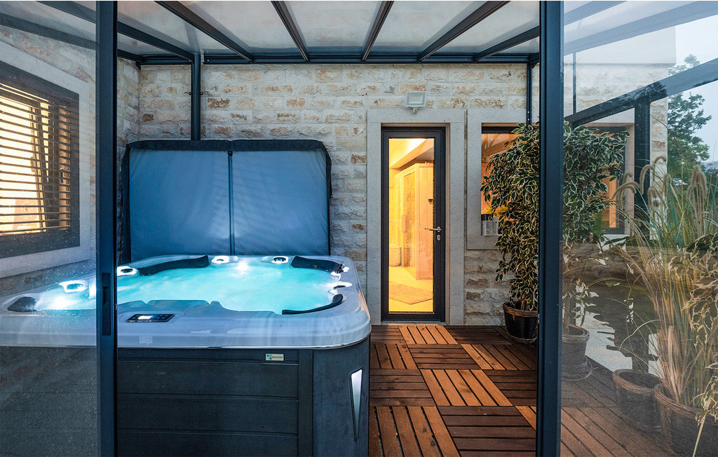 Bien-être à l'extérieur : Location de vacances disposant de chaises-longues et d'un ou plusieurs équipements tels que piscine extérieure, jacuzzi extérieur, lit à baldaquin de jardin etc...