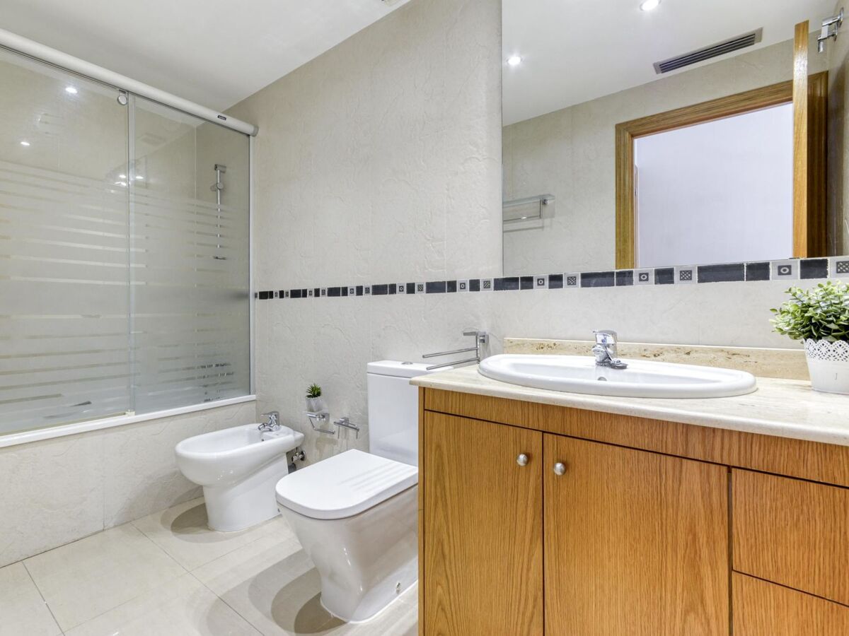 À l'étage supérieur: 1 grande chambre avec 1 grand-lit (160 cm, longueur 200 cm), bain/bidet/WC, air-conditionné et chauffage à air chaud.