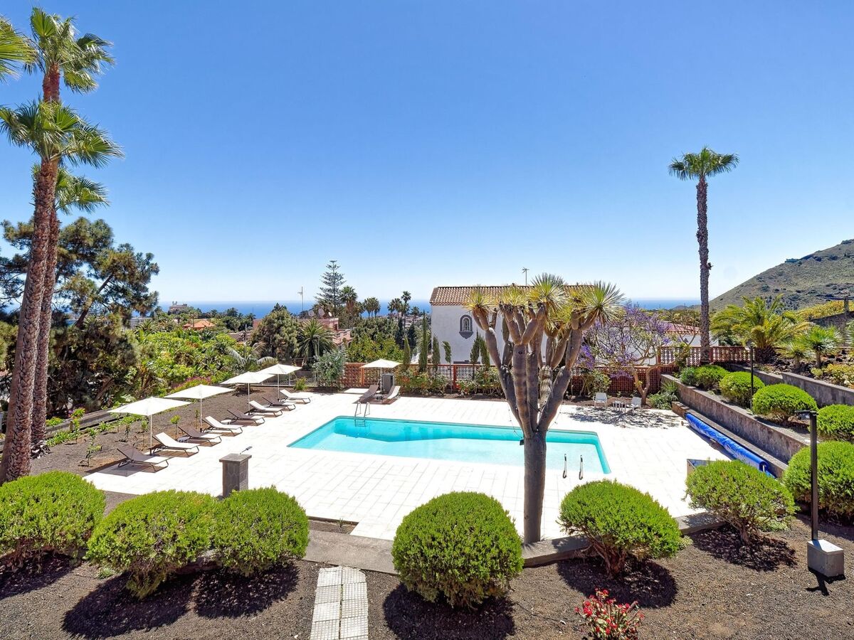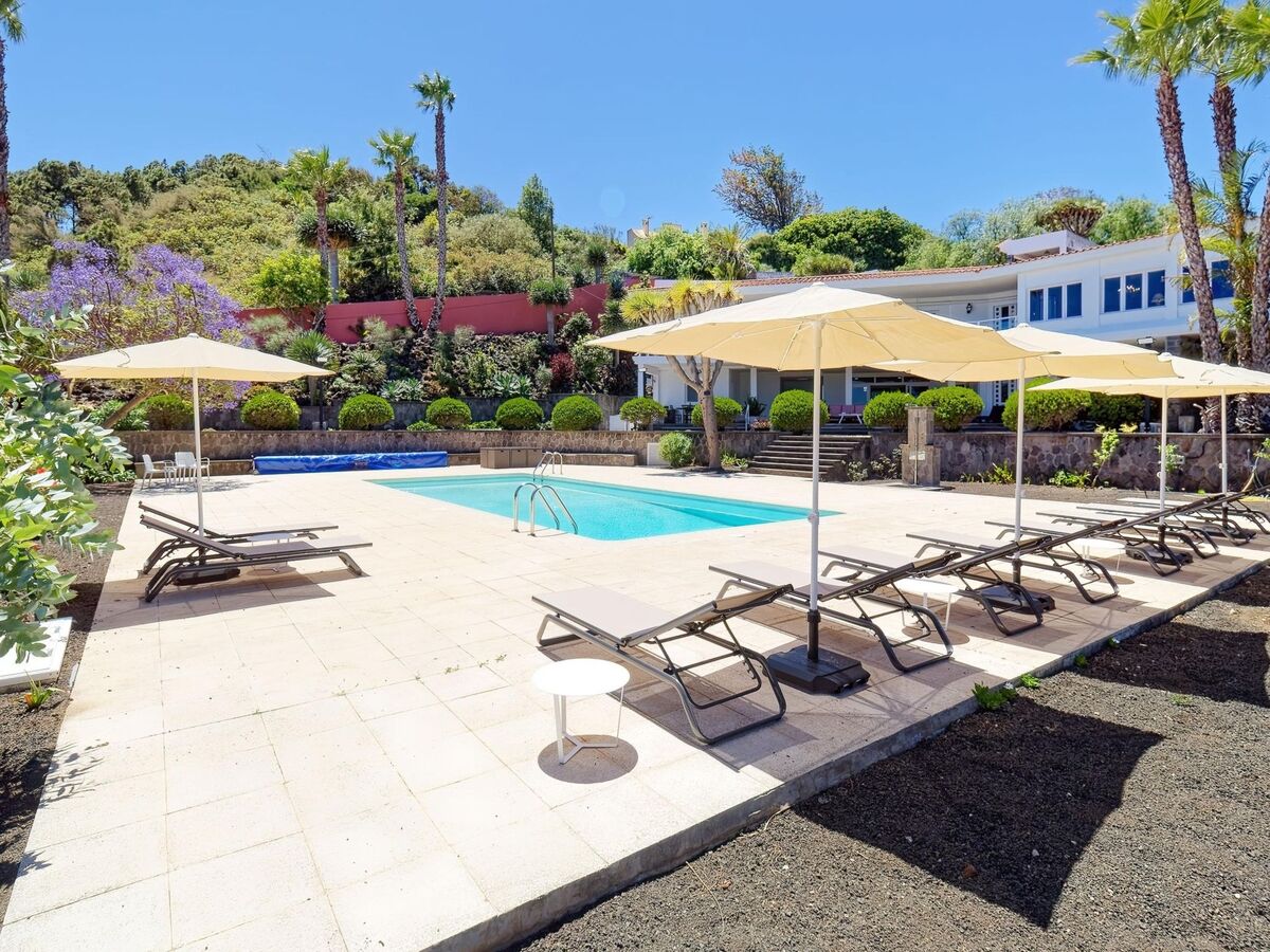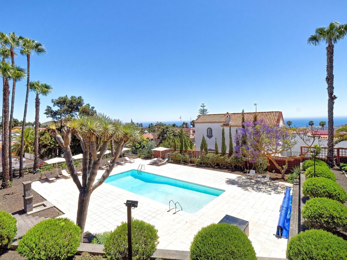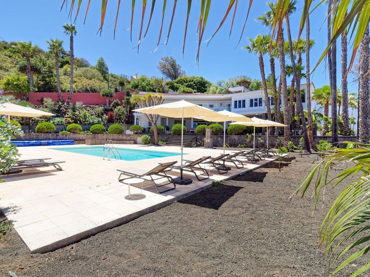 Vue sur la piscine et le jardin.