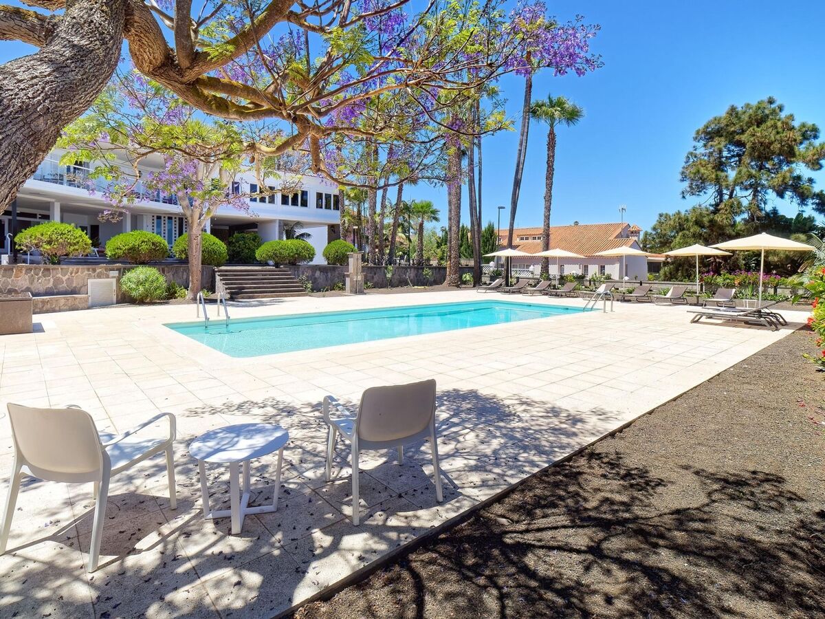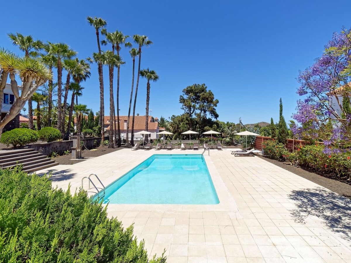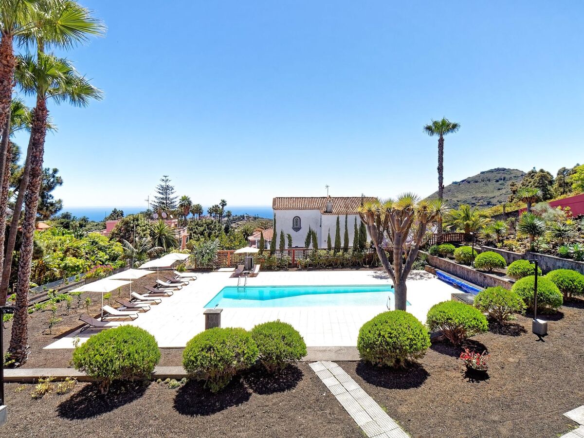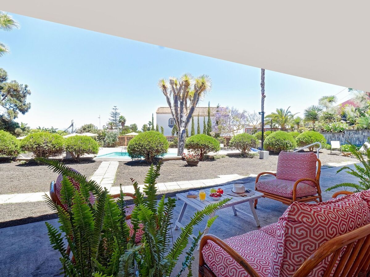 Vue sur la piscine et le jardin.