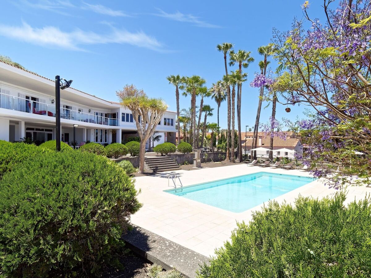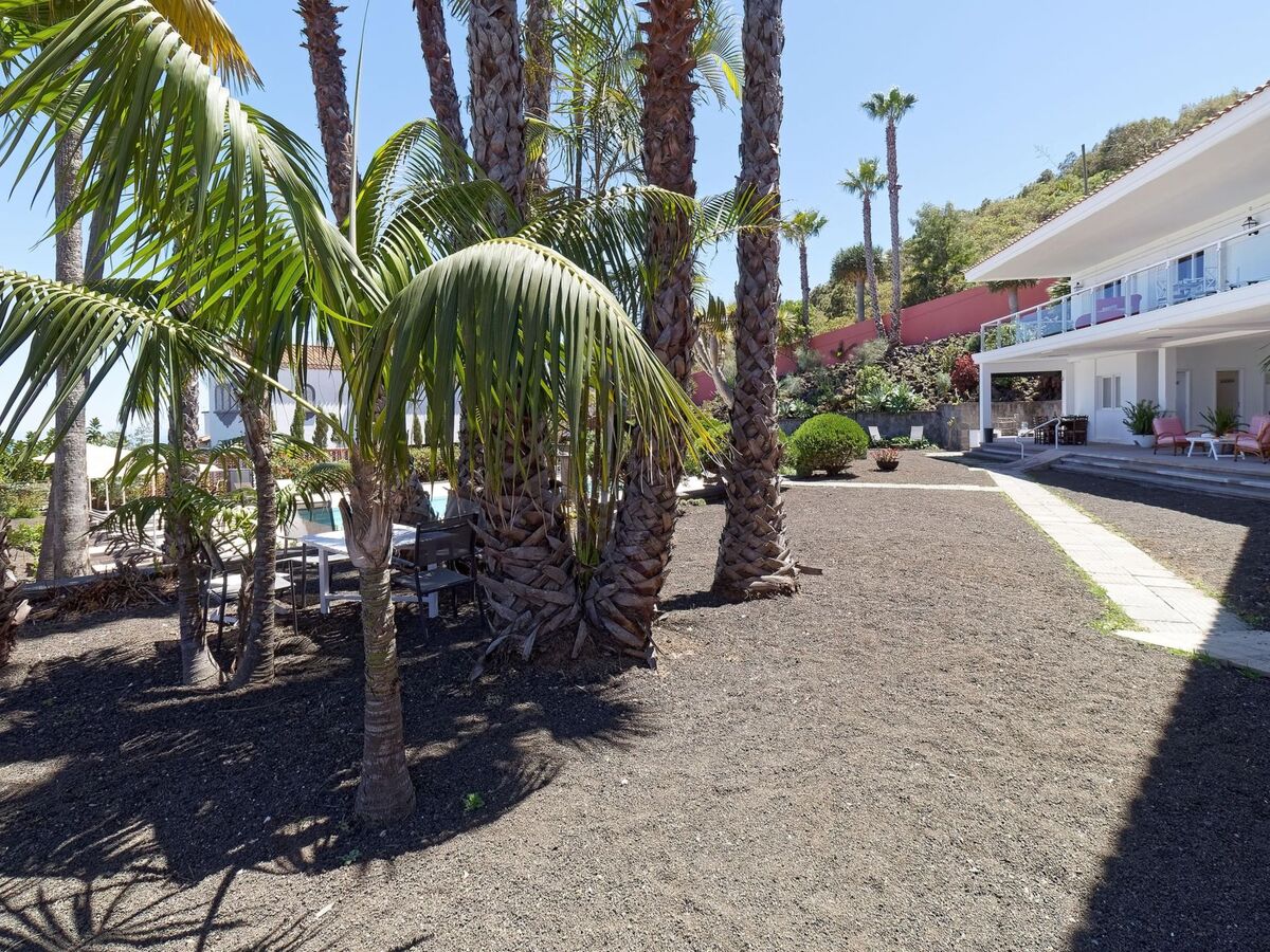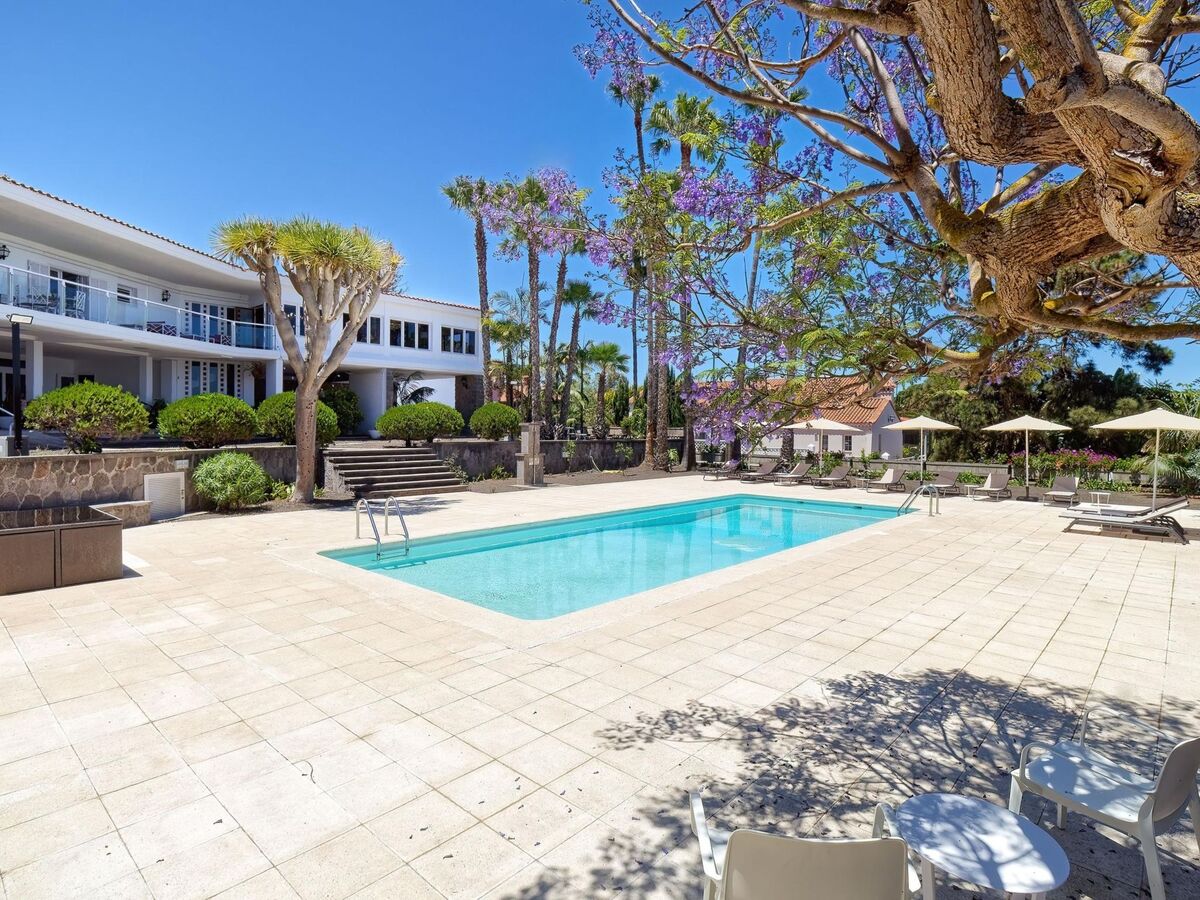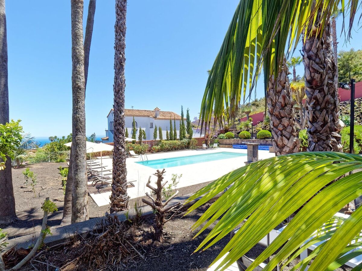 Vue sur la piscine et le jardin.