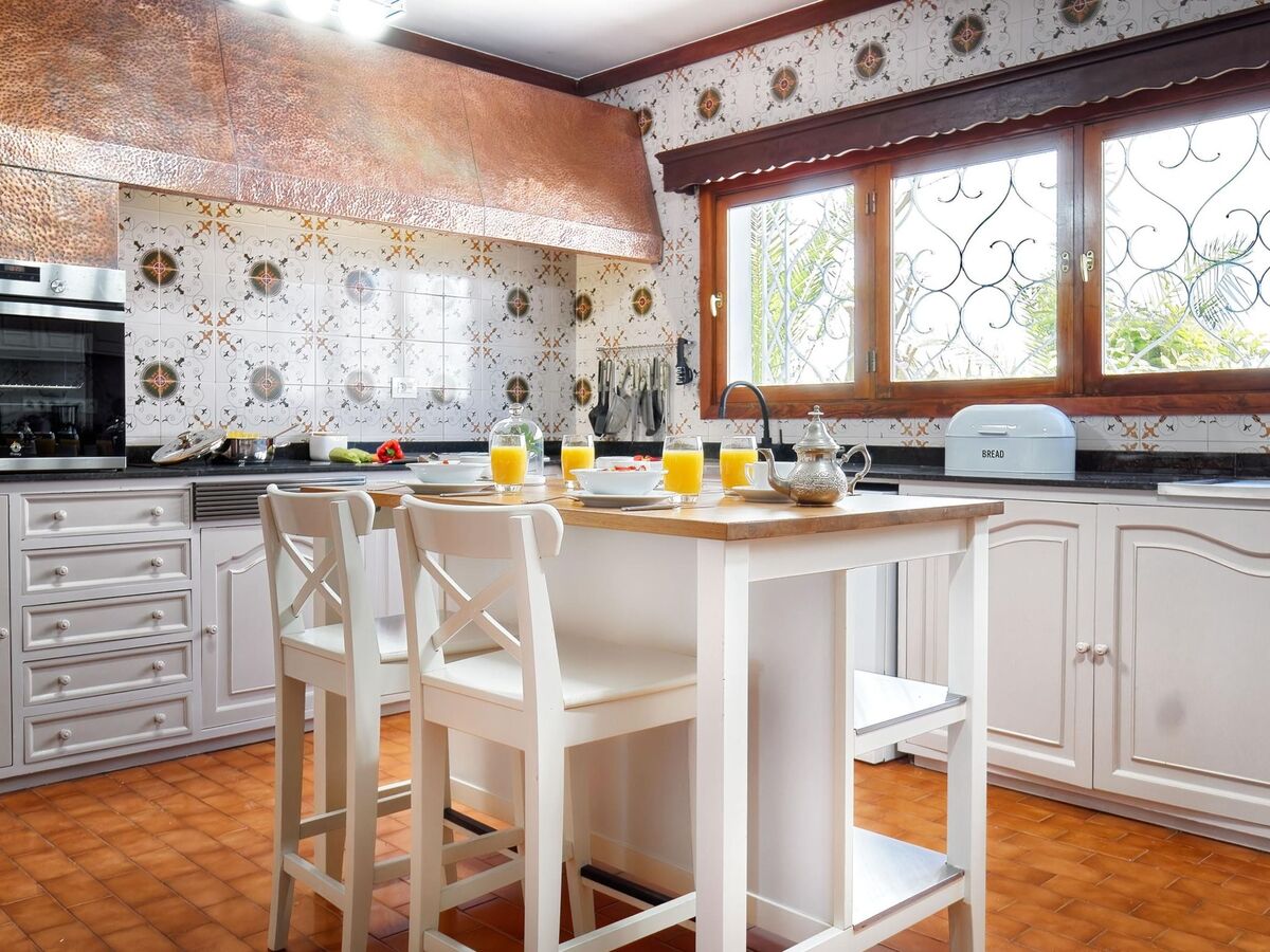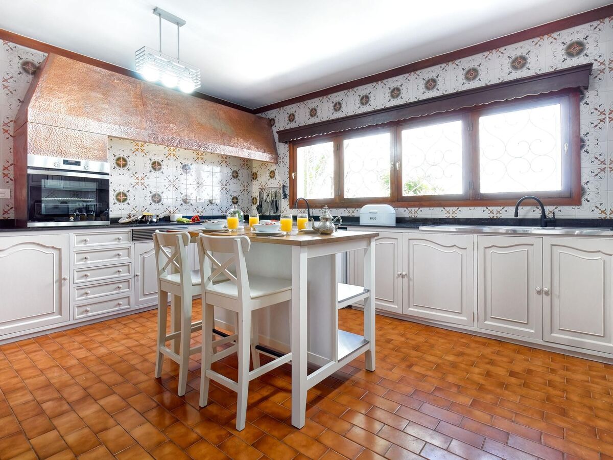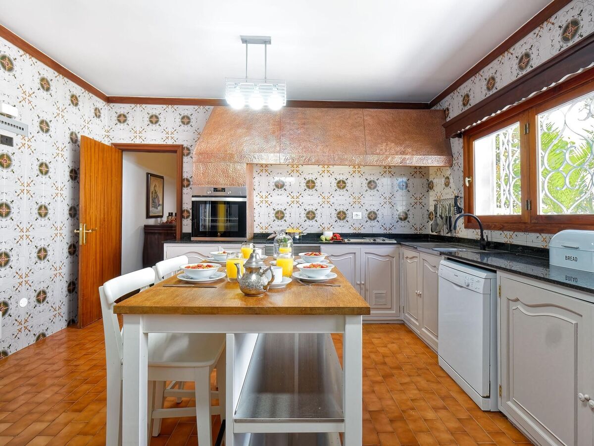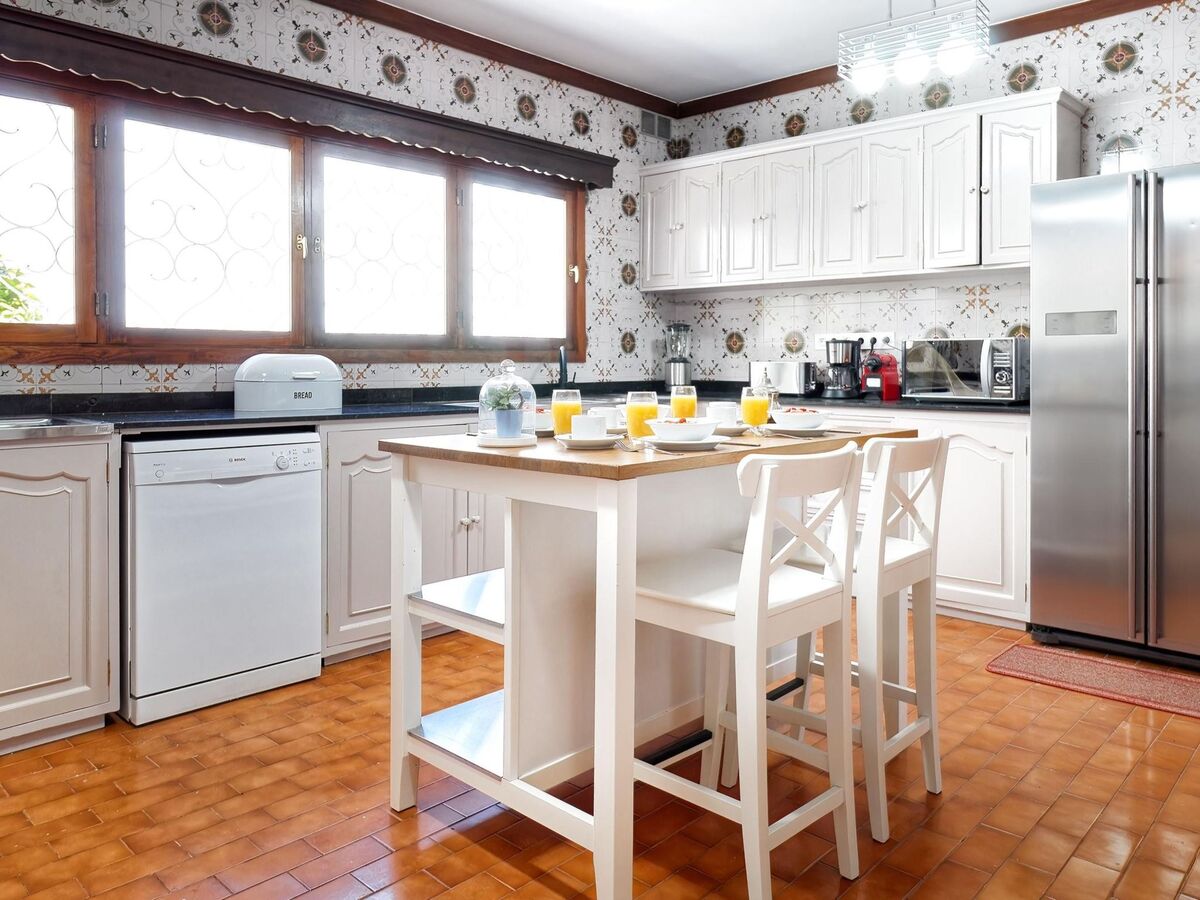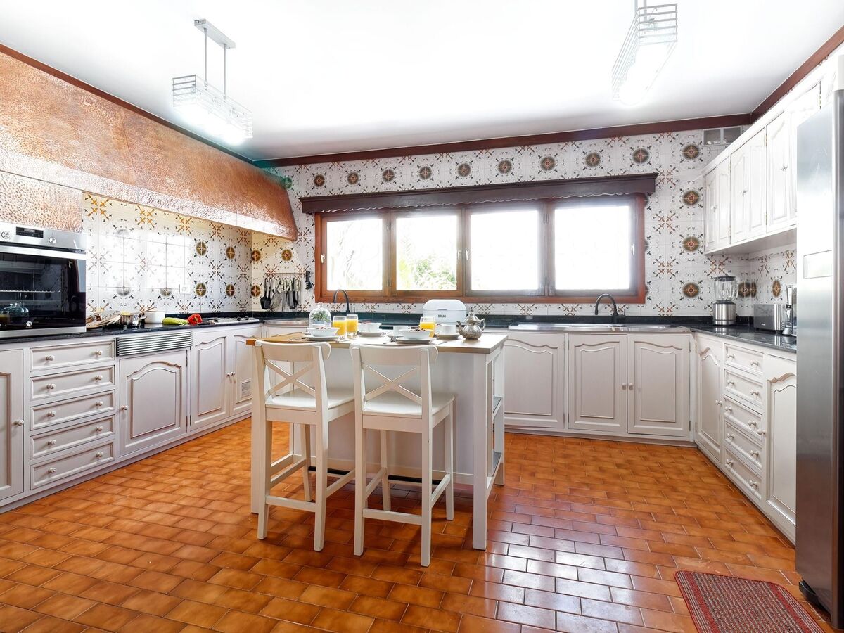 Cuisine (four, lave-vaisselle, 3 plaques vitrocéramiques, grille-pain, bouilloire électrique, micro-ondes, congélateur, cafetière électrique) avec table pour les repas.