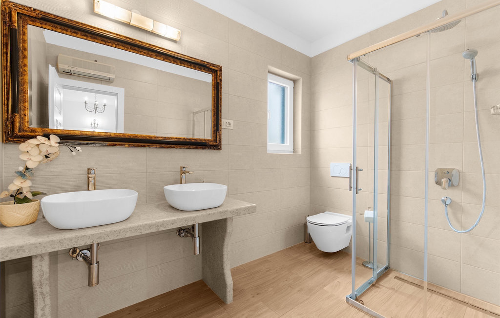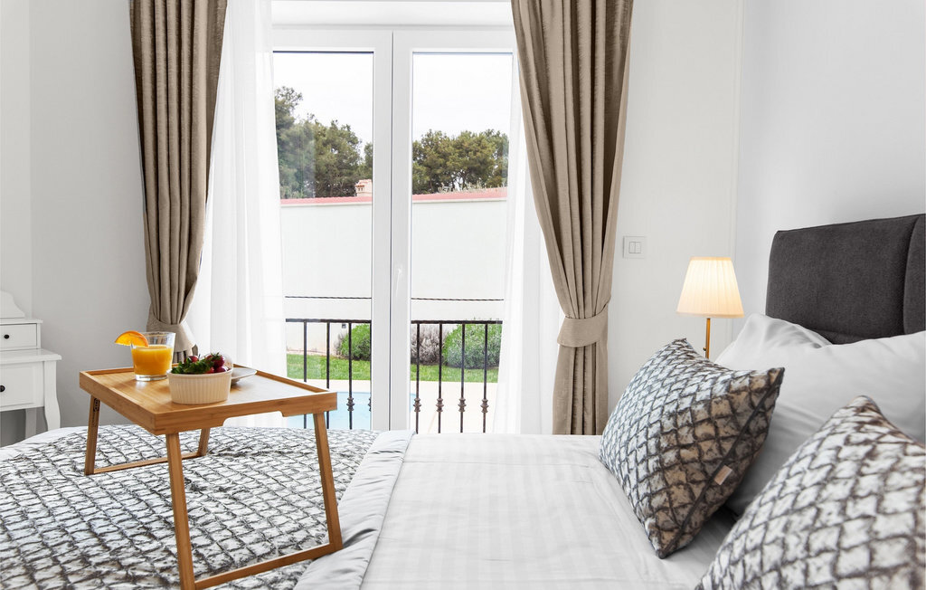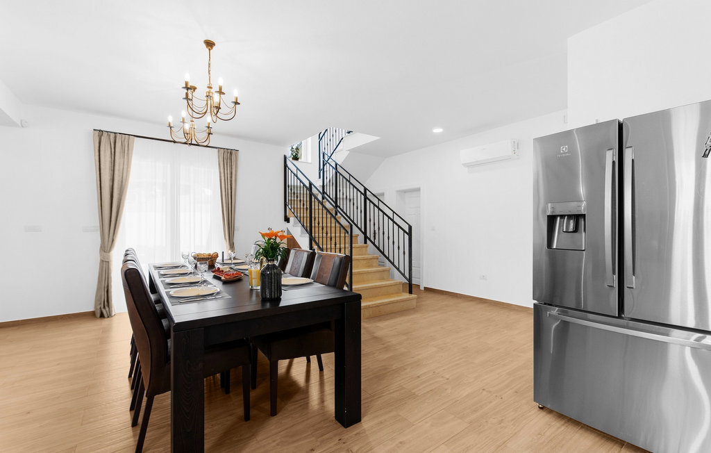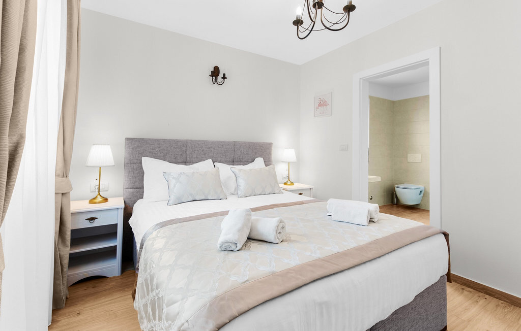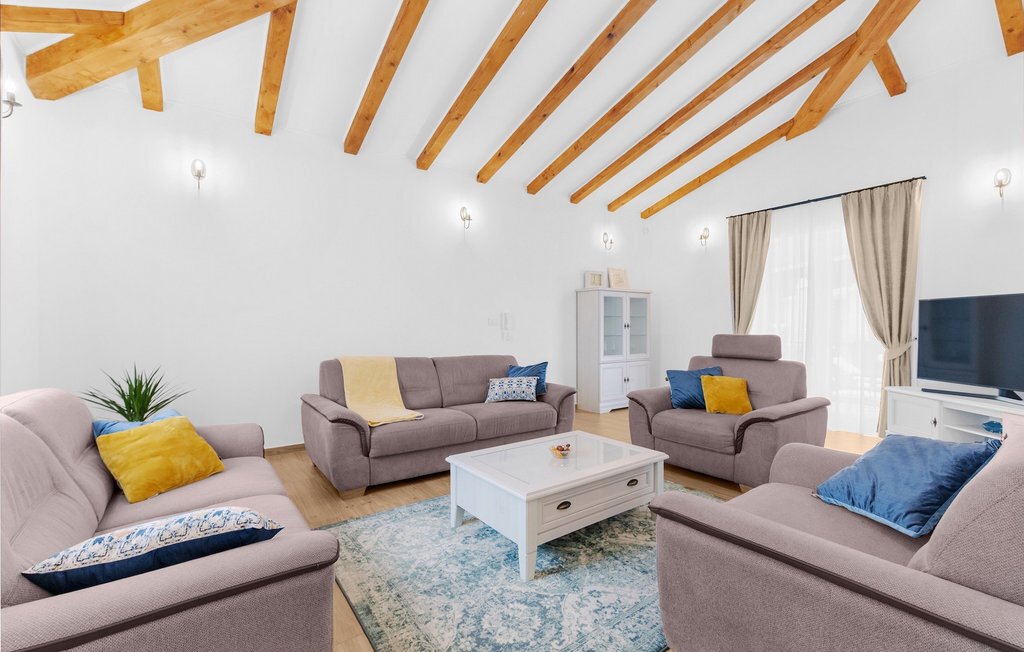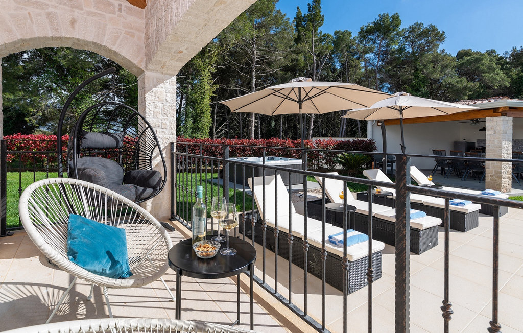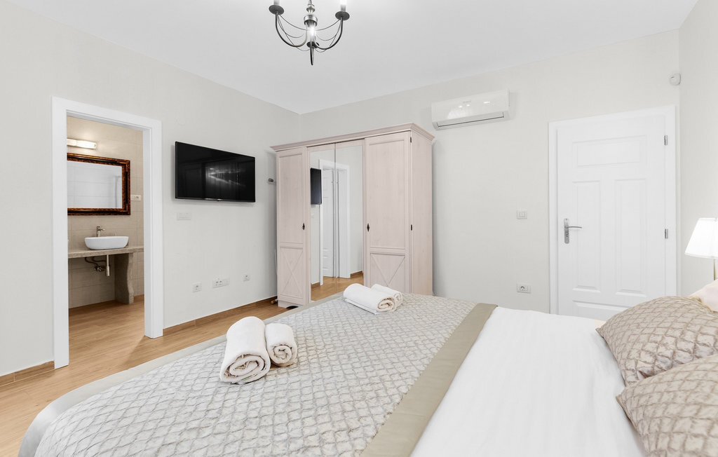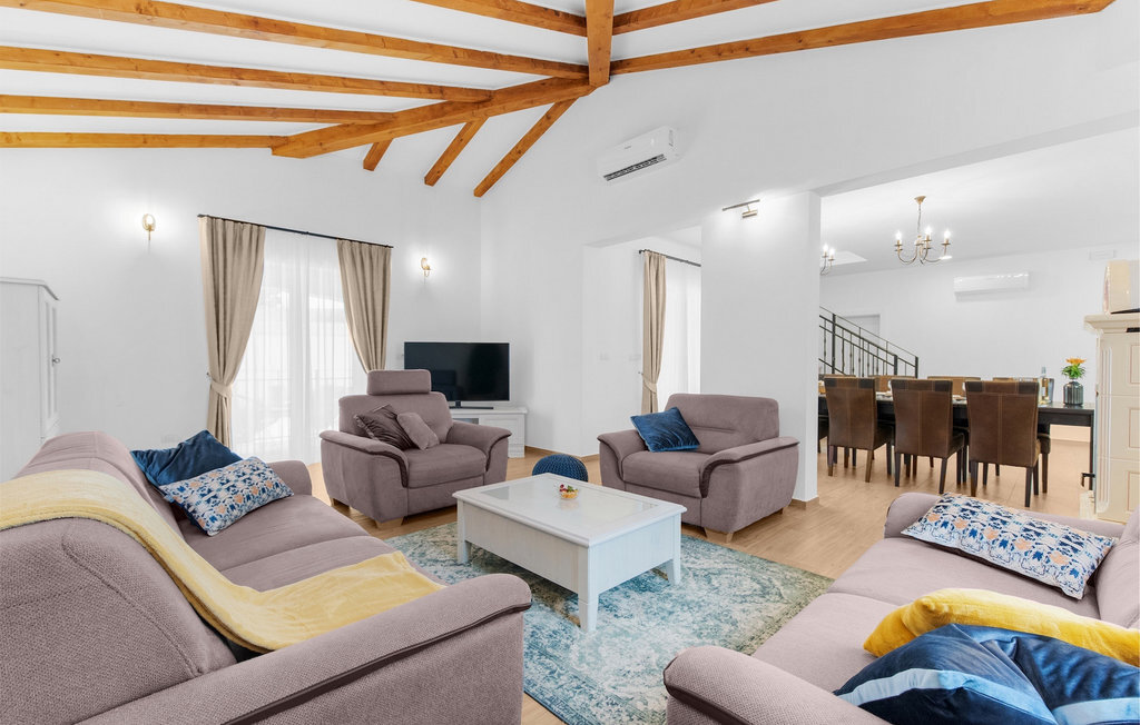 Depuis la terrasse, entrez dans le salon de la Villa LaDora et sentez-vous comme chez vous dans la salle de séjour lumineuse et ouverte avec un coin repas et une cuisine entièrement équipée. Deux chambres à coucher chics avec des lits doubles, chacune avec un lit supplémentaire et une salle de bain privée ainsi qu'un WC séparé complètent le rez-de-chaussée. L'étage supérieur est composé de deux autres chambres à coucher avec des lits doubles confortables et des salles de bain en suite. Toutes les chambres sont climatisées et équipées d'une télévision.