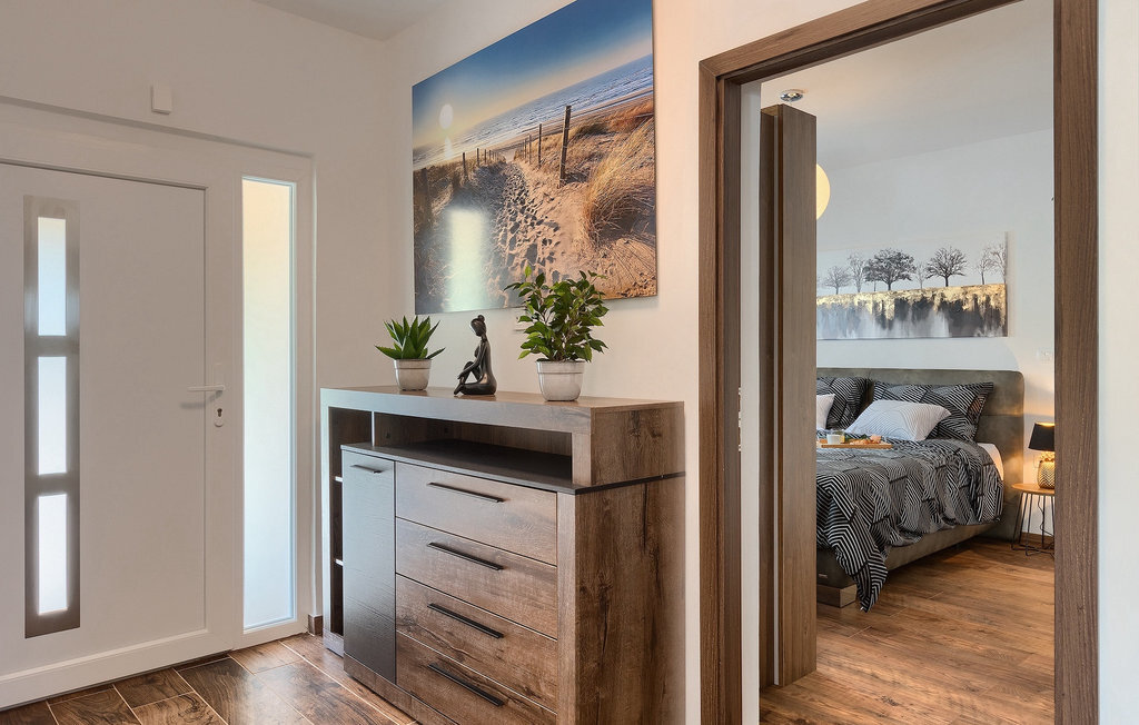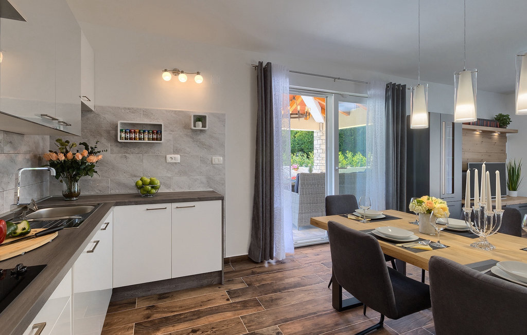 Dès que vous arriverez à la villa, vous serez attiré comme par magie par la magnifique piscine de 32m2 située dans le jardin de la villa. Rafraîchissez-vous dans l'eau fraîche bleu turquoise et détendez-vous sur l'une des chaises longues pendant que les enfants font de la balançoire ou sautent sur le trampoline. La terrasse couverte est l'endroit idéal pour passer des moments ensemble. Un barbecue au charbon de bois est à votre disposition pour régaler votre famille de toutes sortes de délices au gril. En entrant à l'intérieur de la Villa Elanna, vous découvrirez un salon moderne et lumineux ainsi qu'une cuisine entièrement équipée avec un coin repas. Au même niveau se trouvent également les deux chambres confortables avec des lits doubles. Les deux chambres ont leur propre salle de bain chic avec douche - votre espace bien-être personnel.