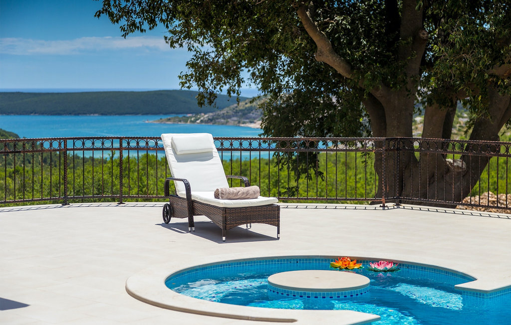 À l'extérieur, il y a une magnifique piscine avec des sièges intégrés (quand il fait trop chaud pour boire un verre en plein soleil). Peu importe où vous vous asseyez, vous vous tenez ou vous vous allongez, vos yeux apprécieront la vue magnifique sur la baie de Rasa. Cette vue étonnante rend chaque repas plus agréable, car vous avez à votre disposition un grand coin repas Al Fresco avec barbecue.