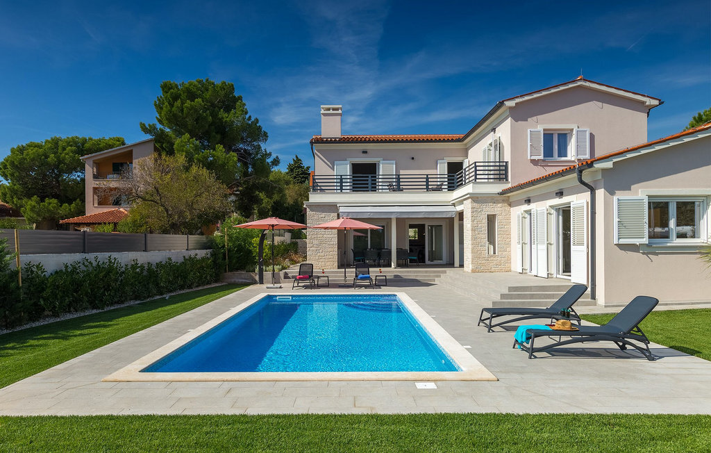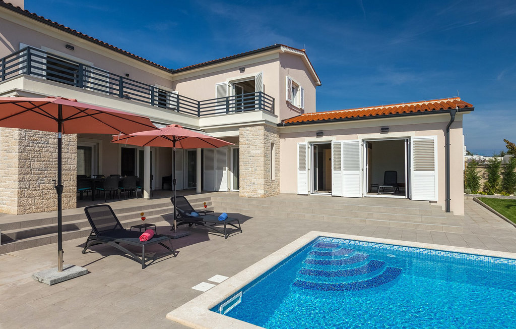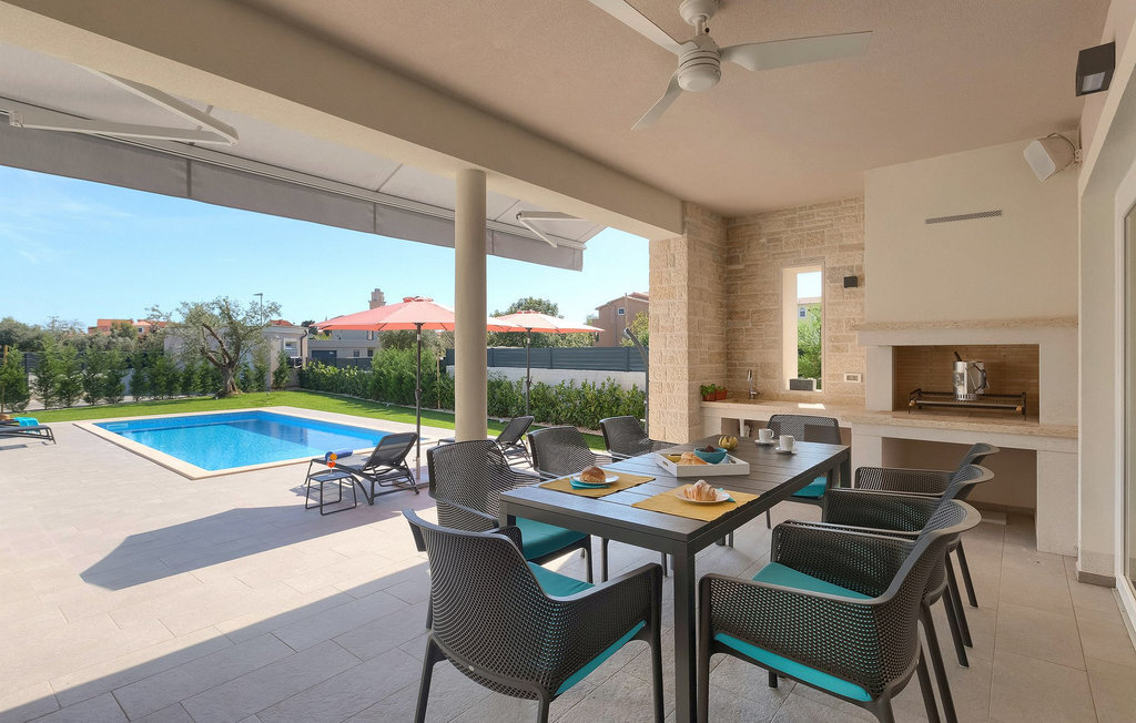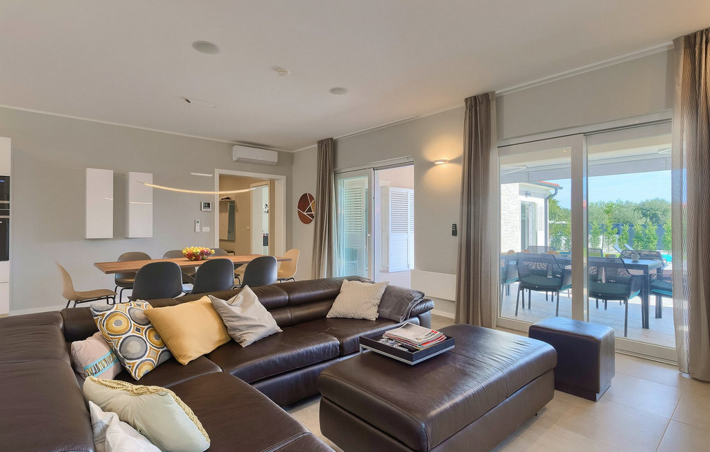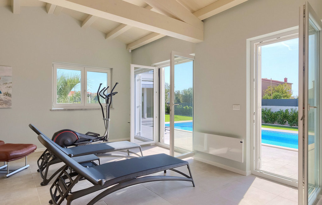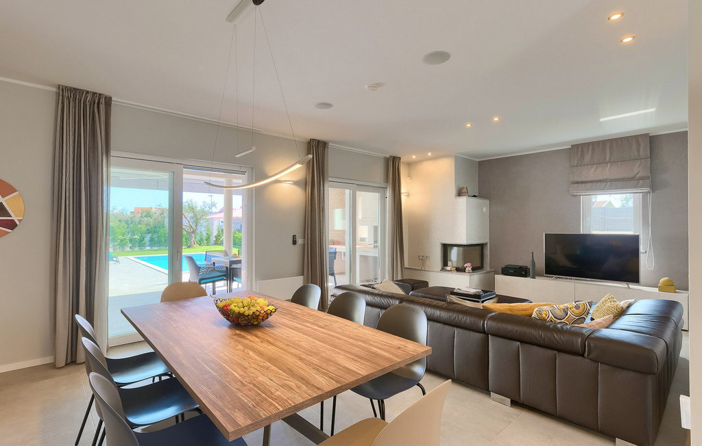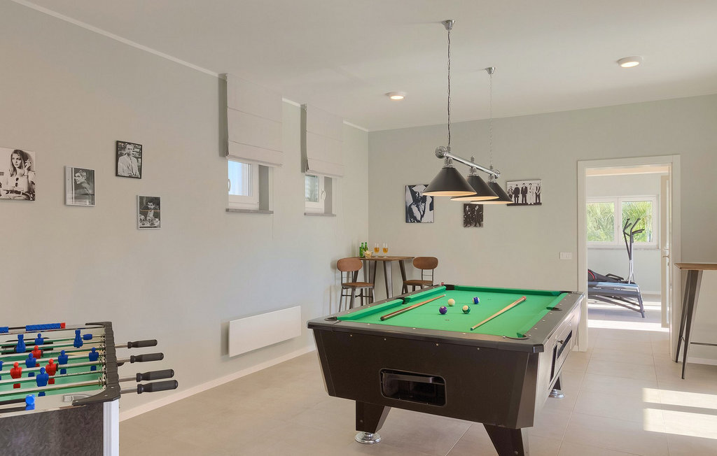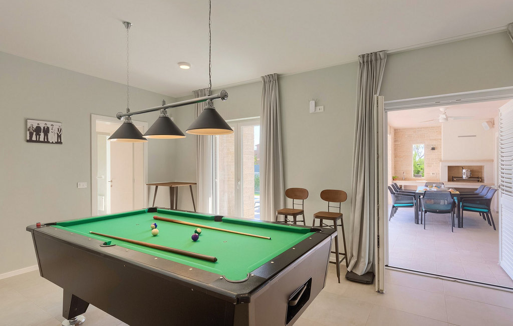 La villa est située sur un terrain de 1100 m2 entièrement clôturé et dispose d'une piscine privée accueillante, entourée d'agréables chaises longues. Une salle à manger extérieure avec un barbecue au charbon de bois et des toilettes extérieures séparées se trouvent dans le jardin. L'intérieur est magnifiquement conçu et offre plus qu'assez de confort pour un séjour reposant. Le rez-de-chaussée ouvert est divisé en un salon avec cheminée, télévision par satellite et chaîne stéréo, une salle à manger et une cuisine moderne entièrement équipée. Il y a également une pièce séparée dédiée uniquement au divertissement - une table de billard et un baby-foot sont à votre disposition. Une autre pièce est réservée à ceux qui veulent se faire plaisir - un sauna finlandais et une douche pour ceux qui veulent se détendre pendant les soirées fraîches, et l'espace fitness avec un cross trainer pour ceux qui veulent rester en forme même pendant les vacances.