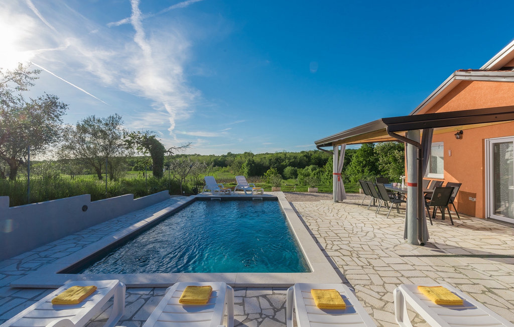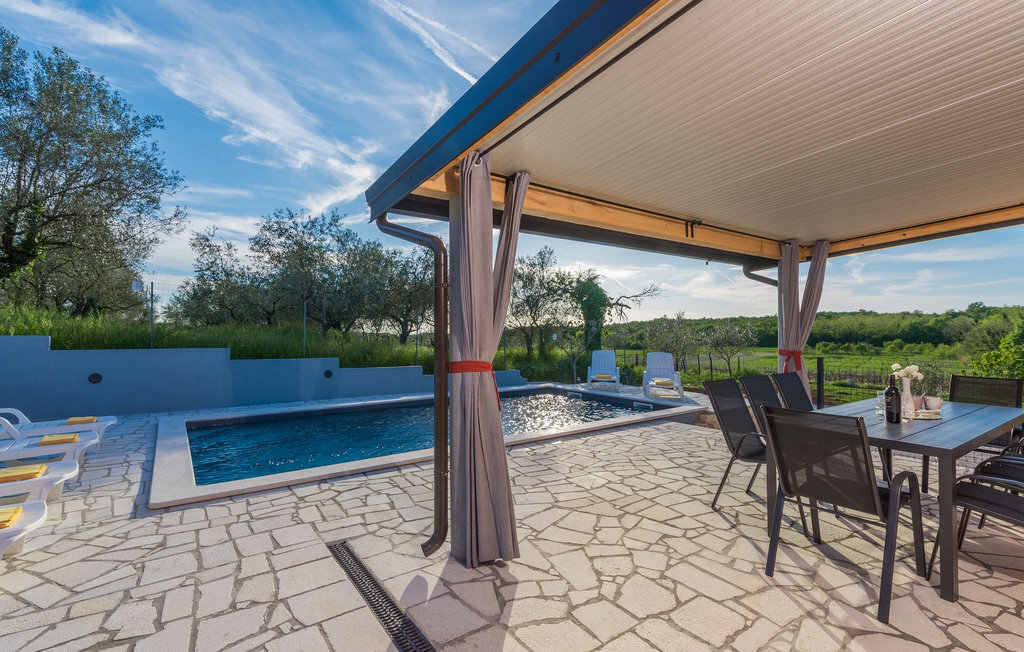 L'espace extérieur calme à côté de la belle piscine offre une détente totale pendant que vous nagez ou prenez un bain de soleil et que vous profitez de la situation tranquille de la villa au milieu de la nature. Il y a une belle salle à manger couverte en plein air à côté de la piscine avec une vue magnifique sur les environs, où vous pourrez déguster vos repas préparés sur le barbecue extérieur.