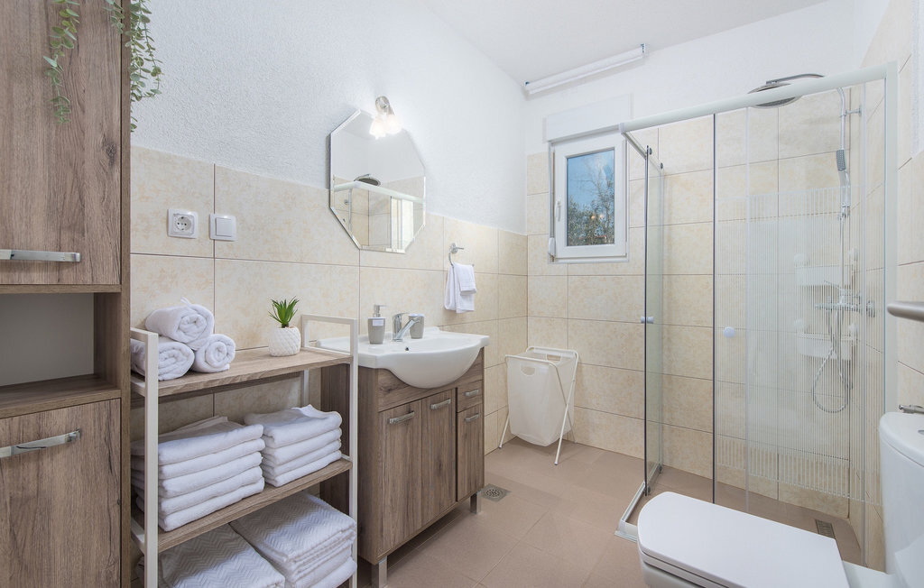 Comme il s'agit d'une maison de rez-de-chaussée, toutes les pièces de cette villa se trouvent de manière pratique sur un seul niveau. Les 3 chambres doubles sont aménagées avec charme et offrent un séjour confortable et un sommeil réparateur pendant vos vacances. Une possibilité de couchage pour l'hôte +1 se trouve sur le canapé-lit dans le salon. Une salle de bain avec cabine de douche est à votre disposition ainsi que des toilettes pour les invités.