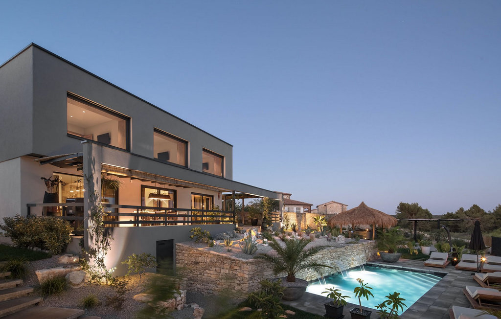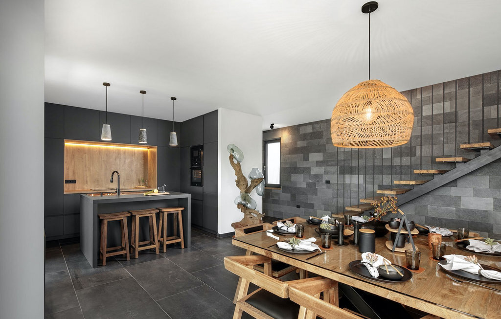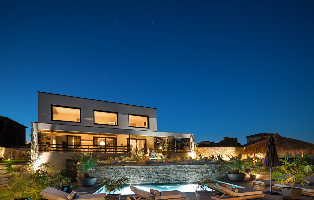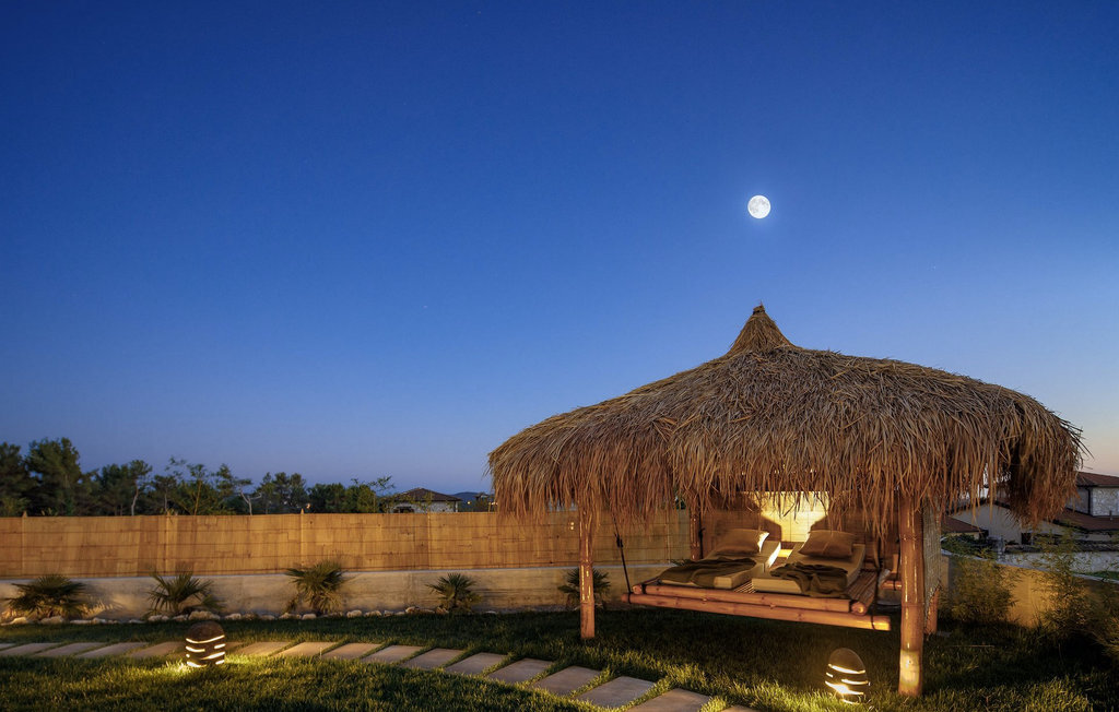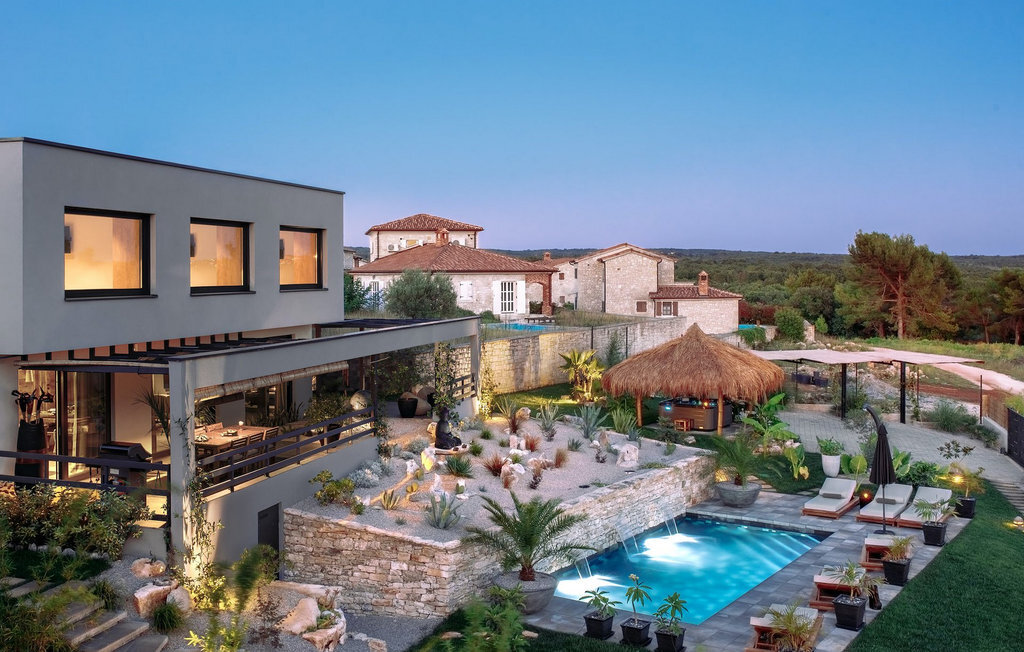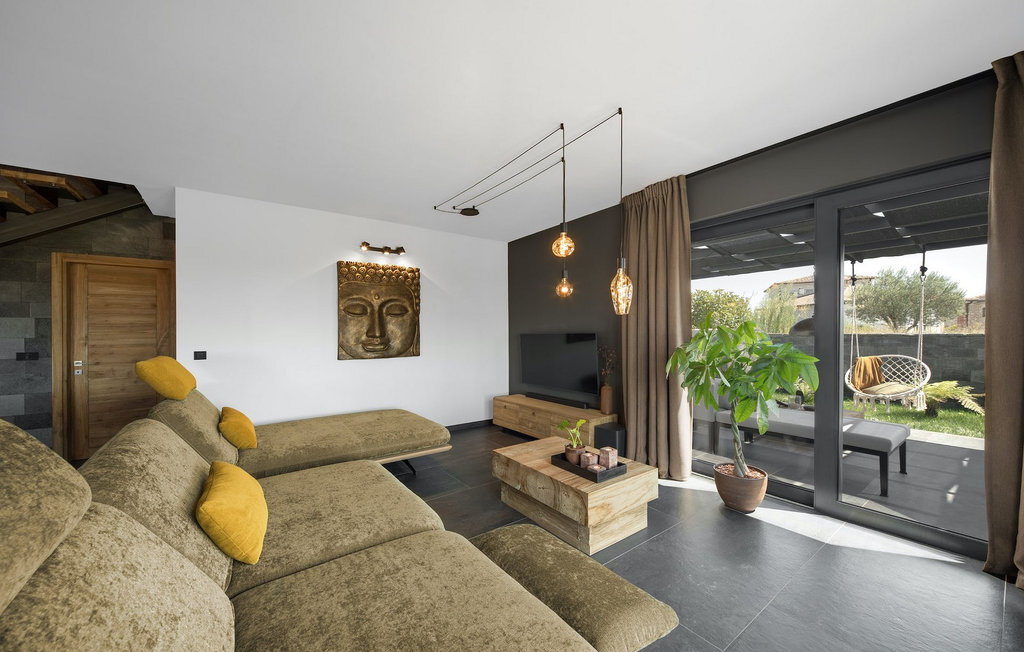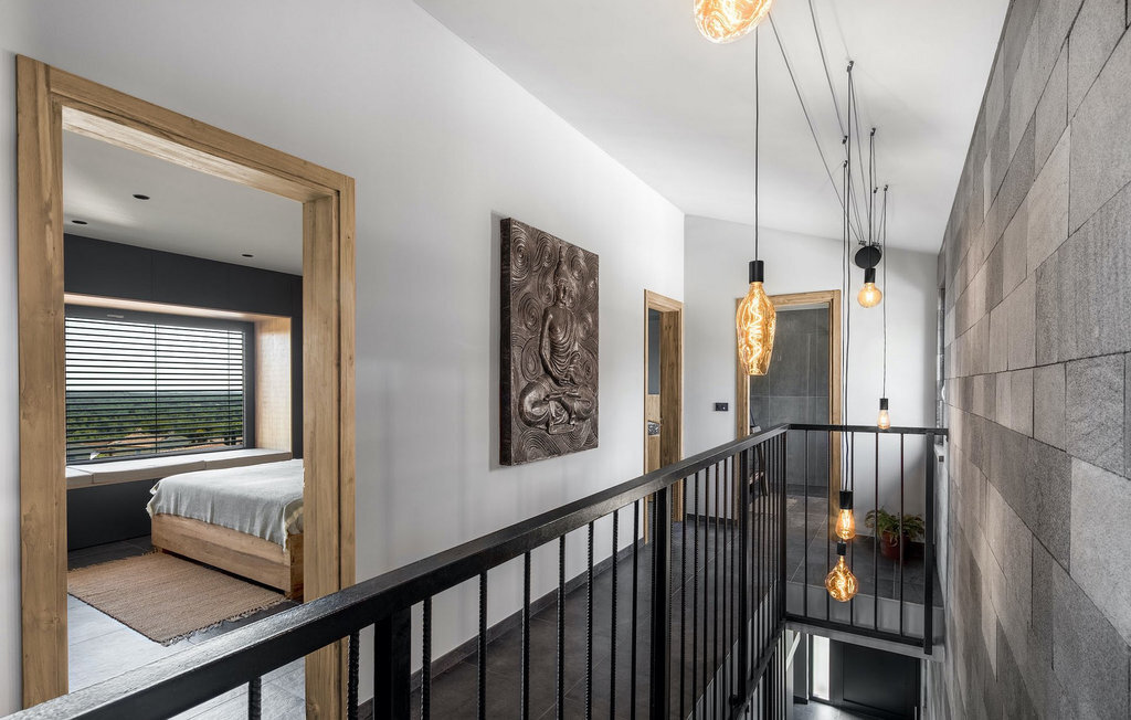 La villa Merapi est un mélange de design moderne, de nature et de spiritualité. La pierre volcanique noire, connue pour ses propriétés curatives et relaxantes, a été utilisée à la fois dans le design moderne de cette villa et dans le design de la piscine. Des meubles en bois faits à la main décorent cette villa avec des éléments naturels. Différentes espèces de plantes entourent la villa et créent une magnifique oasis pour des vacances reposantes. La villa est divisée en rez-de-chaussée et premier étage. Au rez-de-chaussée se trouve un espace ouvert avec un salon, une cuisine et une salle à manger, et au premier étage se trouvent trois chambres et deux salles de bain, dont l'une est une salle de bain en suite. L'intérieur de cette belle villa est décoré avec de nombreux détails naturels. La combinaison du bois et de la pierre donne à cette villa un aspect à la fois naturel et moderne, qui vous procurera un sentiment de tranquillité. Si vous êtes de ceux qui veulent se réveiller chaque matin avec une vue magnifique sur la nature depuis leur lit, la villa Merapi est l'endroit idéal pour vous. Les grandes baies vitrées des chambres à coucher offrent également un espace pour s'asseoir et s'allonger. Profitez ici, avec un bon livre, d'une vue à couper le souffle. La belle cour intérieure de la villa, aménagée avec soin et agrémentée de différentes plantes, décore la villa et crée une petite oasis. Rafraîchissez-vous dans la piscine privée avec cascades de massage. Si vous êtes amateur de jacuzzi, la villa propose un jacuzzi en plein air sous un pavillon en bambou. Pour une ambiance supplémentaire, il y a une grande balançoire pour deux personnes, où vous pouvez savourer une boisson rafraîchissante tout en regardant le ciel étoilé. Plongez dans un lieu exotique au cœur de l'Istrie avec un environnement idyllique et détendez-vous du stress quotidien à la Villa Merapi.La Villa Merapi offre à ses hôtes non seulement une ambiance magnifique avec un intérieur moderne, mais elle se trouve également dans un environnement idyllique avec un jardin aménagé de rêve. La villa est située dans le village de Sv. Lovrec, à 15 km de la mer, à proximité de la ville de Porec et de ses jolies plages de galets. Visitez le célèbre canal de Lim, qui n'est qu'à 30 minutes en voiture, et explorez cette magnifique région naturelle. Des restaurants et des cafés se trouvent à Sveti Lovrec, à 200 mètres de la villa. Si vous avez besoin d'acheter de la nourriture, les magasins locaux ne sont qu'à 500 mètres de la villa, ce qui vous permet de les atteindre facilement à pied. L'emplacement idyllique de la Villa Merapi ravira tous les visiteurs. Réservez cette superbe villa et profitez de l'environnement istrien à couper le souffle.