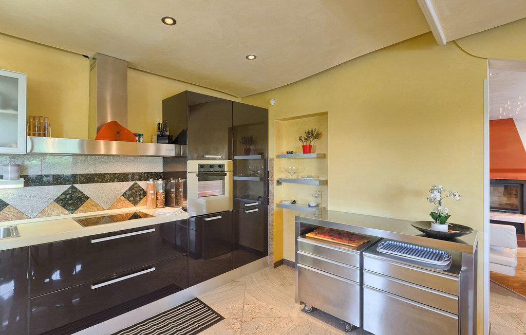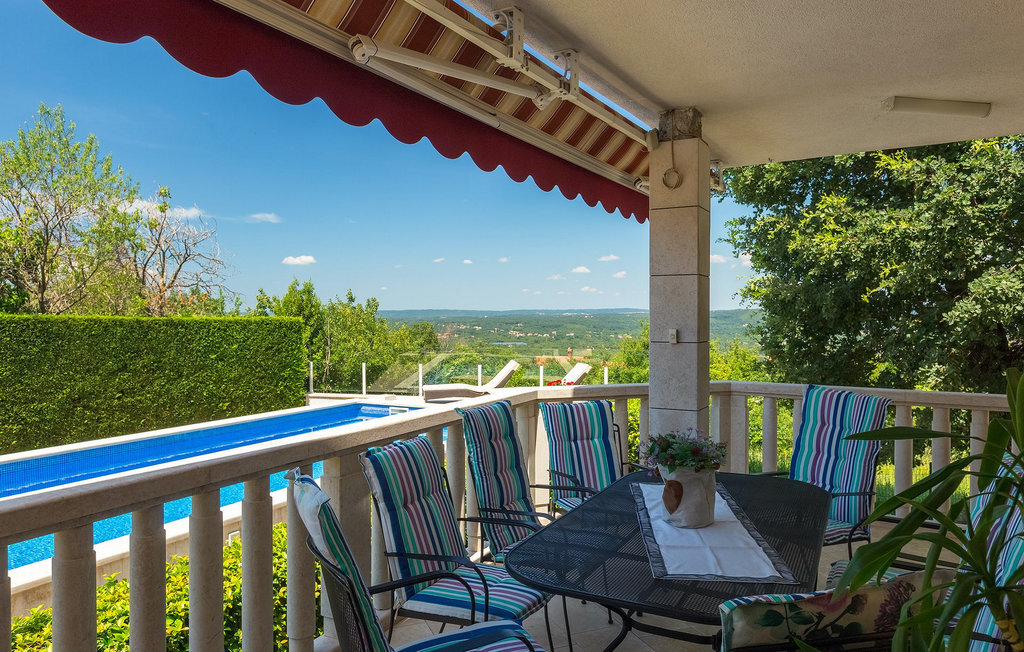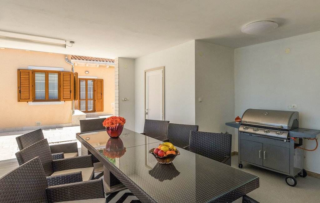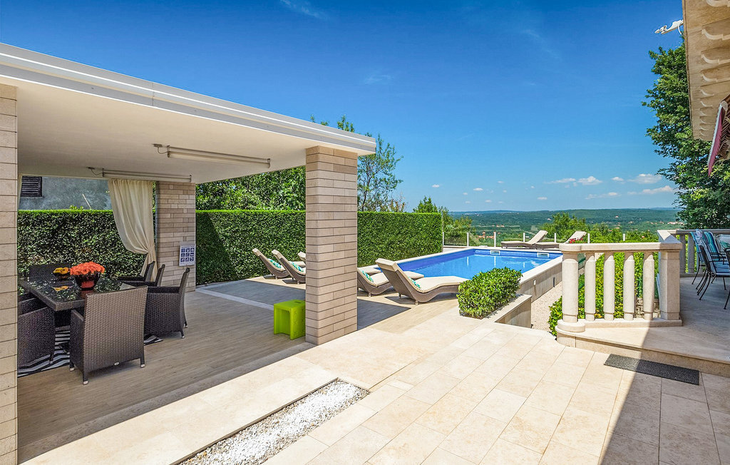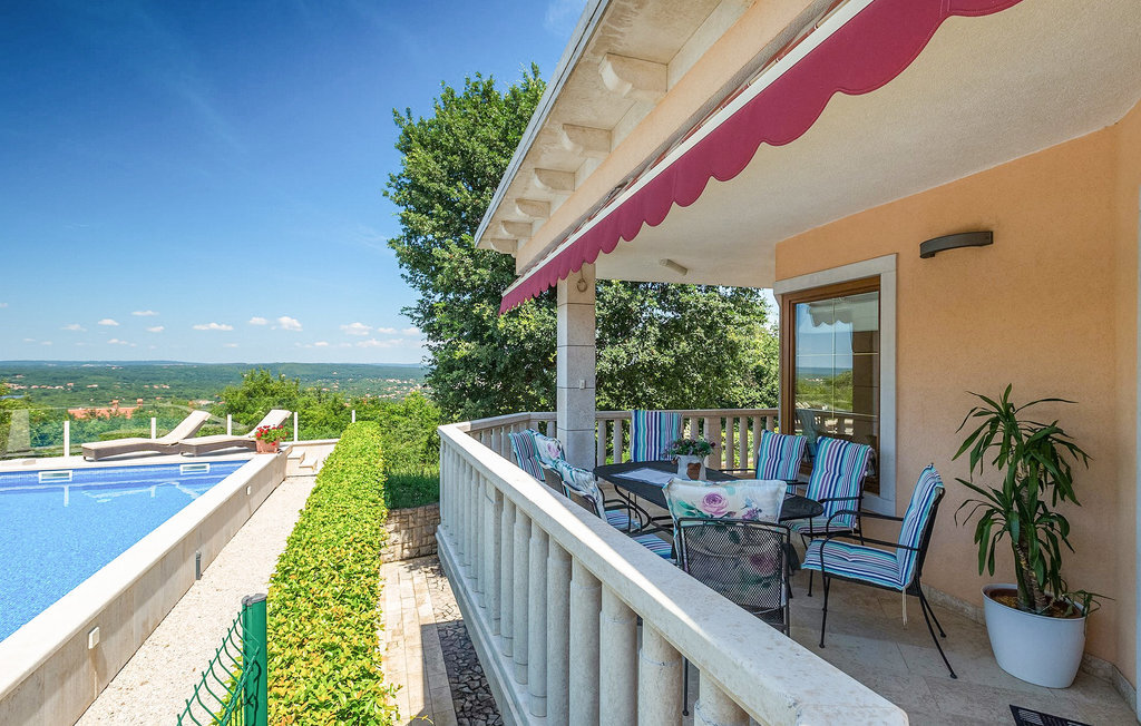 Le rez-de-chaussée se compose de 3 chambres (2 doubles et une simple), d'un grand salon élégant avec cheminée et accès direct à la terrasse avec vue sur la piscine, ainsi que d'une salle à manger et d'une autre cuisine entièrement équipée et de 2 salles de bains. L'escalier intérieur vous mène au premier étage où se trouve la cinquième chambre (double), y compris un canapé supplémentaire, et une salle de bain ensuite. Cette chambre dispose d'un balcon d'où vous pouvez profiter d'une vue sur la piscine et les environs. La piscine accueillante avec une vue magnifique sur les environs invite à prendre un bain de soleil ou à nager. L'espace repas en plein air sur la terrasse couverte à l'extérieur du salon, vous permet de profiter d'une belle vue pendant vos repas en famille, préparés sur un barbecue à gaz. Il y a une salle de bain extérieure supplémentaire entièrement équipée, comme extension de la terrasse couverte.