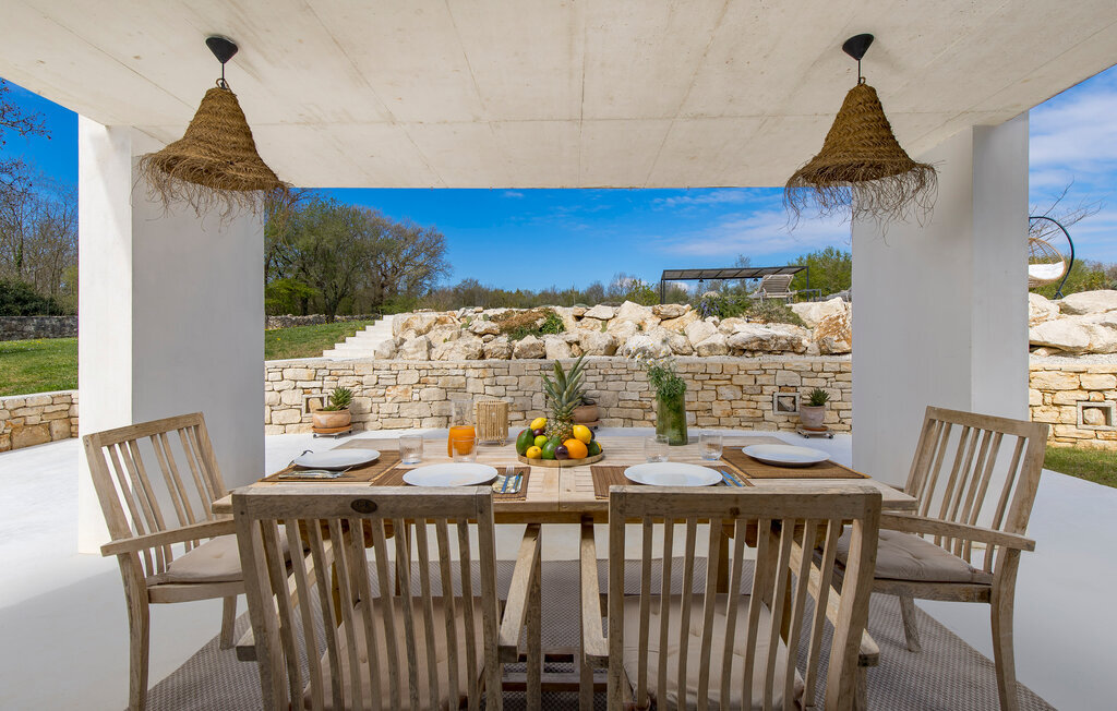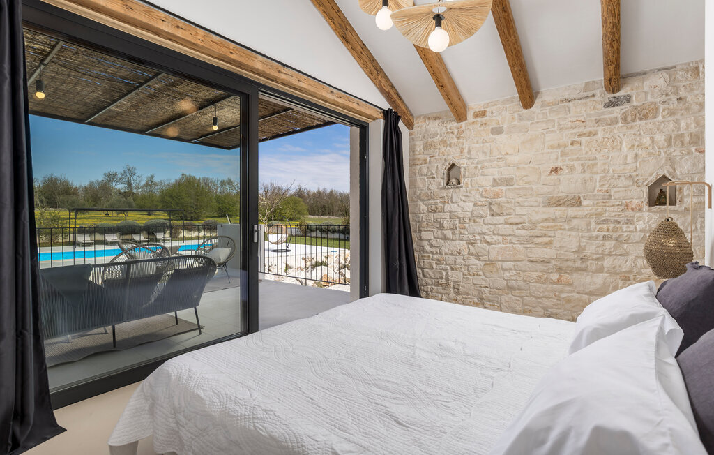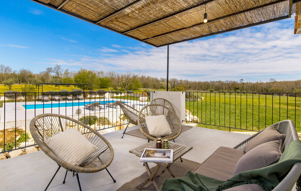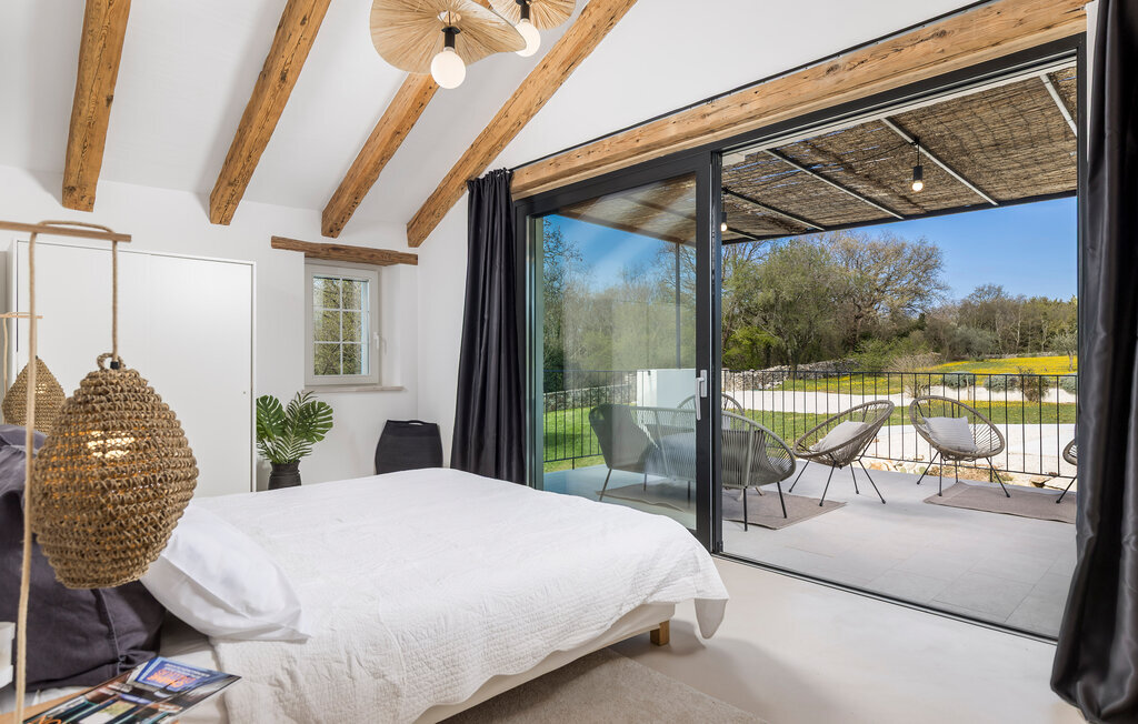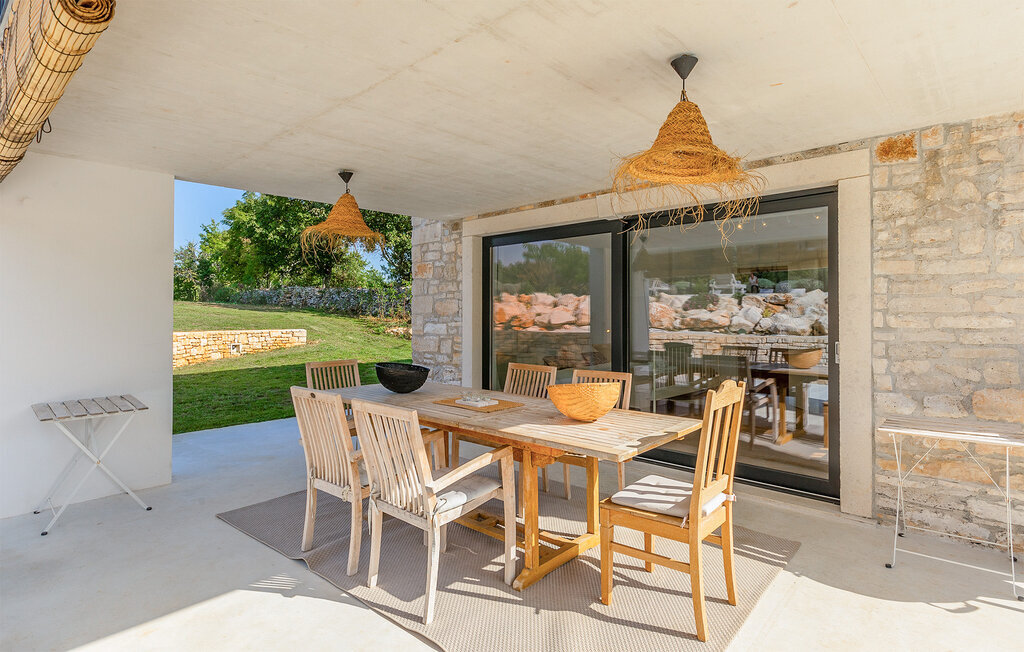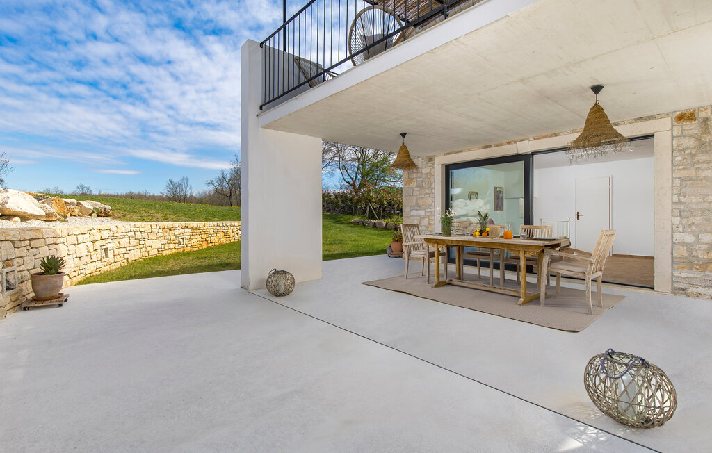 La terrasse couverte moderne du premier étage offre une vue magnifique sur le champ et ses magnifiques oliviers. En outre, la chambre à coucher du rez-de-chaussée et la chambre à coucher supérieure avec la terrasse ont de très grandes parois vitrées qui renforcent le sentiment de vivre à l'extérieur et la lumière naturelle. Le soir, il est agréable de profiter de l'environnement magnifiquement éclairé sous un ciel étoilé magique. Avec la Villa Natura, vous êtes en pleine nature, mais pas trop loin de la grande ville la plus proche - la ville côtière la plus proche est Porec - à seulement 20 minutes en voiture.