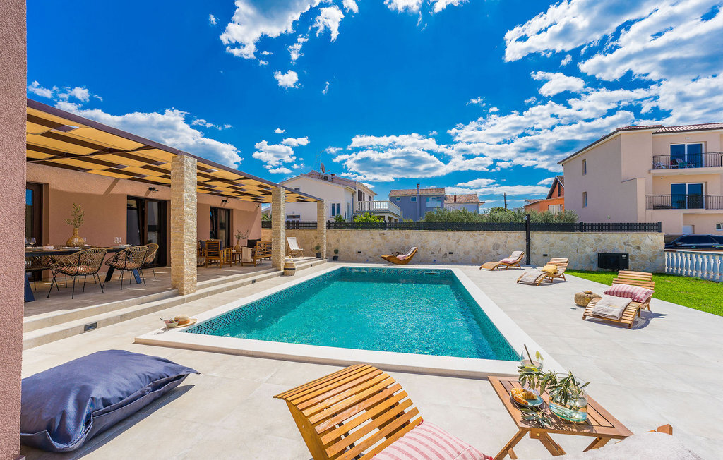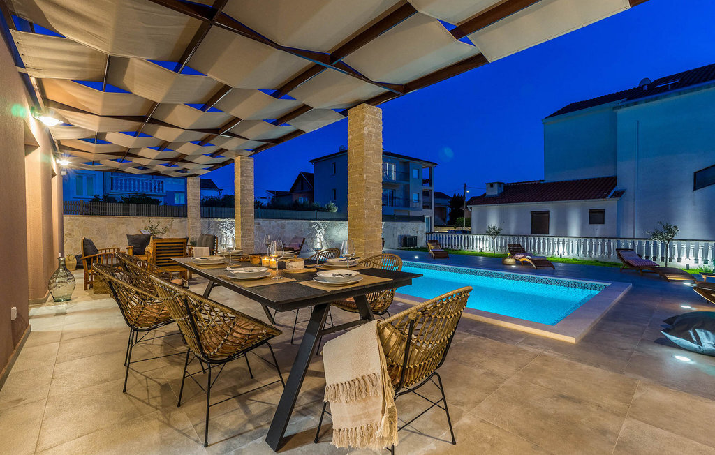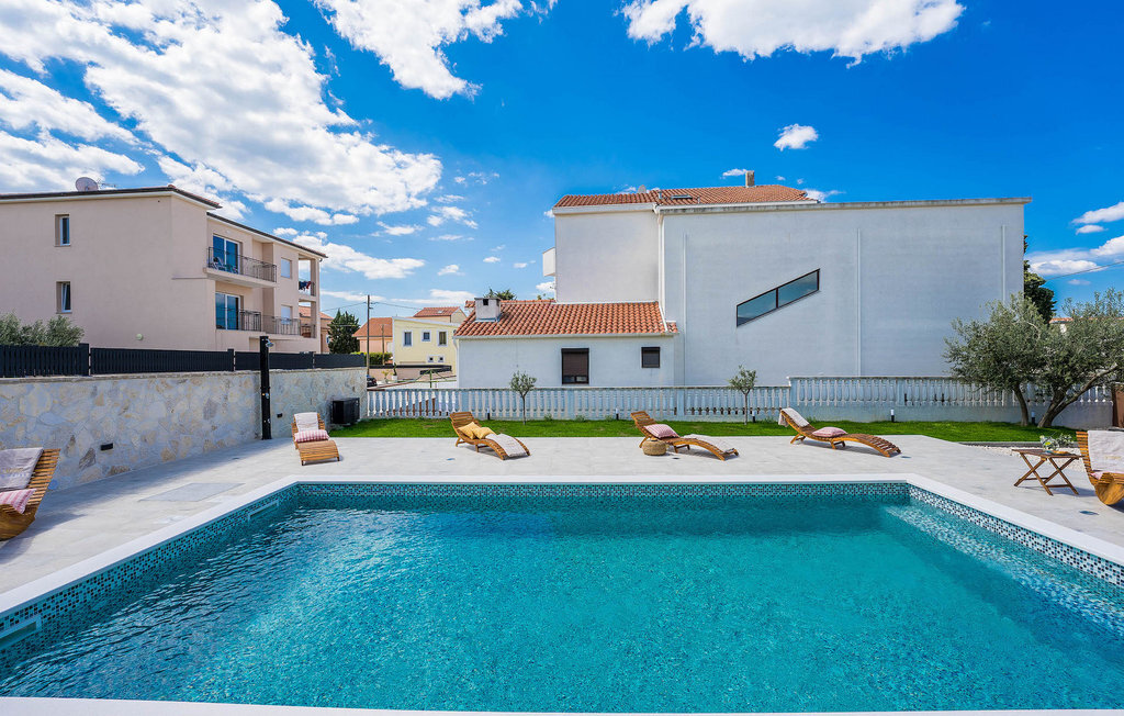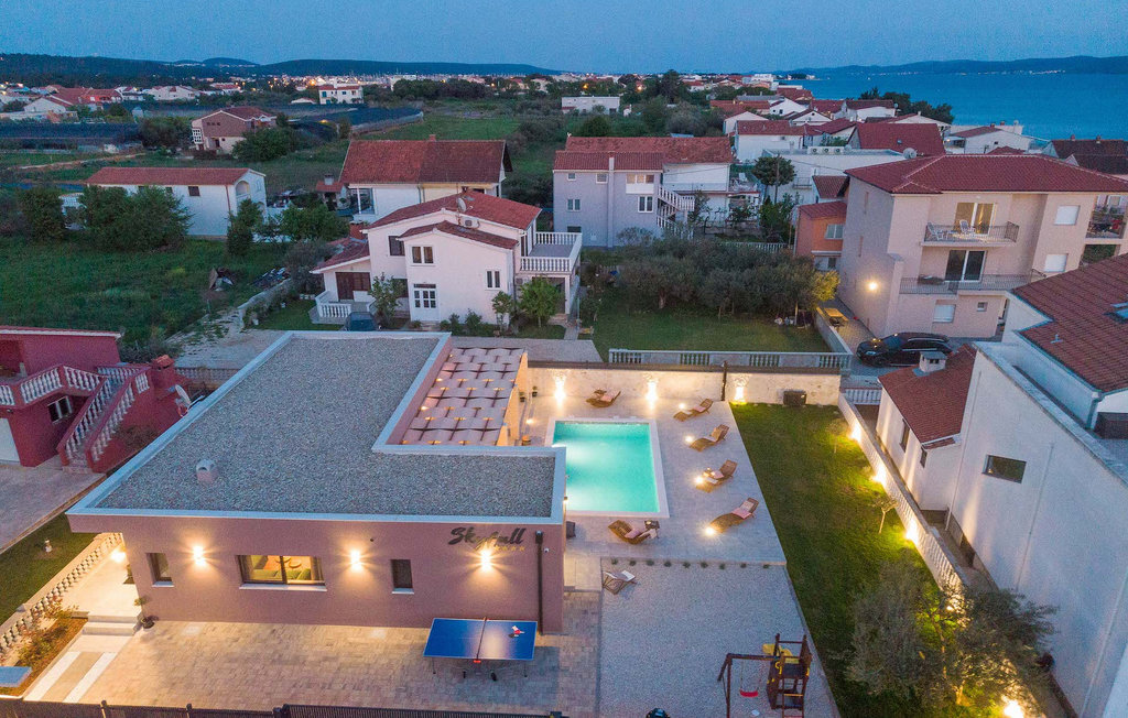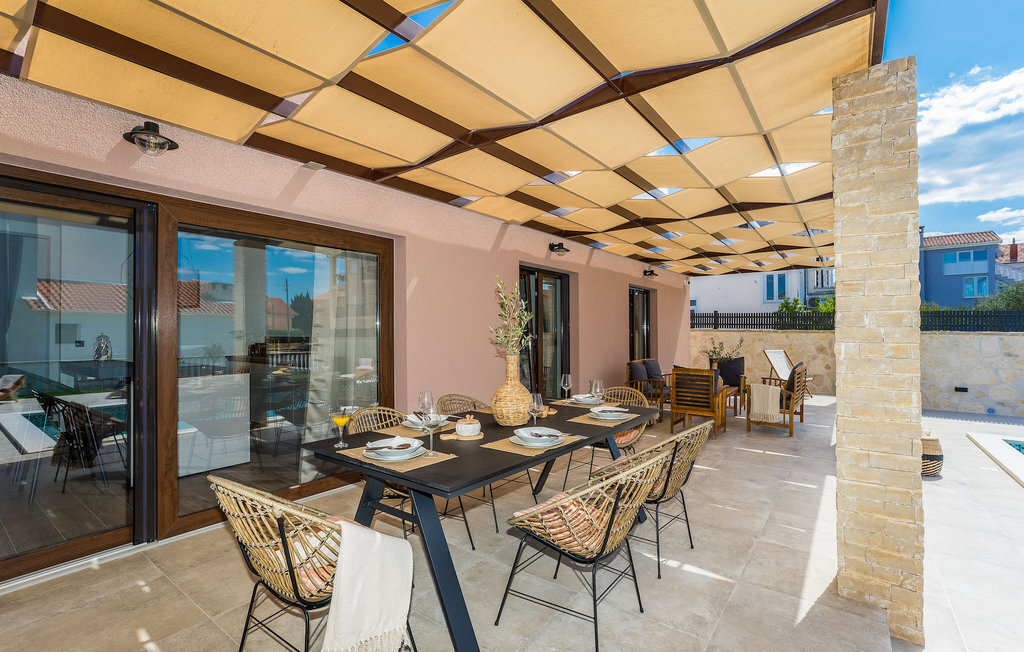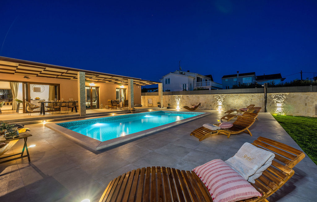 La magnifique villa Skyfall se trouve dans la petite ville côtière de Bibinje, à une courte distance en voiture de Zadar. La villa dispose de 3 chambres bien équipées et peut accueillir jusqu'à 6 personnes. Le rez-de-chaussée ouvert se compose d'une cuisine entièrement équipée, d'un salon confortable avec canapé et télévision et d'un coin repas, l'endroit idéal pour des dîners agréables avec votre famille. Les trois chambres à coucher disposent d'un lit double boxspring et d'une salle de bain privée avec douche. L'espace extérieur est le fleuron de la villa. Si vous souhaitez passer vos vacances au soleil, vous trouverez devant la villa une belle et grande piscine privée dans laquelle vous pourrez vous rafraîchir lors des chaudes journées d'été. L'espace piscine est équipé de chaises longues confortables, l'endroit parfait pour se détendre et lire votre livre préféré. À quelques pas de là se trouve une terrasse couverte avec un coin salon. La villa dispose d'une aire de jeux pour enfants où vos enfants pourront s'amuser pendant que vous préparez de délicieux repas sur le barbecue au charbon de bois. La villa est idéale pour les familles ou les groupes à la recherche de vacances reposantes à deux pas de la mer.La villa moderne Skyfall est située dans la petite ville côtière de Bibinje, à quelques minutes en voiture de Zadar. La villa est idéalement située pour une série d'excursions. À quelques pas de la villa se trouve la plage, qui convient à tous les âges. Nous vous recommandons également de visiter les îles voisines comme Ugljan, Paman et le parc national de Kornati et de découvrir les baies pittoresques et les plus belles plages de l'Adriatique. Zadar vous séduira surtout par sa riche histoire. Promenez-vous dans les ruelles étroites de la ville et visitez les nombreuses galeries et boutiques où vous pourrez acheter des souvenirs faits main. L'attraction incontournable de cette ville est l'orgue de mer unique et la Salutation au soleil, d'où vous pourrez admirer le plus beau coucher de soleil du monde. Toutes les installations nécessaires, comme les magasins et les restaurants, sont accessibles à pied.
