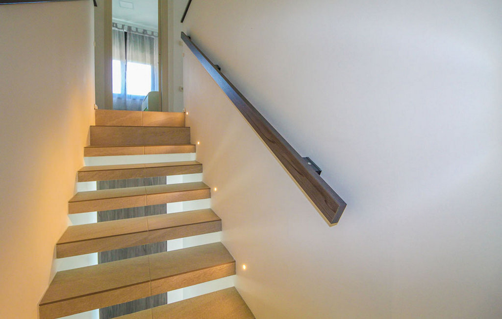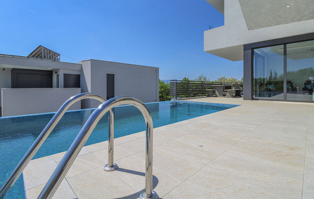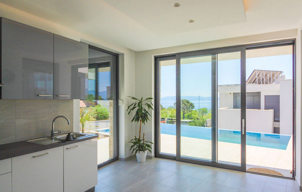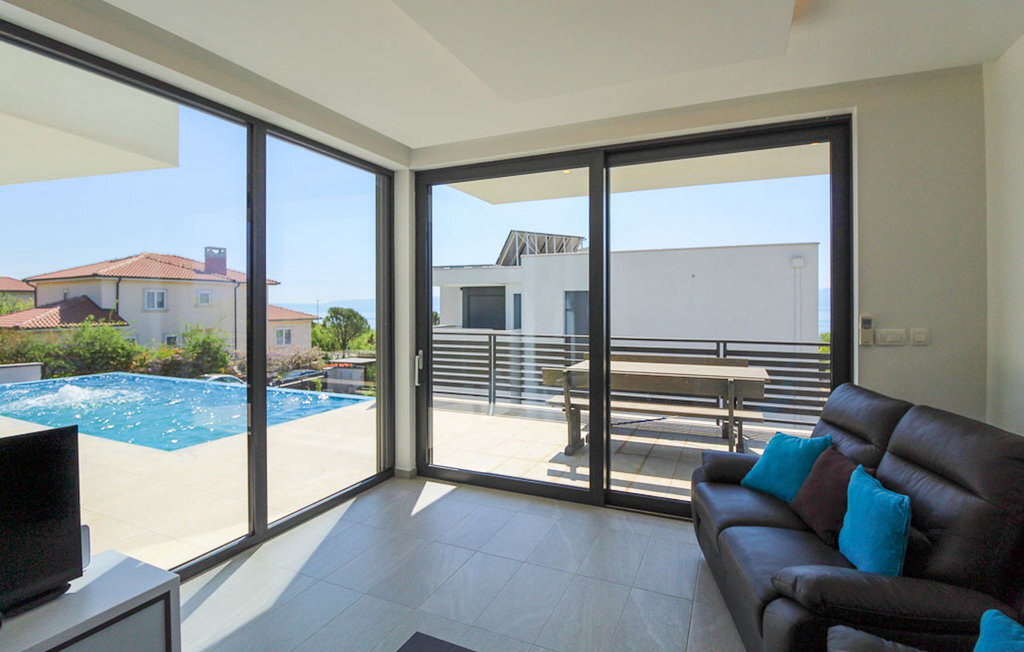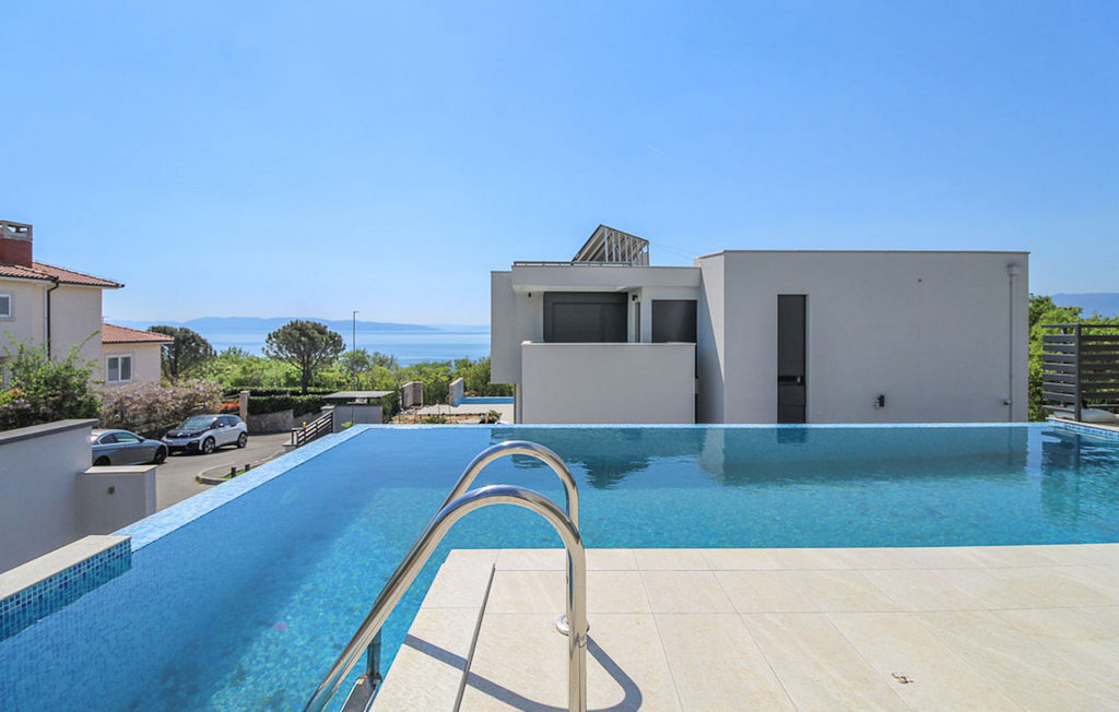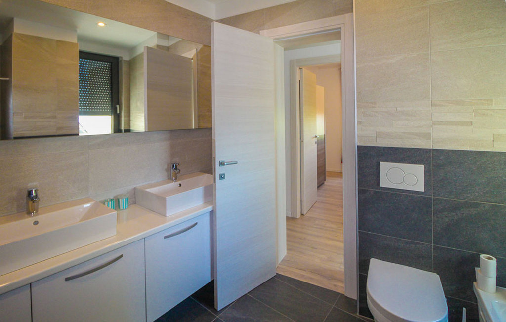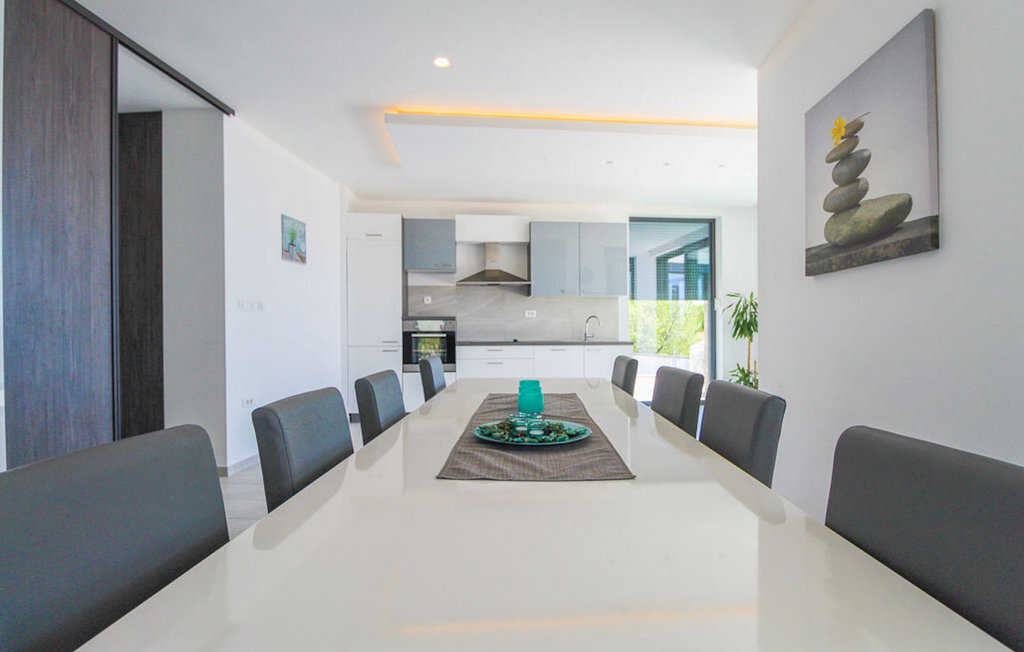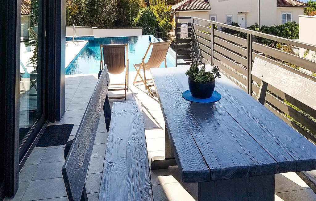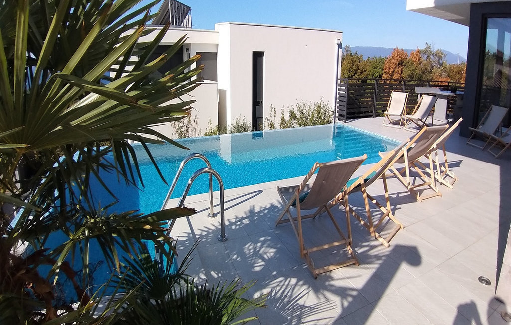 Le plus grand appartement s'étend sur deux étages et peut accueillir jusqu'à huit personnes. Au rez-de-chaussée se trouve le point de rencontre convivial de la villa - le grand et lumineux salon avec cuisine ouverte et coin repas. Ici, vous pouvez vous détendre et savourer les délicieux plats préparés dans la cuisine moderne entièrement équipée. Les portes vitrées de la cuisine et du salon donnent accès à l'extérieur. Là, une luxueuse piscine à débordement les attend, avec un petit plus. Le geyser dans le sol produit des fontaines puissantes et gâte vos pieds et vos jambes avec un massage. La grande salle à manger en plein air est idéale pour passer des soirées relaxantes en bonne compagnie. Vous pouvez y terminer la journée avec une vue sur la mer. Vous pouvez vous détendre dans un total de quatre chambres à coucher lumineuses et confortables au premier étage. Deux d'entre elles ont même leur propre balcon orienté vers la mer. Au total, trois chambres disposent de lits doubles confortables et une chambre d'un lit simple et d'un lit supplémentaire. Au premier étage se trouvent également, outre les toilettes pour invités au rez-de-chaussée, deux belles salles de bains. Une buanderie et un autre petit balcon complètent le plus grand appartement de la Villa Albi.