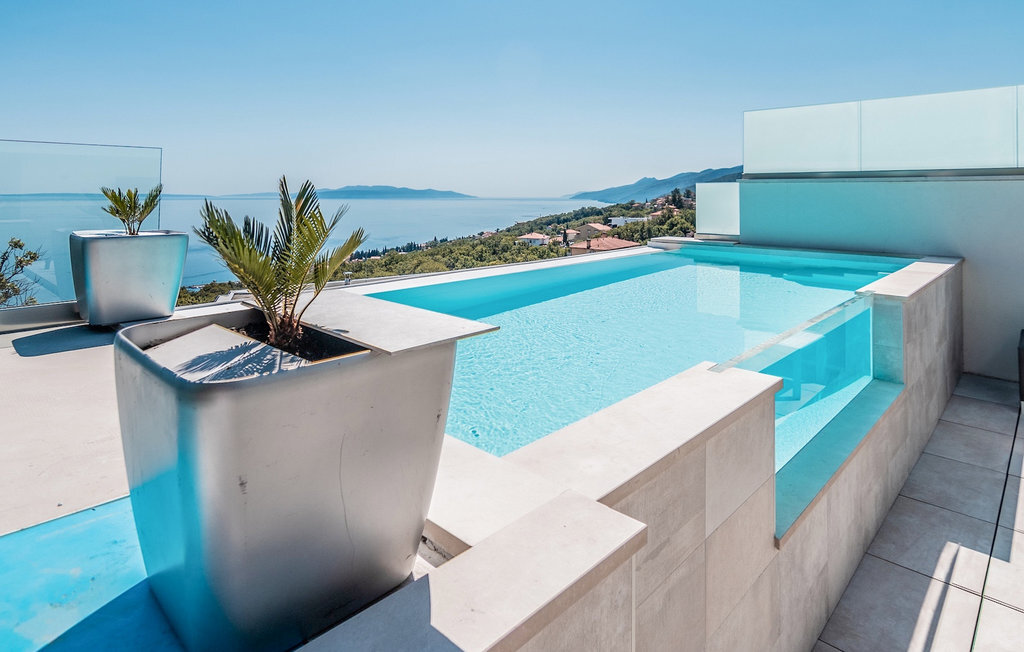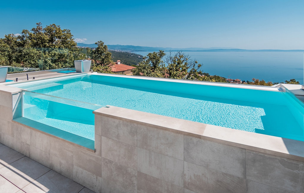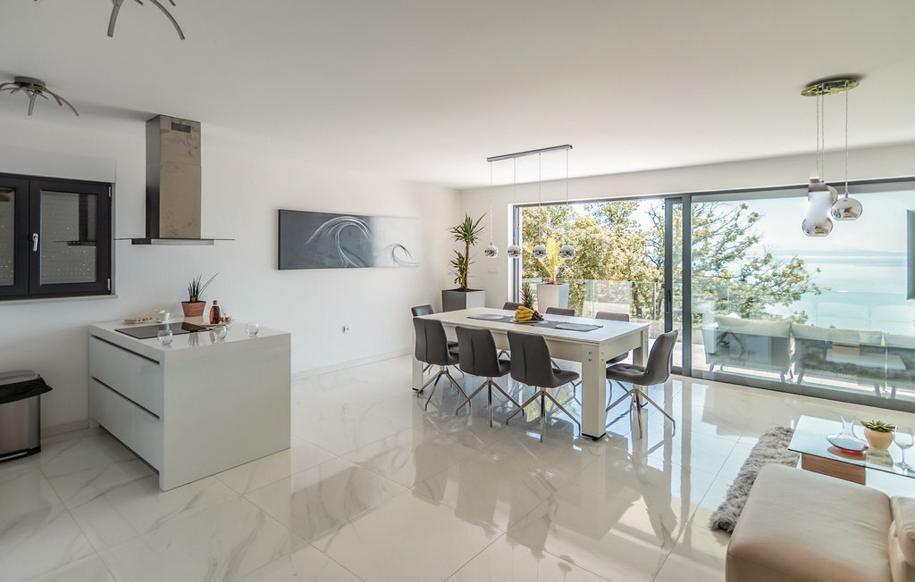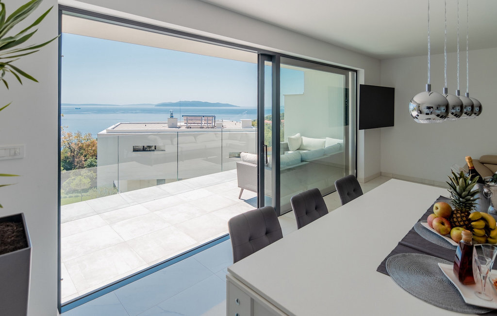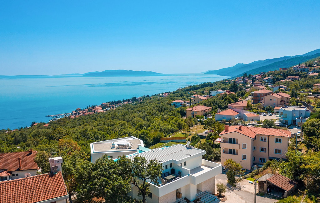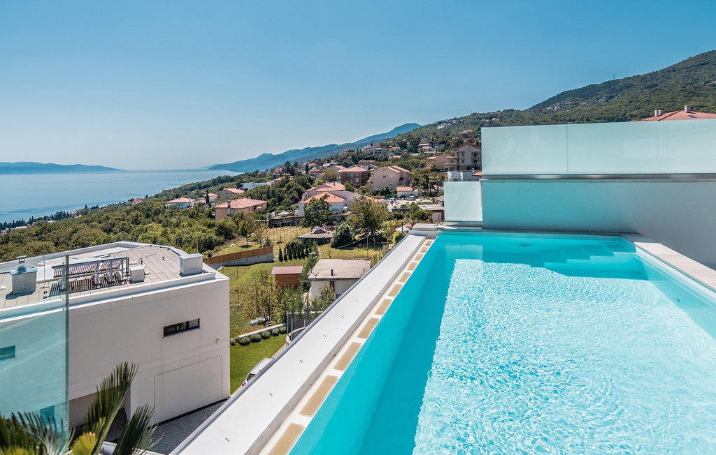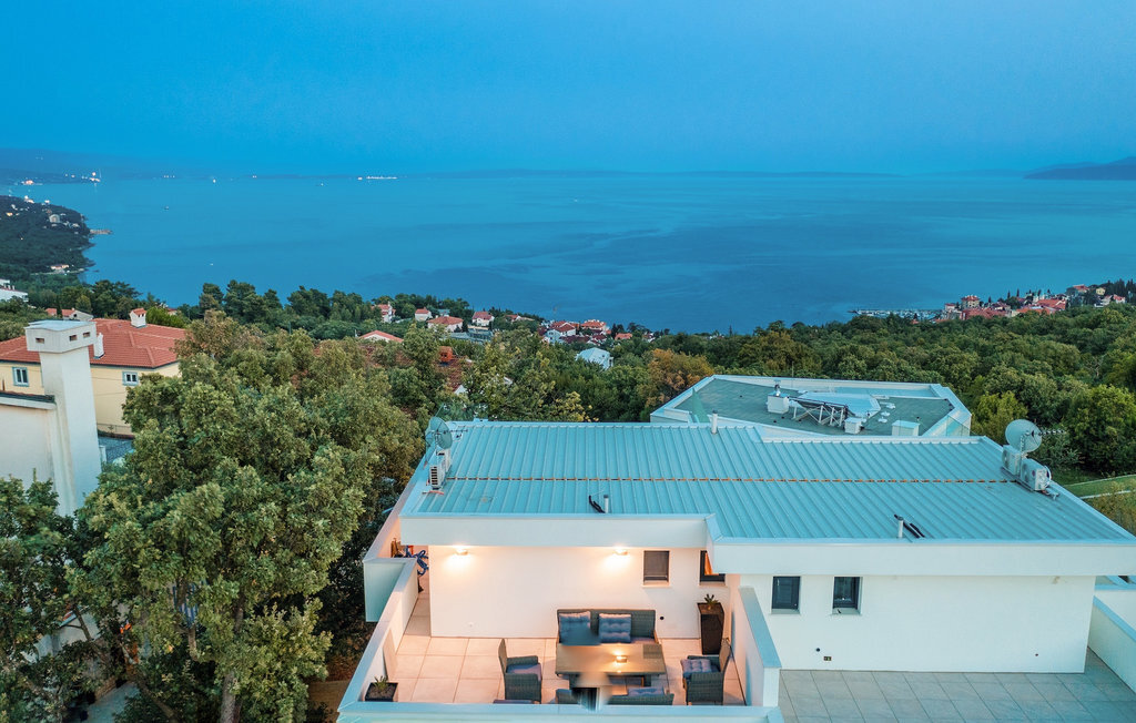 La villa moderne The Boat se trouve à proximité d'Opatija, la station balnéaire la plus populaire de Kvarner. Située sur la colline de la petite ville de Matulji, les terrasses de cette villa offrent une vue panoramique magnifique sur le golfe de Kvarner. Au bord de la piscine sur le toit de la villa The Boat, vous aurez l'impression de naviguer sur les vagues du golfe.