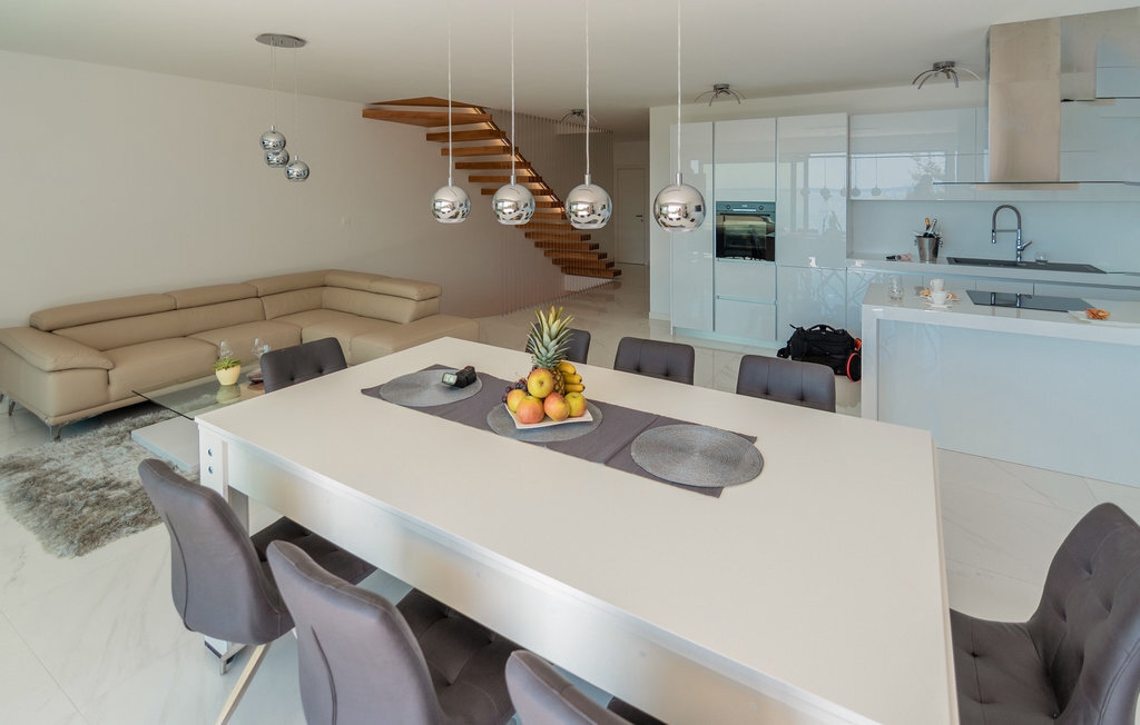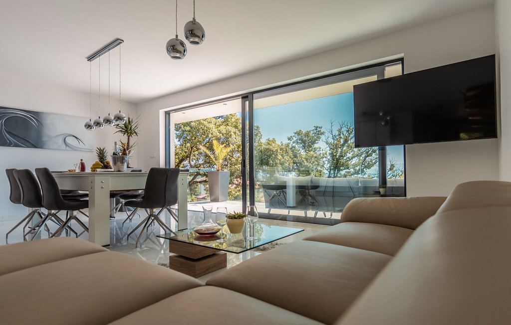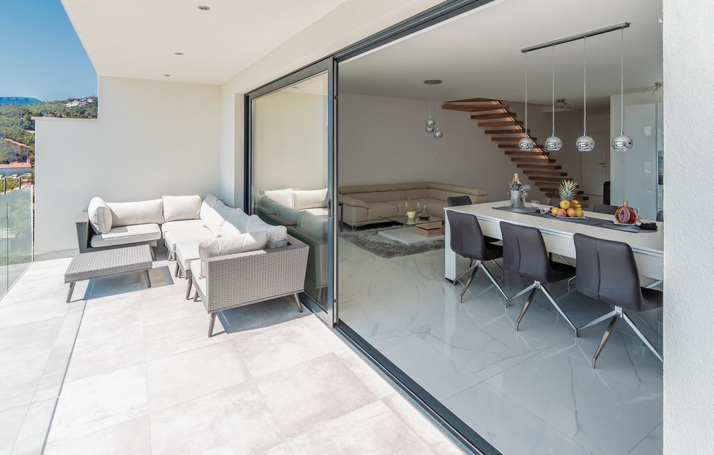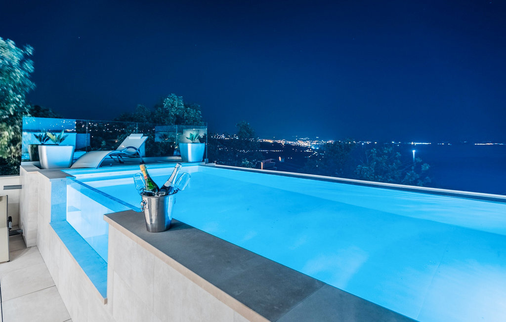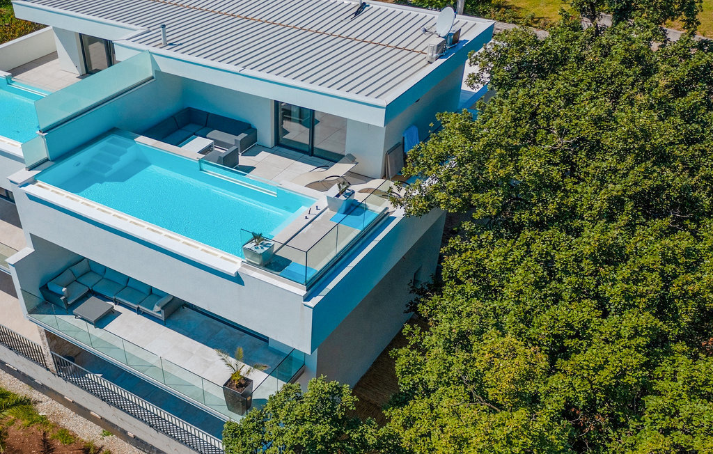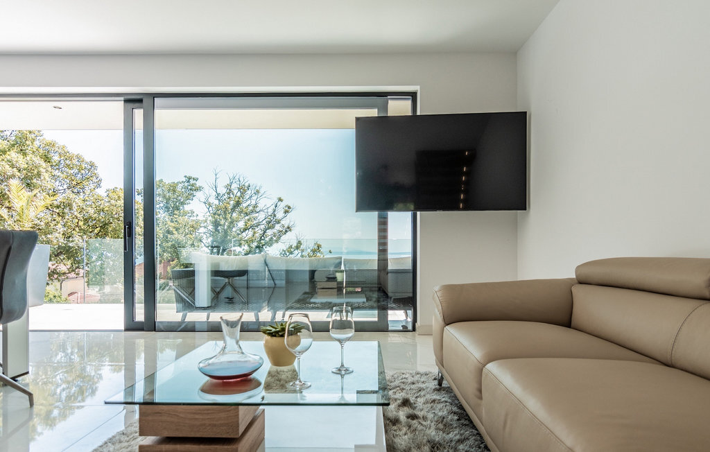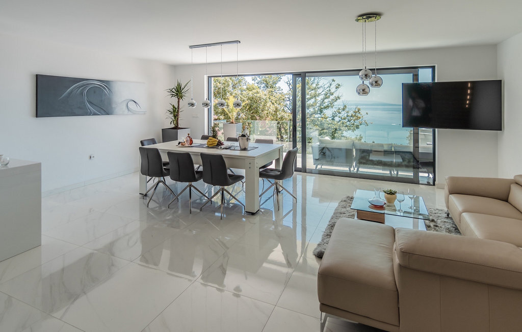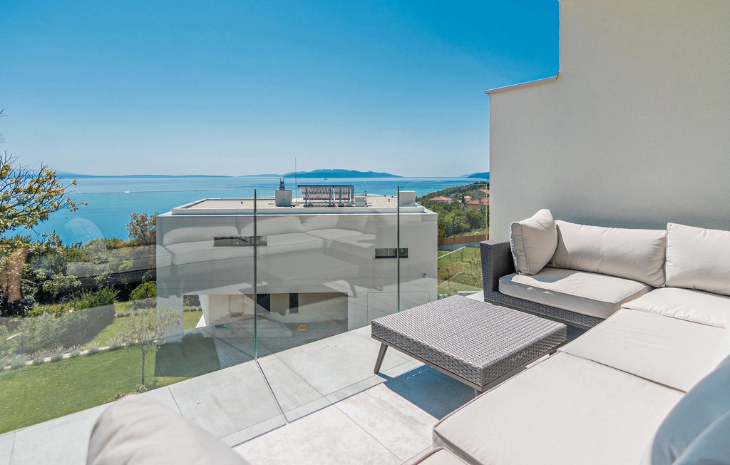 La villa moderne The Boat se trouve à proximité d'Opatija, la station balnéaire la plus populaire de Kvarner. Située sur la colline de la petite ville de Matulji, les terrasses de cette villa offrent une vue panoramique magnifique sur le golfe de Kvarner. Au bord de la piscine sur le toit de la villa The Boat, vous aurez l'impression de naviguer sur les vagues du golfe.