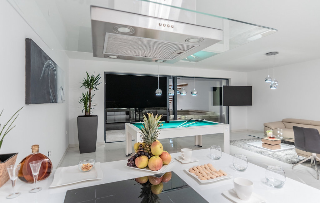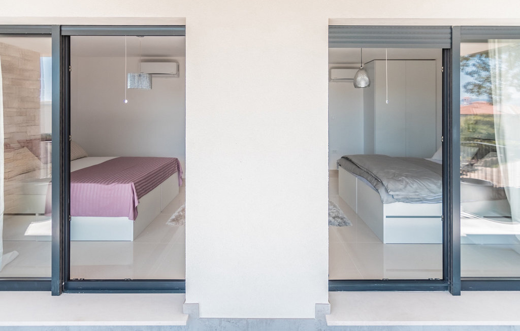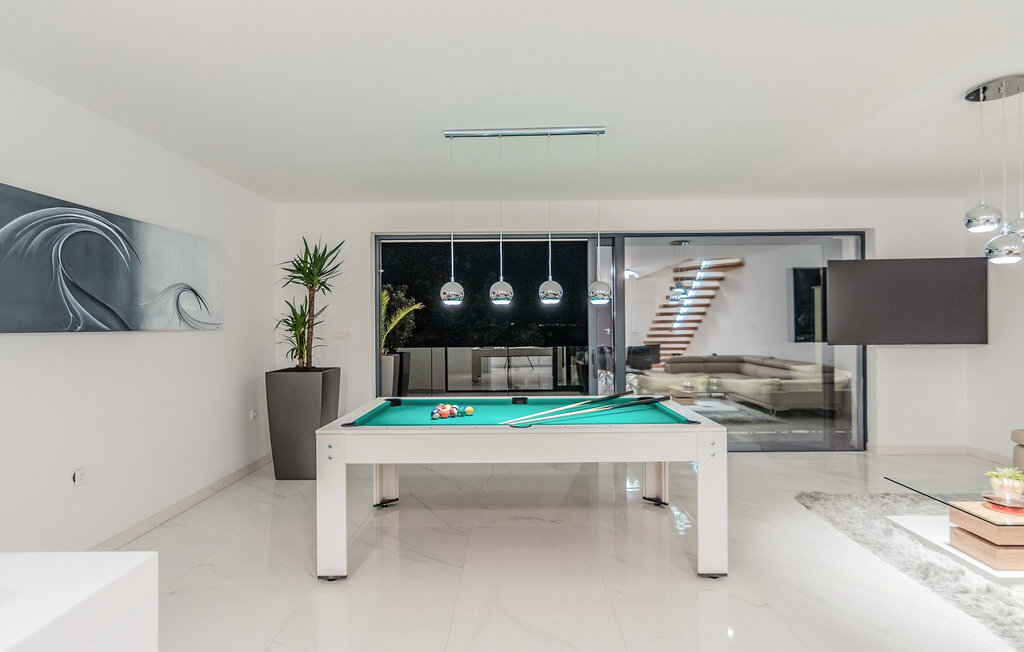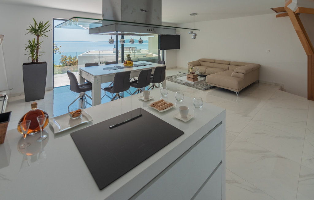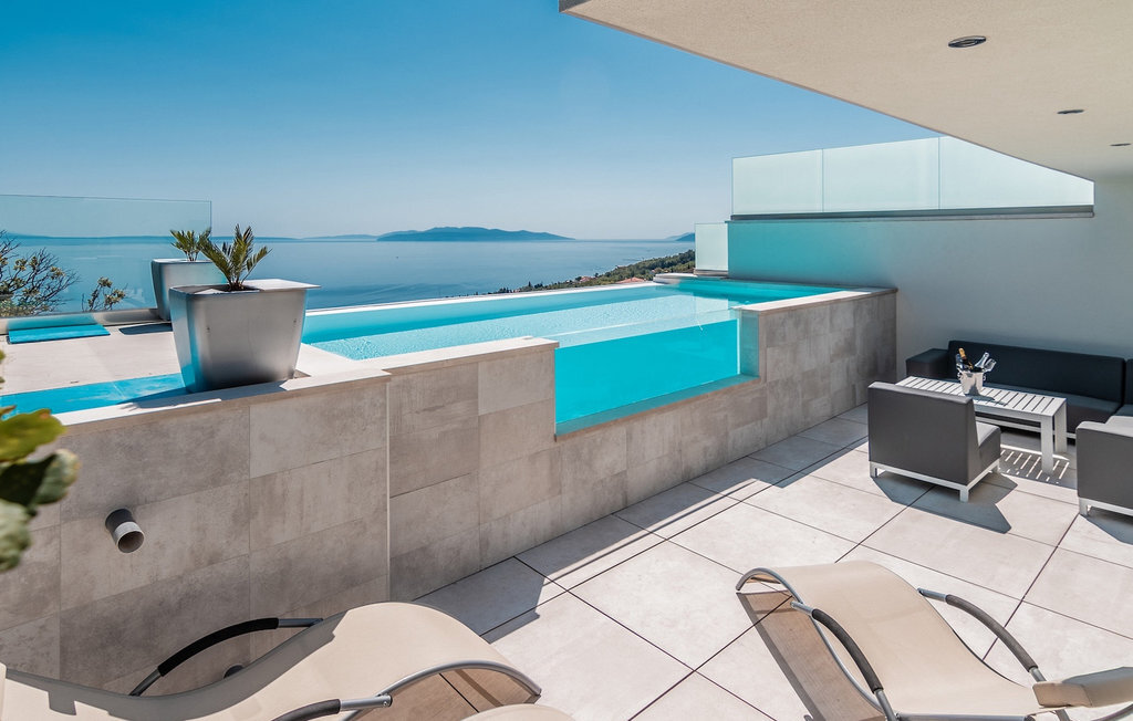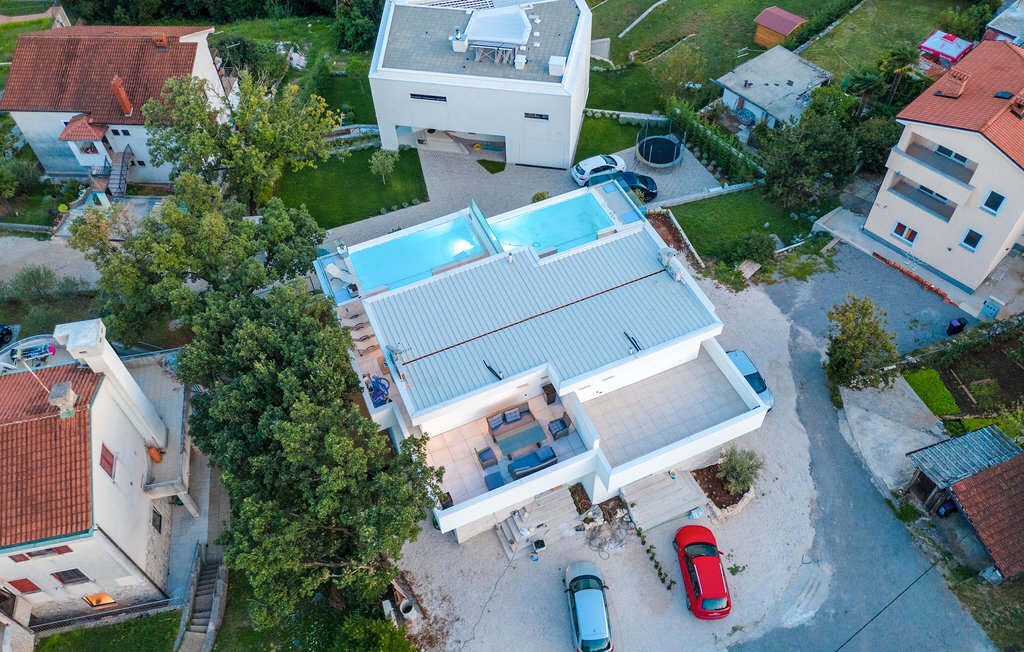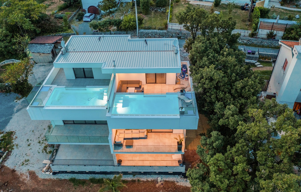 La villa est divisée en trois niveaux. Au rez-de-chaussée se trouvent deux chambres à lit double, chacune avec sa propre salle de bain avec douche, télévision et climatisation. Au premier étage se trouvent un salon et une salle à manger modernes avec une cuisine et une salle de bain. La table à manger peut facilement être transformée en table de billard. Au même étage, il y a une chambre supplémentaire pour deux enfants plus sur demande. L'imposant escalier en bois mène à une autre chambre avec un lit double au deuxième étage. La chambre dispose d'une salle de bain privée, d'une télévision et de la climatisation. Chaque étage de cette villa dispose d'une terrasse où vous pourrez profiter du soleil ou du ciel étoilé en famille ou entre amis. Vous ne quitterez qu'à regret la piscine sur le toit de la villa, qui vous invite à nager au-dessus des nuages de la baie de Kvarner.