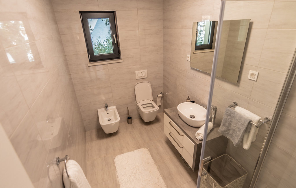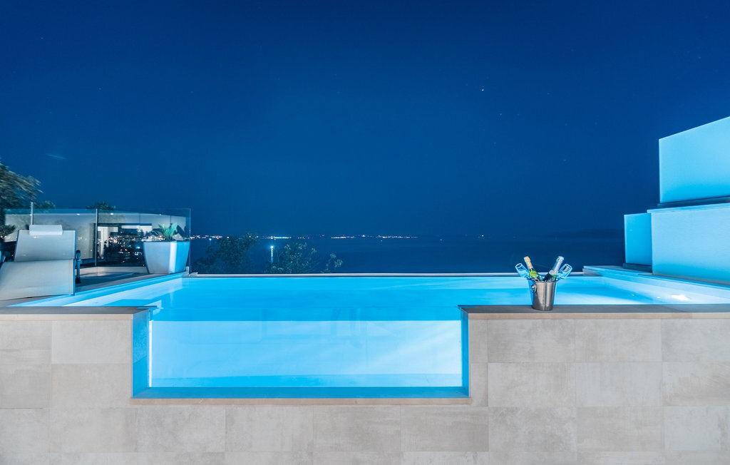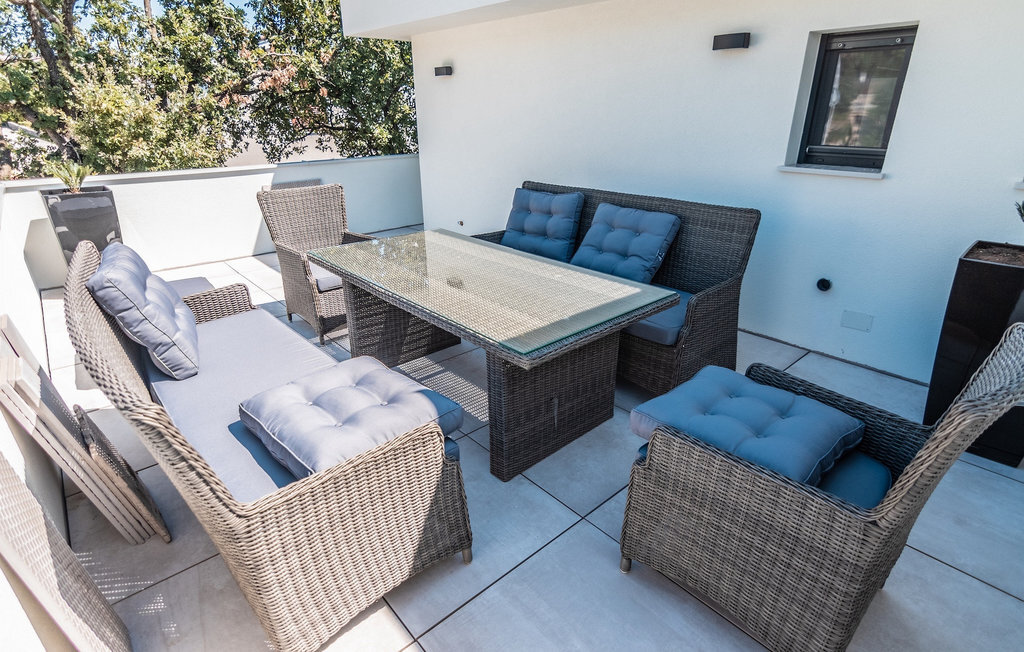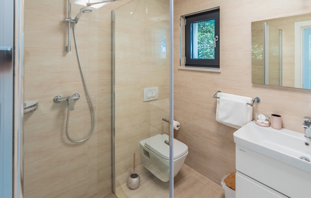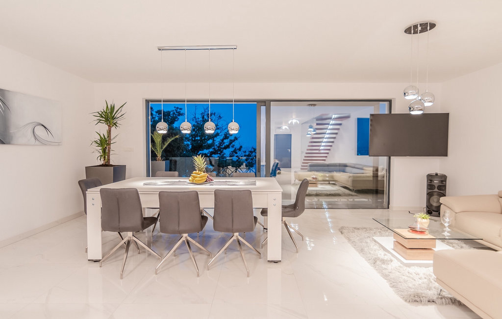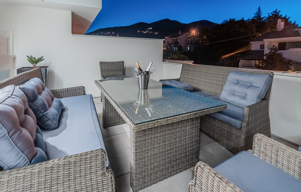 La villa est divisée en trois niveaux. Au rez-de-chaussée se trouvent deux chambres à lit double, chacune avec sa propre salle de bain avec douche, télévision et climatisation. Au premier étage se trouvent un salon et une salle à manger modernes avec une cuisine et une salle de bain. La table à manger peut facilement être transformée en table de billard. Au même étage, il y a une chambre supplémentaire pour deux enfants plus sur demande. L'imposant escalier en bois mène à une autre chambre avec un lit double au deuxième étage. La chambre dispose d'une salle de bain privée, d'une télévision et de la climatisation. Chaque étage de cette villa dispose d'une terrasse où vous pourrez profiter du soleil ou du ciel étoilé en famille ou entre amis. Vous ne quitterez qu'à regret la piscine sur le toit de la villa, qui vous invite à nager au-dessus des nuages de la baie de Kvarner.