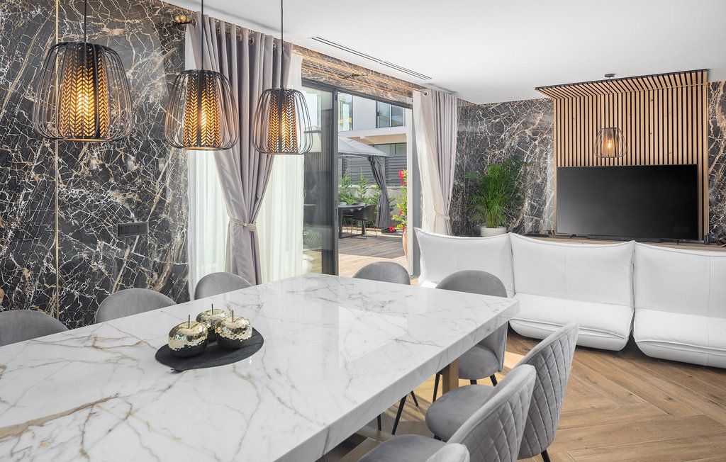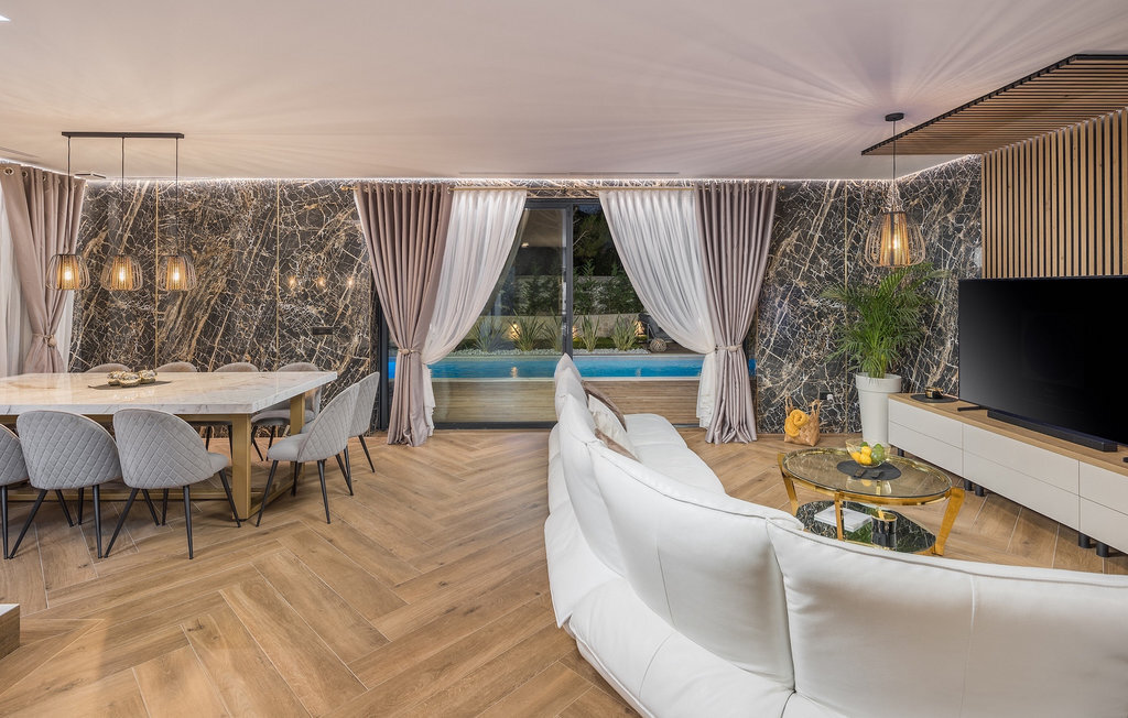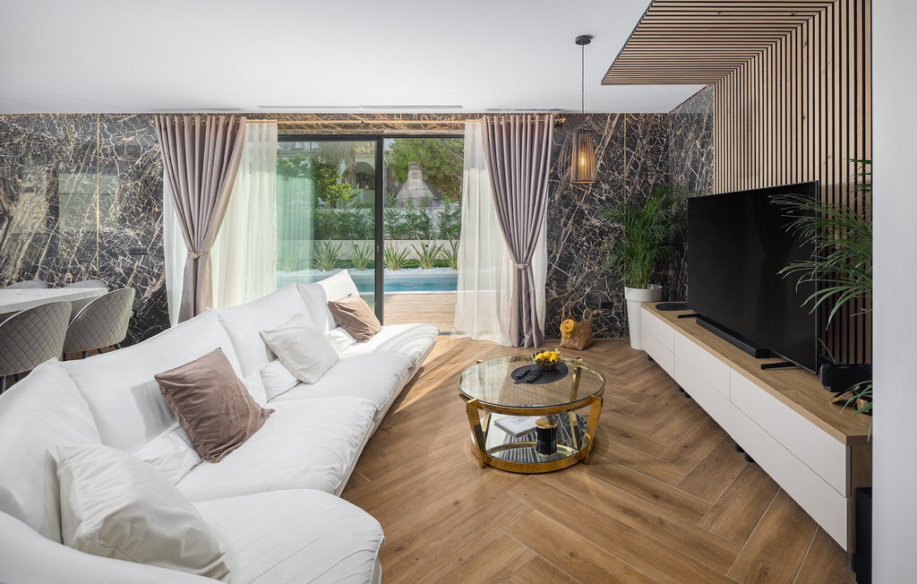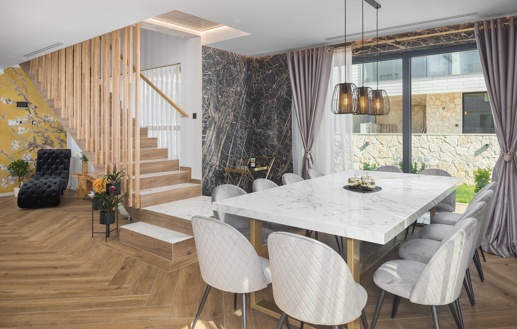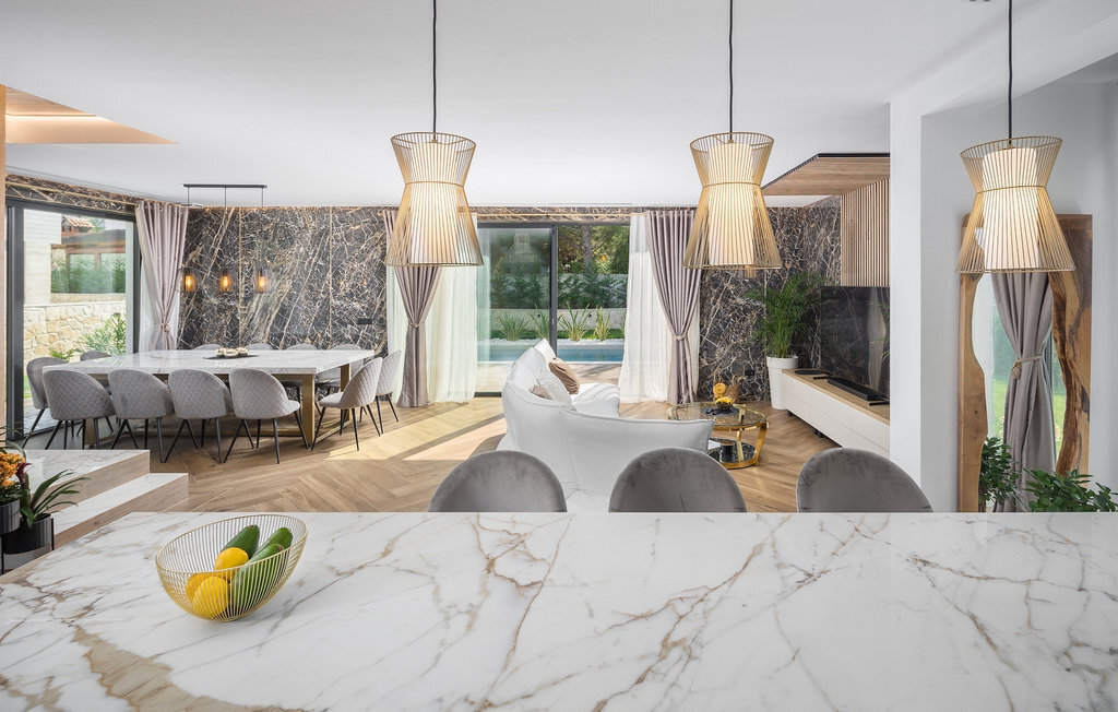 La première chose que vous remarquerez en entrant à l'intérieur de la villa est l'aménagement moderne et unique qui se poursuit dans toute la maison. La continuité dans l'aménagement, avec des tons neutres et beaucoup de lumière, fait du plan ouvert du salon, de la salle à manger et de la cuisine un espace encore plus spacieux. L'îlot de cuisine avec ses chaises de bar est l'endroit idéal pour prendre le café du matin ou le petit déjeuner. Et la grande table à manger est l'endroit prévu pour des soirées communes avec repas et jeux de société pour tout le groupe de voyageurs. Dans la continuité du rez-de-chaussée, vous trouverez encore deux chambres à coucher spacieuses et deux salles de bains.