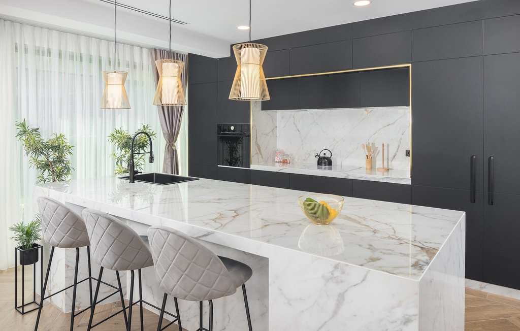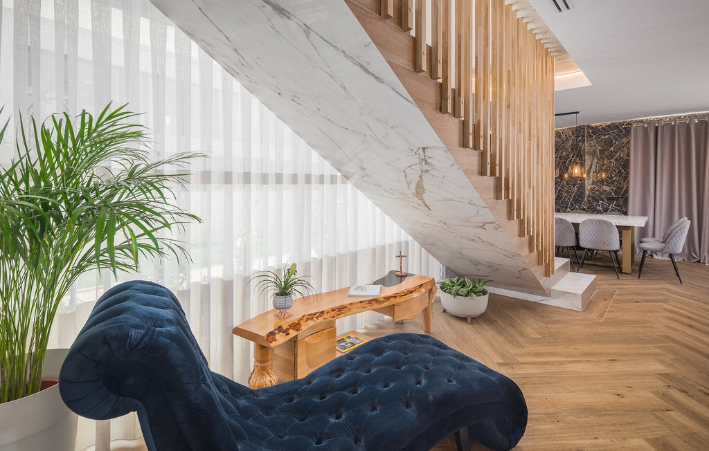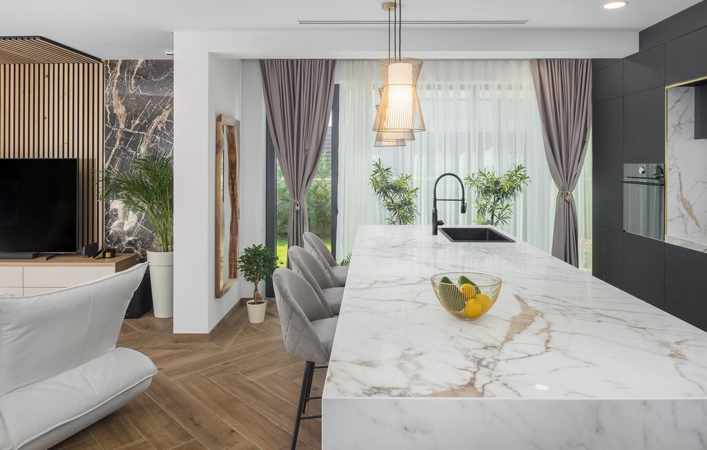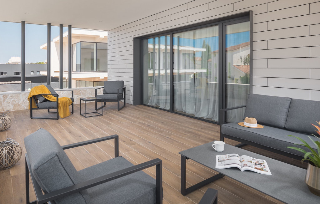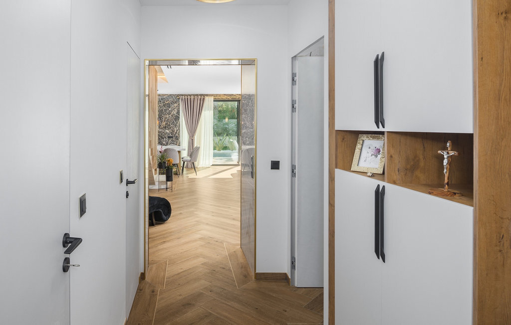 La première chose que vous remarquerez en entrant à l'intérieur de la villa est l'aménagement moderne et unique qui se poursuit dans toute la maison. La continuité dans l'aménagement, avec des tons neutres et beaucoup de lumière, fait du plan ouvert du salon, de la salle à manger et de la cuisine un espace encore plus spacieux. L'îlot de cuisine avec ses chaises de bar est l'endroit idéal pour prendre le café du matin ou le petit déjeuner. Et la grande table à manger est l'endroit prévu pour des soirées communes avec repas et jeux de société pour tout le groupe de voyageurs. Dans la continuité du rez-de-chaussée, vous trouverez encore deux chambres à coucher spacieuses et deux salles de bains.