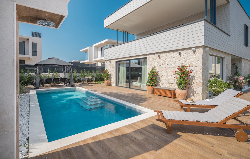 Offrez-vous une pause dans le rythme effréné de la vie quotidienne dans la magnifique villa Golden Shine pour 8+2 hôtes. Profitez de vos vacances en famille ou entre amis dans cette villa avec piscine privée, entourée d'un jardin bien entretenu avec de nombreuses plantes.La terrasse extérieure près de la piscine offre tout ce dont vous avez besoin pour un séjour en plein air. Préparez vos repas quotidiens sur le barbecue et savourez-les à la table à manger couverte sur la terrasse. Un espace lounge à côté de la piscine est également disponible pour de courtes pauses café ou cocktail. La grande porte vitrée offre un accès direct de la terrasse extérieure au plan ouvert du salon, de la salle à manger et de la cuisine au rez-de-chaussée.