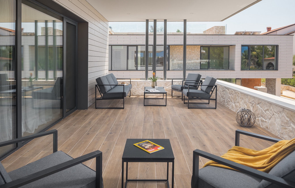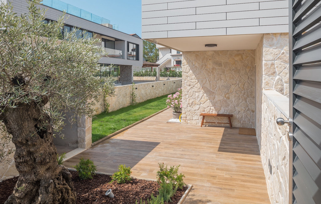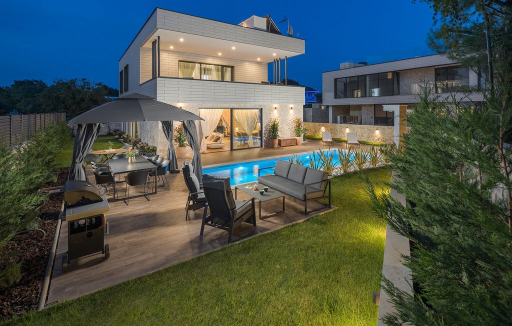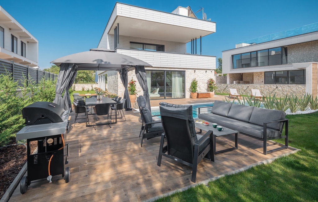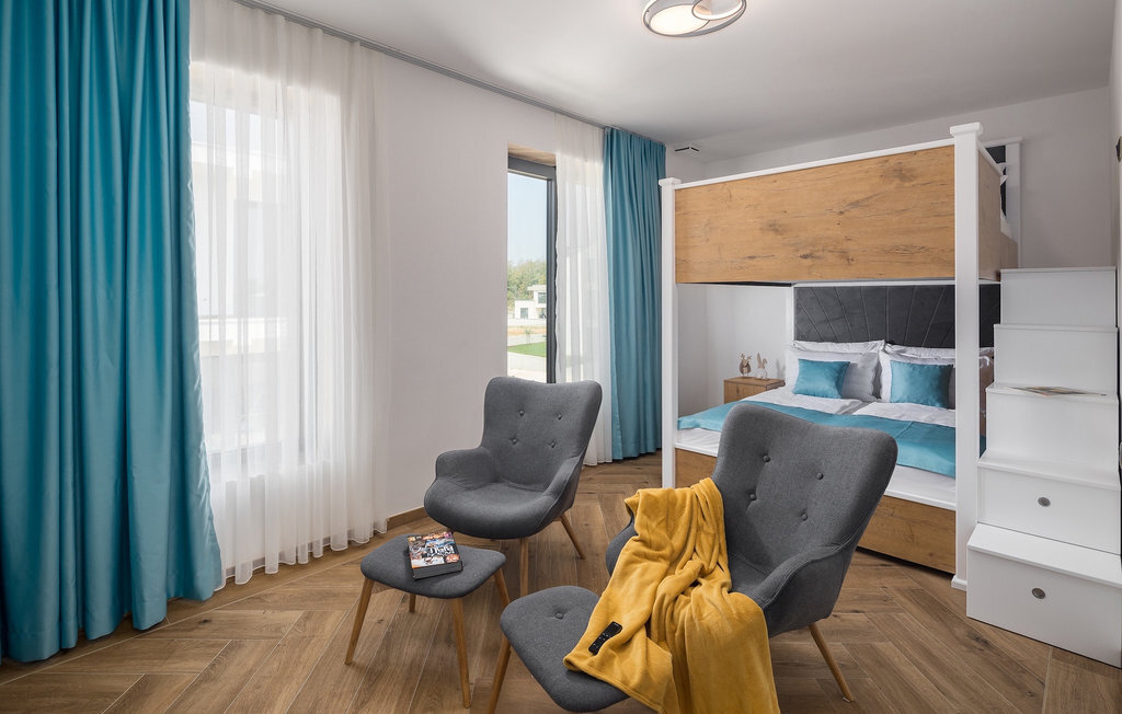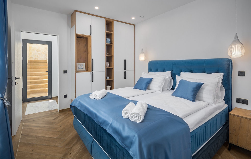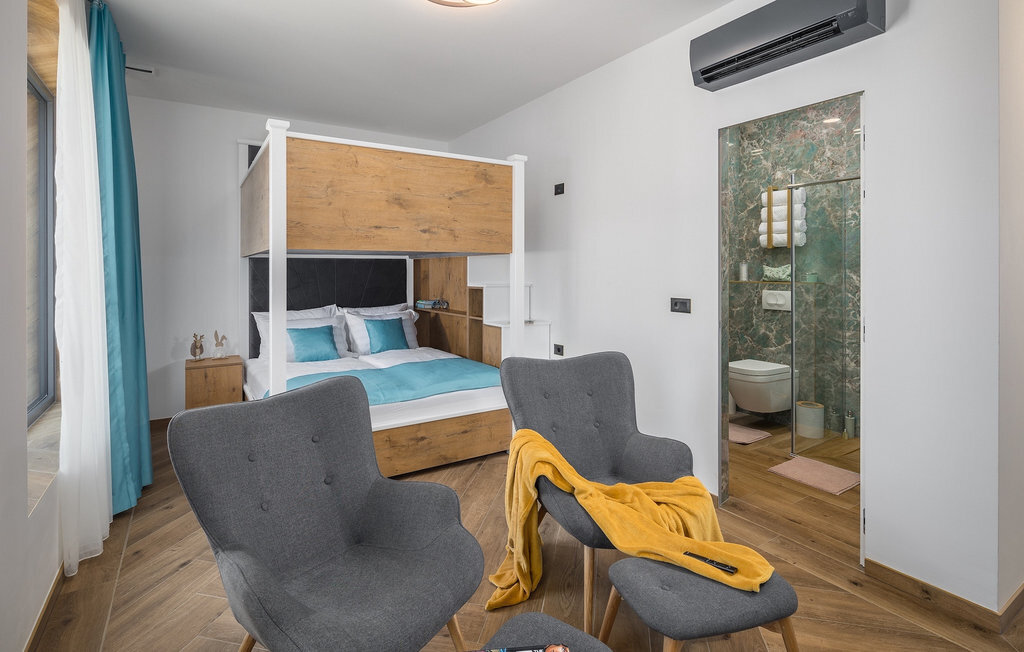 En montant les escaliers vers le premier étage, vous trouverez les trois chambres restantes, chacune avec sa propre salle de bain. Chaque chambre est décorée de manière unique et se distingue par l'attention portée à chaque détail. La chambre principale se distingue toutefois par son propre grand balcon avec vue sur la piscine et la terrasse extérieure. La possibilité de boire son café du matin en toute tranquillité sur son propre balcon rend certainement le réveil matinal, même en vacances, beaucoup plus facile!Funtana est un petit village d'Istrie situé sur la côte entre les villes de Vrsar et de Pore. Comme elle est située directement sur la côte, tous les avantages des vacances d'été sont à portée de main, avec une multitude de plages comme celles de Funtana, Puntica et la plage pour chiens de Bijela Uvala. Visitez la magnifique ville de Vrsar, située à seulement 4 km, ou faites une excursion d'une journée à Pore, connue surtout pour sa basilique d'Euphrasius. La basilique a été construite au 6e siècle, à l'époque de l'évêque Euphrasius et de l'empereur Justinien Ier, et est un monument caractéristique de l'art byzantin. Elle a même été inscrite au patrimoine mondial de l'UNESCO. Ne manquez pas non plus les excursions d'une journée dans la partie centrale de l'Istrie, où se trouvent de nombreuses tavernes et propriétés avec des vignobles, où vous pourrez déguster des délices istriens comme le prosciutto et des vins caractéristiques.