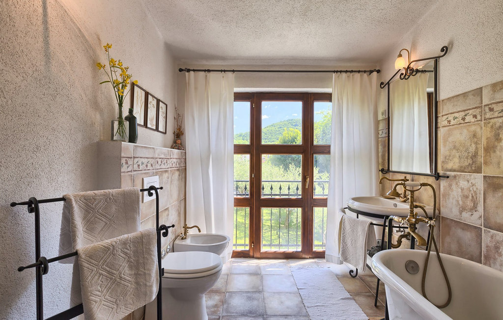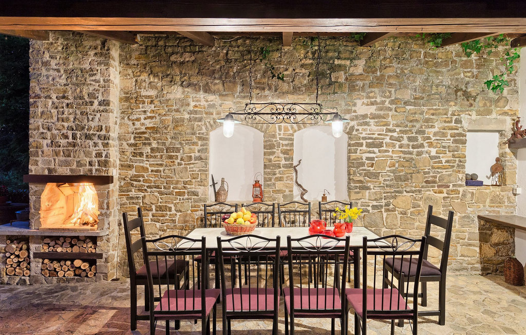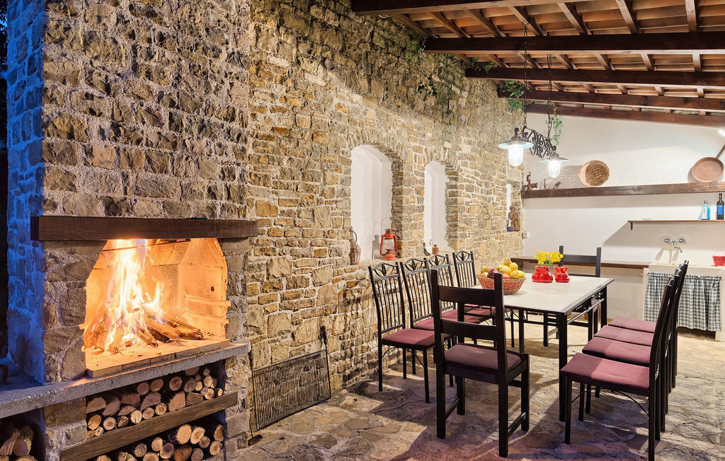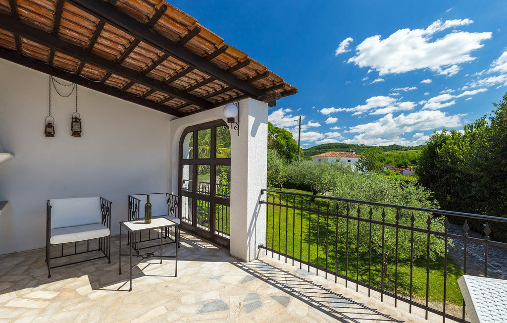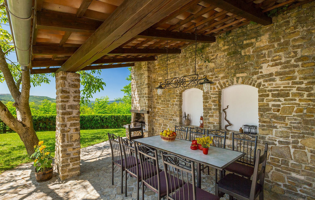 L'appartement a également une sortie directe sur une grande terrasse avec une cheminée partiellement couverte. Vous pourrez vous y détendre tout en profitant de la vue magnifique sur la vallée qui entoure Motovun.