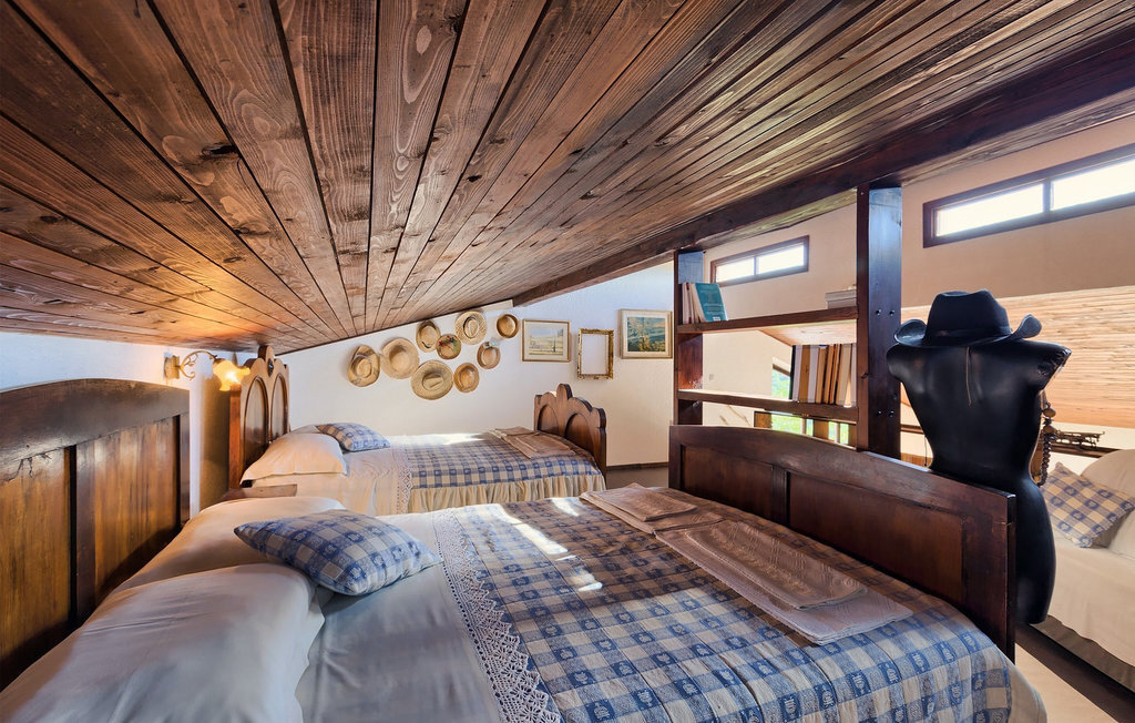 L'appartement - chambre familiale - également au premier étage, comprend une petite cuisine fonctionnelle et un coin repas, la chambre principale avec sa propre salle de bain et une cheminée qui crée une atmosphère particulièrement chaleureuse. Des marches mènent à la galerie ouverte, où se trouvent deux lits simples (chacun de 140 cm de large, pour 4 personnes maximum).