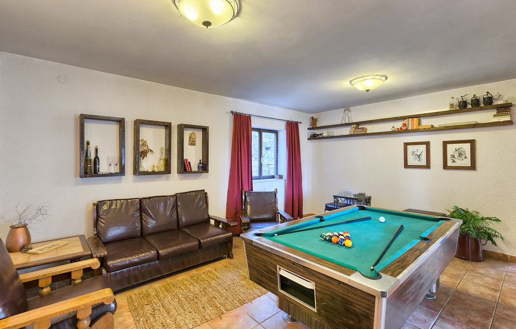 Au sous-sol, il y a une chambre à coucher avec un lit double (max 2 personnes) et une salle de bain privée (et un accès direct à la piscine), une cuisine entièrement équipée avec une grande salle à manger qui se prolonge dans le salon qui est meublé de manière appropriée pour votre confort et votre détente. Vous trouverez également une salle de divertissement avec une table de billard et un canapé-lit pour 2 personnes.