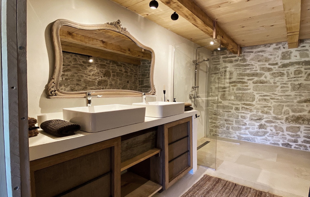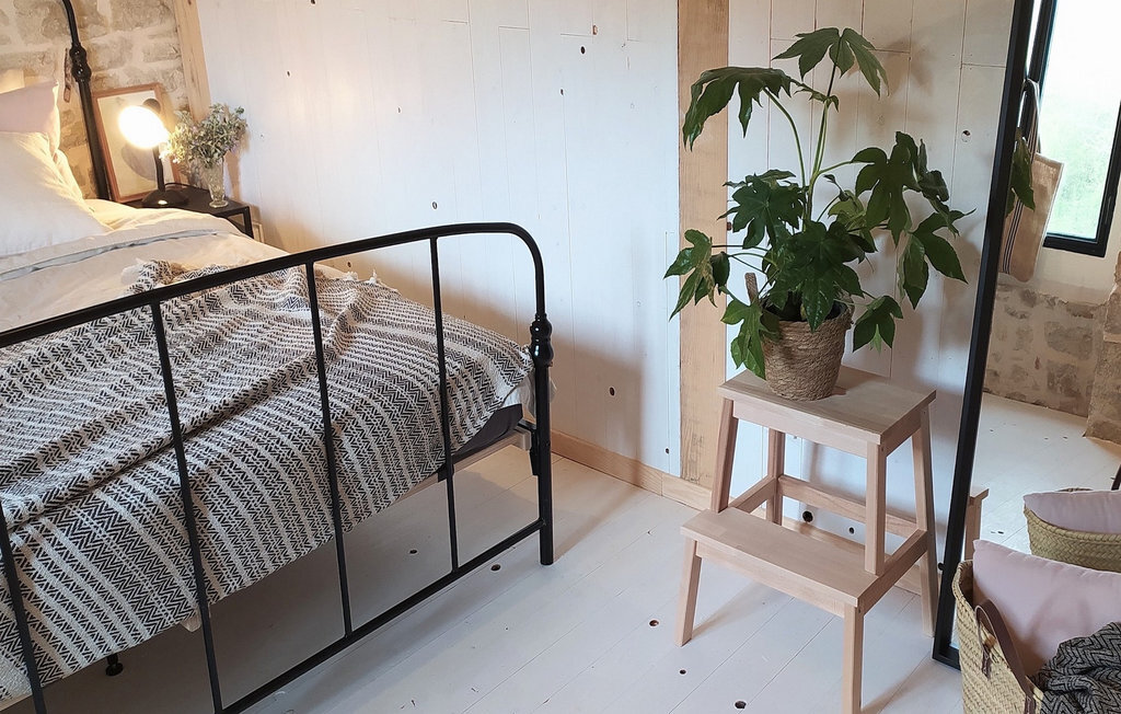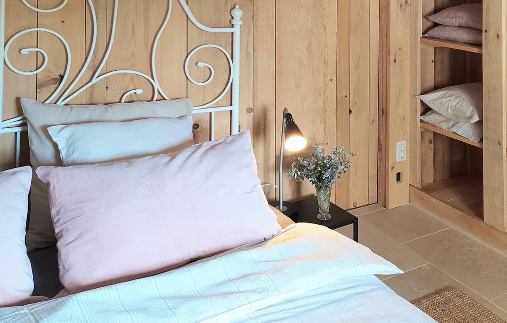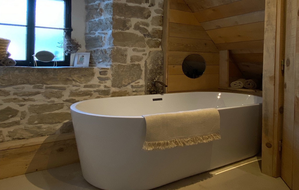 Au premier étage, deux chambres à coucher avec lit double promettent des nuits reposantes. Une salle de bain séparée est équipée d'une baignoire. Vous pouvez y prendre un bain, allumer des bougies et vous détendre tout simplement. Après avoir profité d'un bain, vous pouvez vous offrir une boisson fraîche sur la charmante terrasse supérieure, accessible par l'une des chambres.