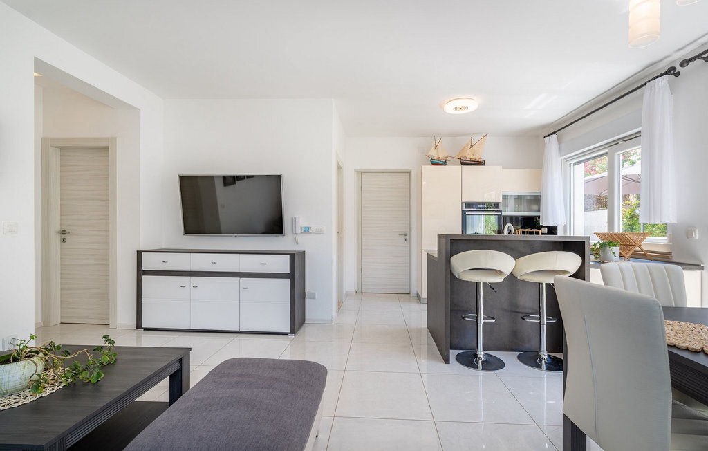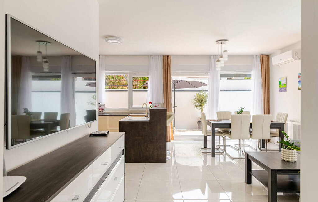 Si vous êtes à la recherche d'une belle maison de vacances à proximité de la mer, où vous pourrez vous détendre et vous libérer du stress quotidien, la Villa Rooftop Spa est un choix parfait. Comme son nom l'indique, le point fort de la villa est sa terrasse sur le toit, où vous pourrez trouver une oasis de verdure. La terrasse se compose d'un espace bien-être avec jacuzzi et chaises longues, où vous pourrez vous détendre et profiter de la magnifique vue sur la mer. À quelques pas de là se trouve une salle à manger extérieure ombragée et un barbecue au charbon de bois, l'endroit idéal pour des dîners décontractés avec vos proches. L'intérieur de cette villa de deux étages est décoré dans un style très confortable et donne à ses hôtes l'impression d'être chez eux. Le rez-de-chaussée se compose d'une cuisine moderne et bien équipée, d'un coin repas, d'un salon confortable avec un canapé-lit et de deux chambres à coucher doubles. À l'étage supérieur se trouvent une cuisine spacieuse avec un coin repas, un salon confortable avec un canapé-lit supplémentaire, une salle de bain avec baignoire et une chambre principale avec salle de bain privée. La villa est parfaite pour les familles ou les groupes à la recherche de vacances reposantes, alors ne manquez pas cette occasion et réservez la Villa Rooftop Spa dès maintenant.La charmante Villa Rooftop Spa est située sur l'île d'iovo, non loin de Trogir. L'île est reliée au continent par un pont, et vous pouvez atteindre cette belle destination très facilement et rapidement. Alors que Trogir est l'endroit où vous pouvez rechercher l'histoire et admirer les vieux murs, les ruelles et l'esprit de la Méditerranée d'antan, iovo est l'endroit où vous trouverez repos, divertissement, bonne nourriture et plages. Les destinations les plus populaires se trouvent à Okrug Gornji et Okrug Donji, où vous trouverez également les meilleurs restaurants. Dans la partie sud-ouest de l'île, vous trouverez les belles plages de galets de Labadusa, Barbara et Kava, tandis qu'au nord-ouest se trouve la plage la plus populaire, "Okruka Copacabana", longue de 2 km, à Okrug Gornji. Visitez la ville historique de Trogir, inscrite sur la liste de l'UNESCO depuis 1997. Promenez-vous dans les ruelles étroites de la vieille ville et découvrez sa riche histoire.