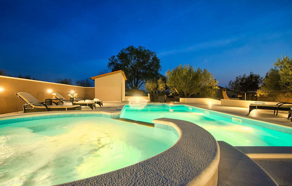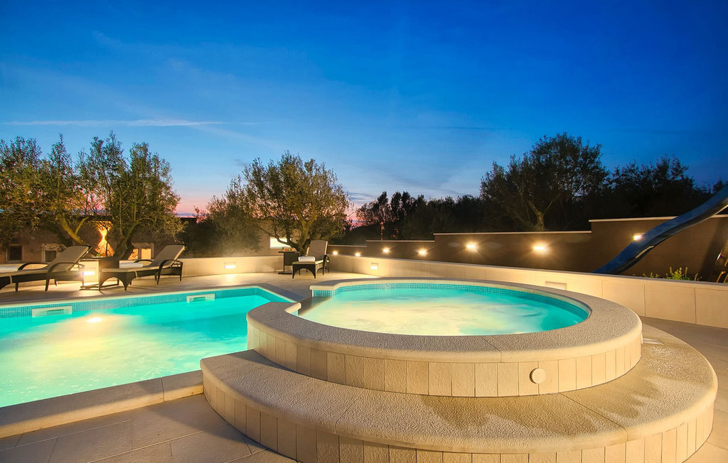 À l'extérieur se trouve également l'une des piscines en pierre les plus joliment décorées, avec hydromassage. Des chaises longues complètent le plaisir.