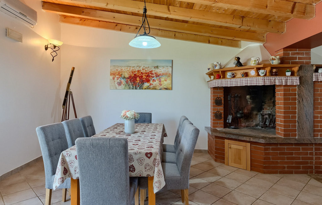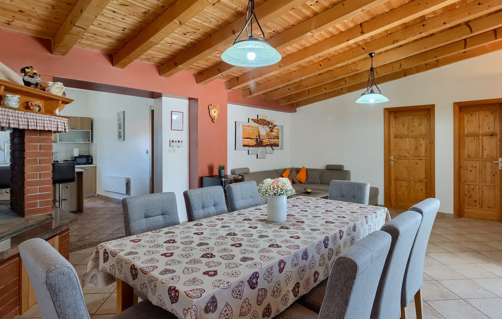 La grande salle à manger est décorée dans un style rustique, avec une cheminée ouverte et un plafond en bois qui ajoutent de la chaleur à l'atmosphère de la maison. La cuisine est moderne et entièrement équipée.