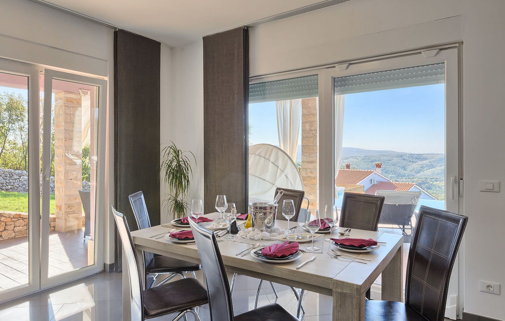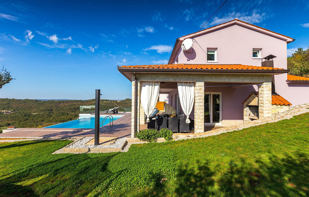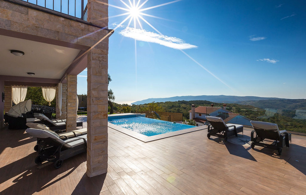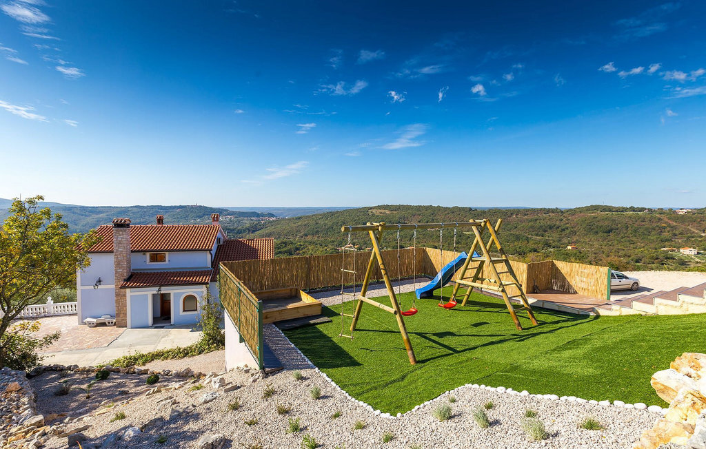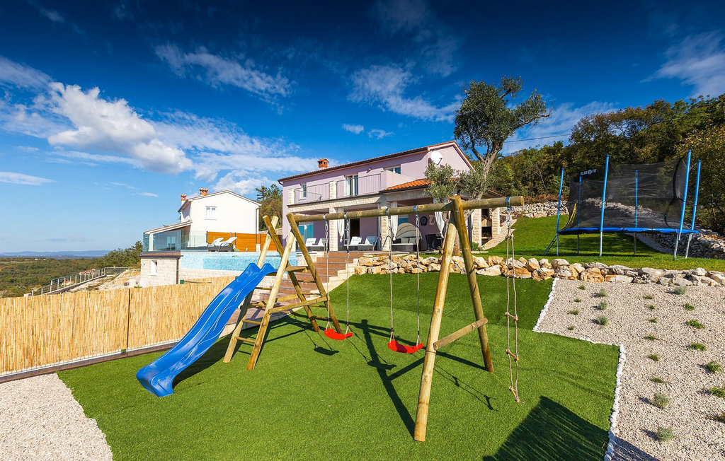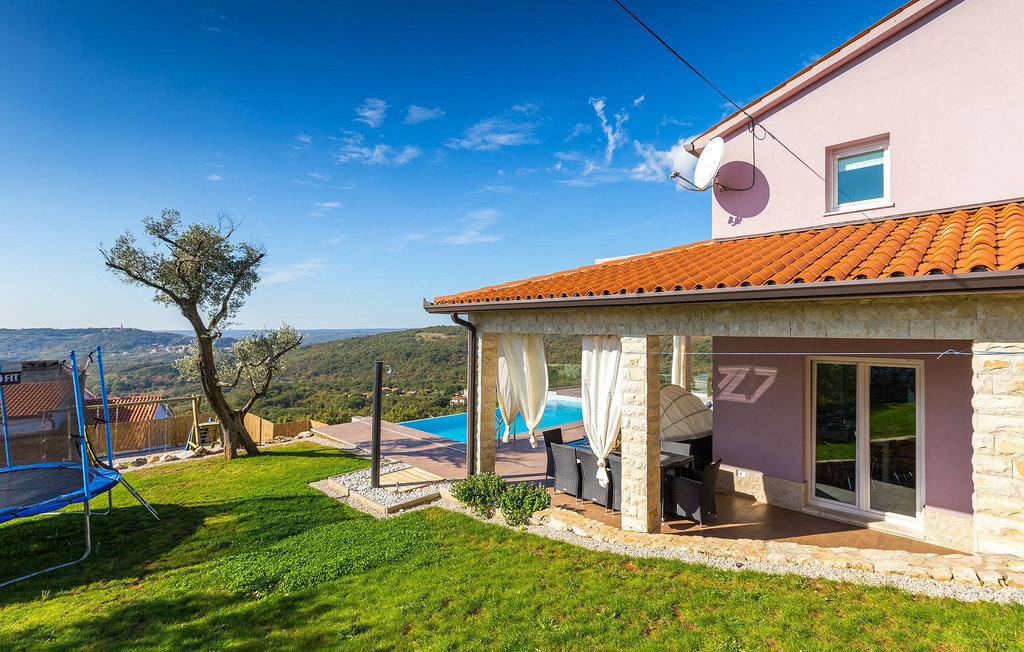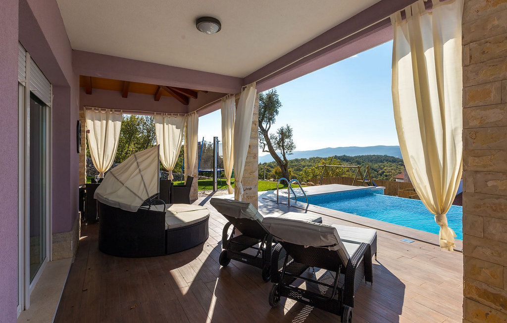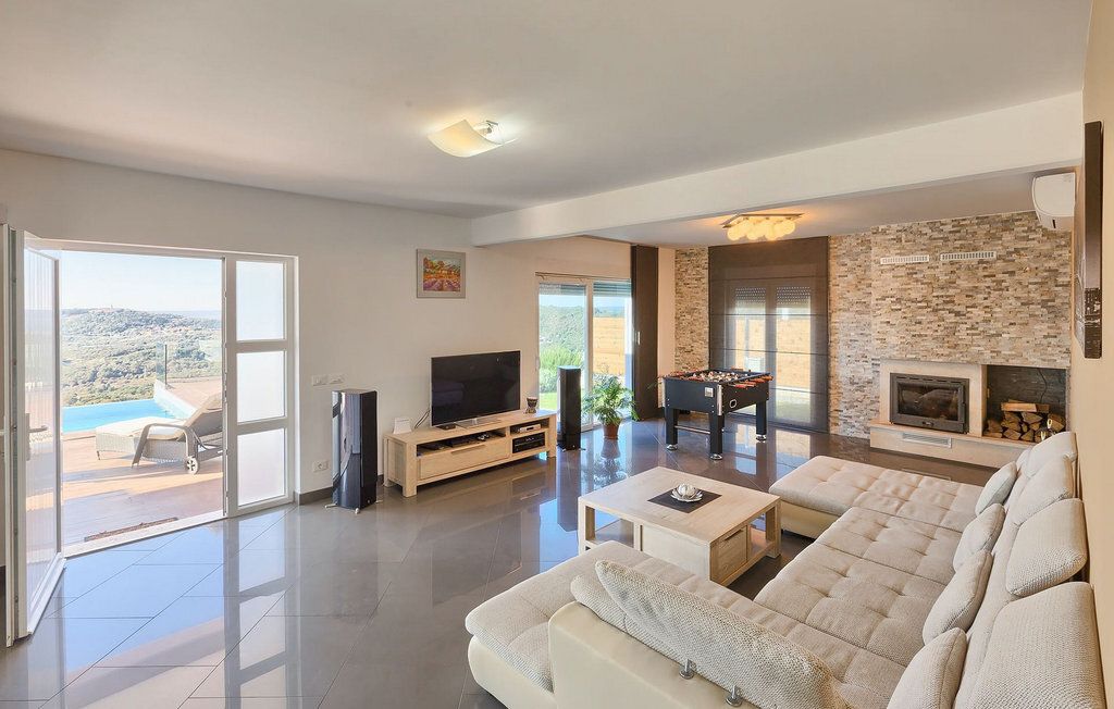 Si les vues à couper le souffle sont en tête de votre liste de souhaits, vous trouverez dans la Villa Amelie votre refuge de vacances idéal. Typique de l'Istrie, cette charmante villa est située à flanc de colline et offre des vues fabuleuses et infinies sur les collines pittoresques avec l'Adriatique scintillante et les îles idylliques du Kvarner à l'horizon. Au rez-de-chaussée spacieux et ouvert, un salon élégant jouxte une salle à manger confortable et une cuisine moderne entièrement équipée, où vous pouvez vous aventurer sans crainte à préparer quelques recettes régionales. Une belle cheminée, des canapés doux comme du beurre et des couleurs naturelles créent une ambiance chaleureuse, tandis que la grande télévision à écran plat avec chaîne stéréo et Playstation assure le divertissement de toute la famille. D'immenses fenêtres panoramiques laissent entrer la lumière naturelle et soulignent l'infinité de la vue. Elles s'ouvrent sur une grande véranda avec un salon accueillant, ainsi qu'une autre salle à manger avec un barbecue intégré pour vos repas savoureux en plein air. La magnifique piscine à débordement est conçue de telle manière que son bord disparaît tout simplement - dans un décor spectaculaire qui offre un panorama ultime. Trois chambres à coucher climatisées, dont une en suite, sont réparties à l'étage supérieur, qui donne sur une terrasse spacieuse où vous pourrez vous réveiller chaque matin avec une vue de rêve. De bons équipements pour vos petits, allant du lit et de la chaise bébé à leur propre aire de jeux en plein air, ainsi qu'une table de ping-pong, un baby-foot et des fléchettes, ajoutent à l'atmosphère familiale. Après une longue journée d'expériences culturelles authentiques et de baignades dans la mer cristalline, quel endroit pour profiter des couchers de soleil violets avec la silhouette de Labin à l'horizon.Depuis son emplacement exceptionnel, la délicieuse Villa Amelie jouit de l'une des plus belles vues sur la ville médiévale de Labin. Perchée sur sa colline au-dessus de la côte magique du Kvarner, Labin est le centre historique et administratif de l'Est de la Sardaigne. La région est un paradis pour les amateurs d'art et d'histoire grâce à son riche patrimoine culturel et architectural. Les ruelles escarpées et sinueuses de la vieille ville abritent des palais historiques bien conservés, de nombreuses galeries d'art et ?studios, ainsi que plusieurs festivals de jazz et de musique classique pendant les mois d'été. La ville dispose de quelques excellents restaurants de poisson, avec de délicieux produits locaux, ainsi que de cafés confortables où vous pourrez profiter de l'atmosphère détendue. La ville côtière de Labin est Rabac, ancien village de pêcheurs, aujourd'hui une destination touristique populaire, entourée d'une variété de plages de galets de rêve.