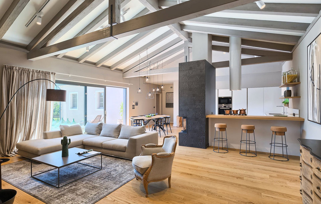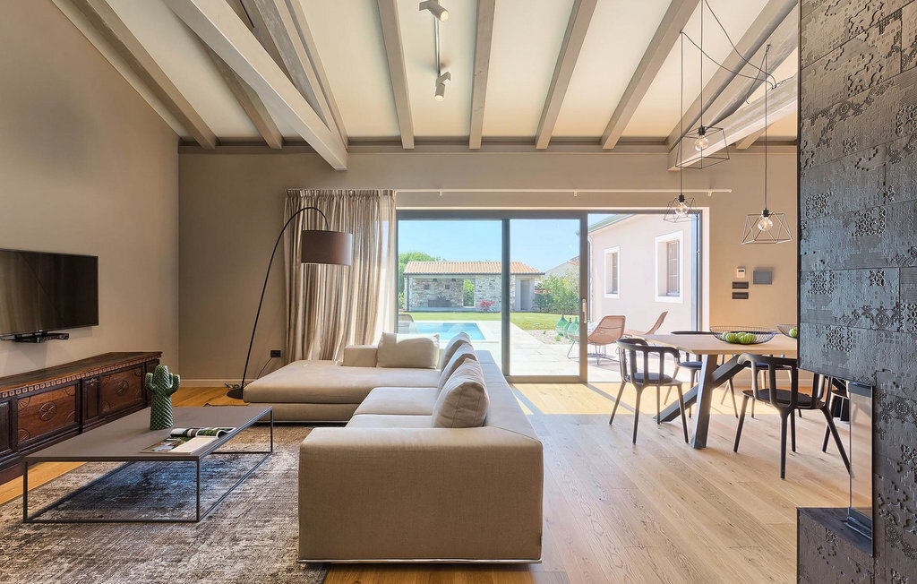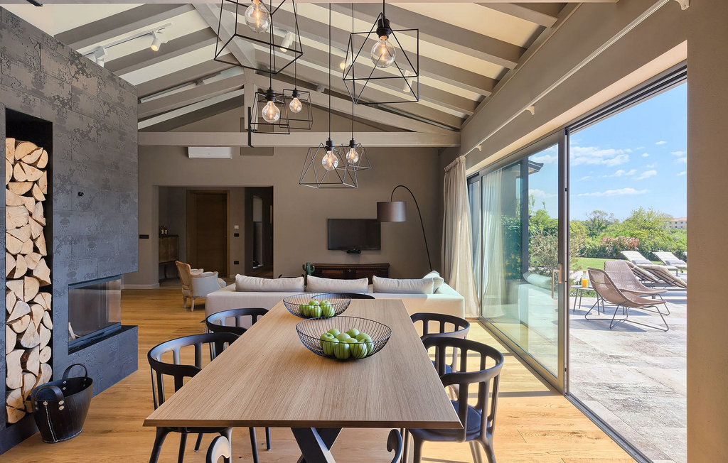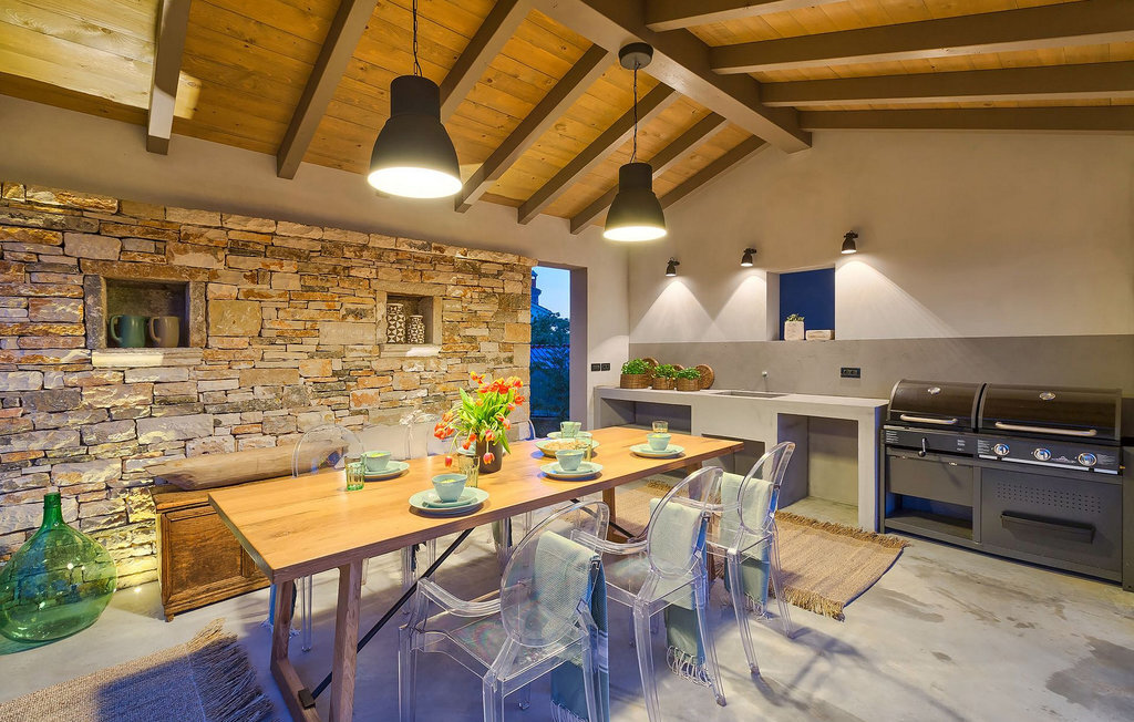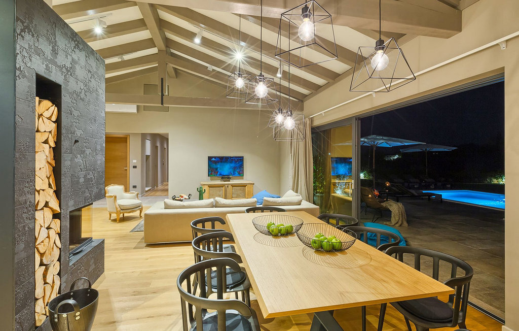 L'intérieur spacieux et aéré de la villa combine des détails rustiques avec des meubles élégants et un équipement moderne (WiFi, A/C).