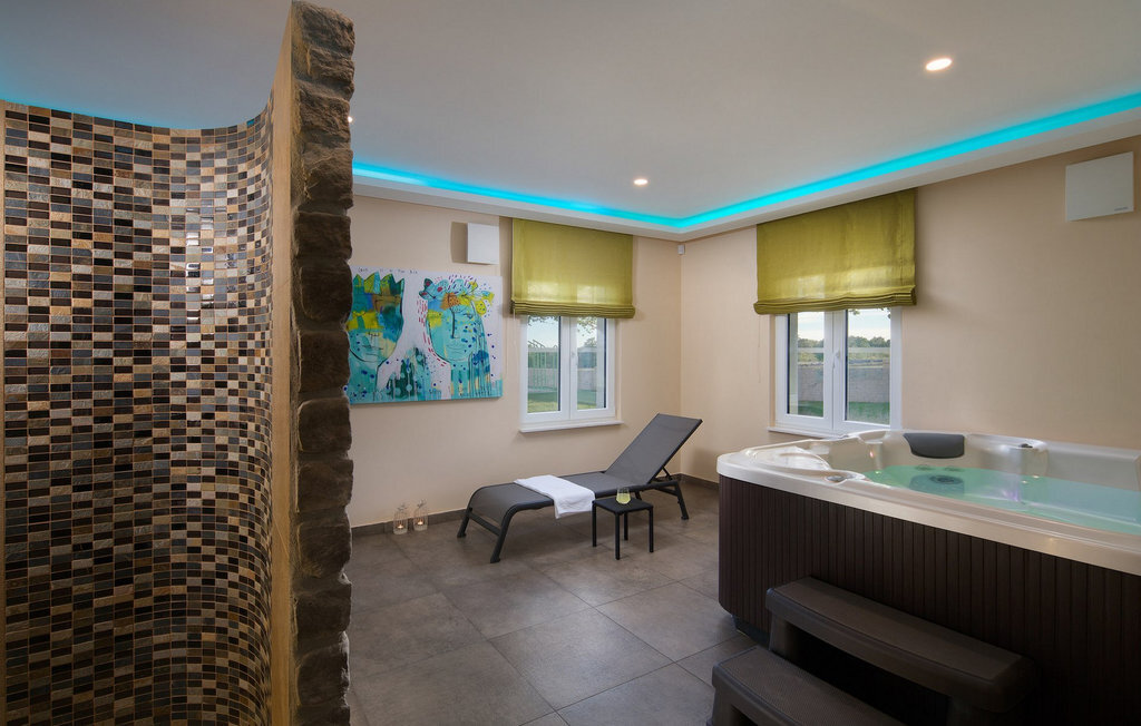 Passez un après-midi de détente dans l'espace bien-être élégamment aménagé avec jacuzzi et sauna, qui répond à tous vos souhaits. À l'étage supérieur se trouvent quatre chambres à coucher avec lit double et chacune sa propre salle de bain.