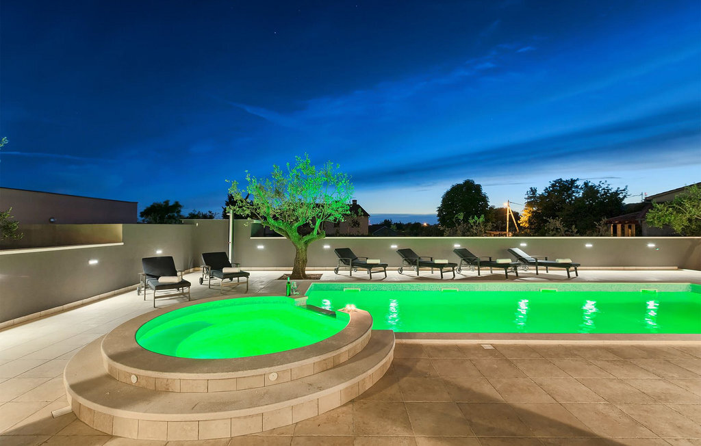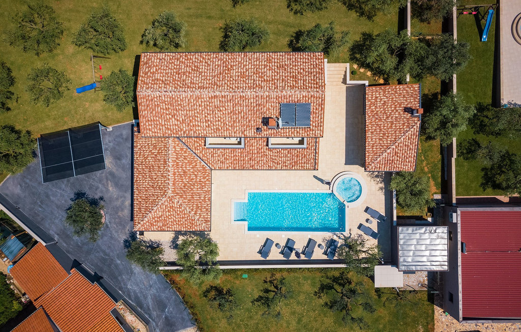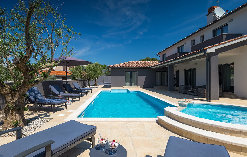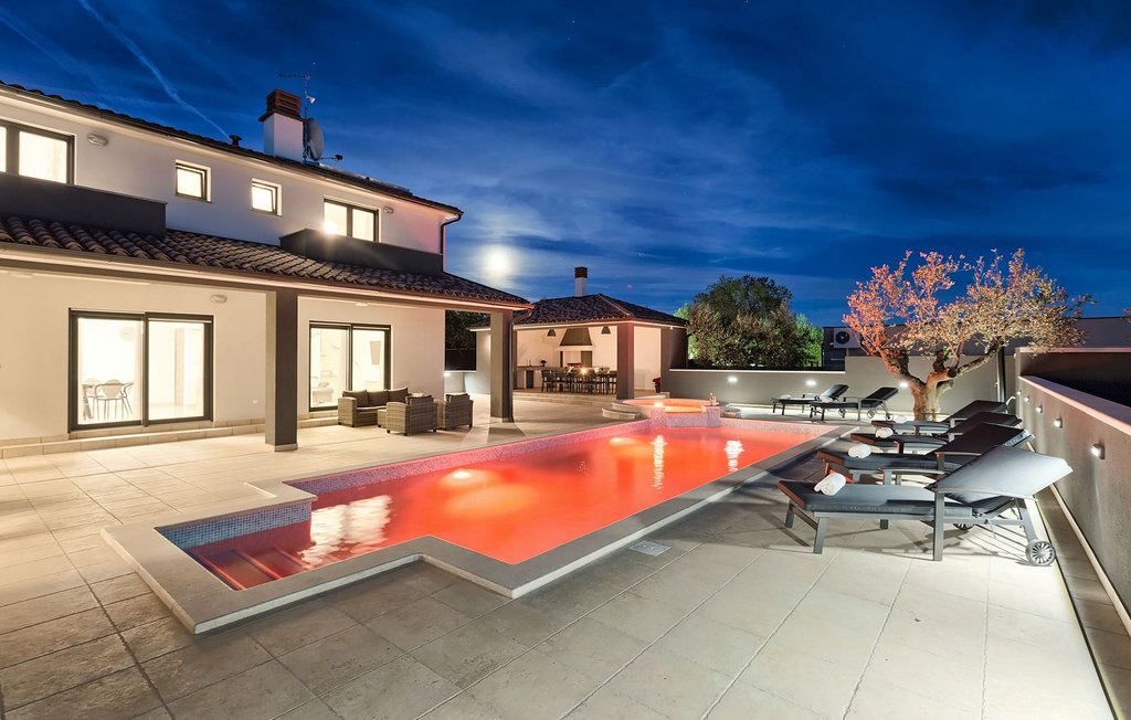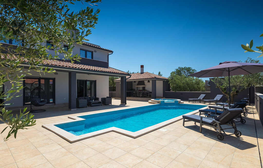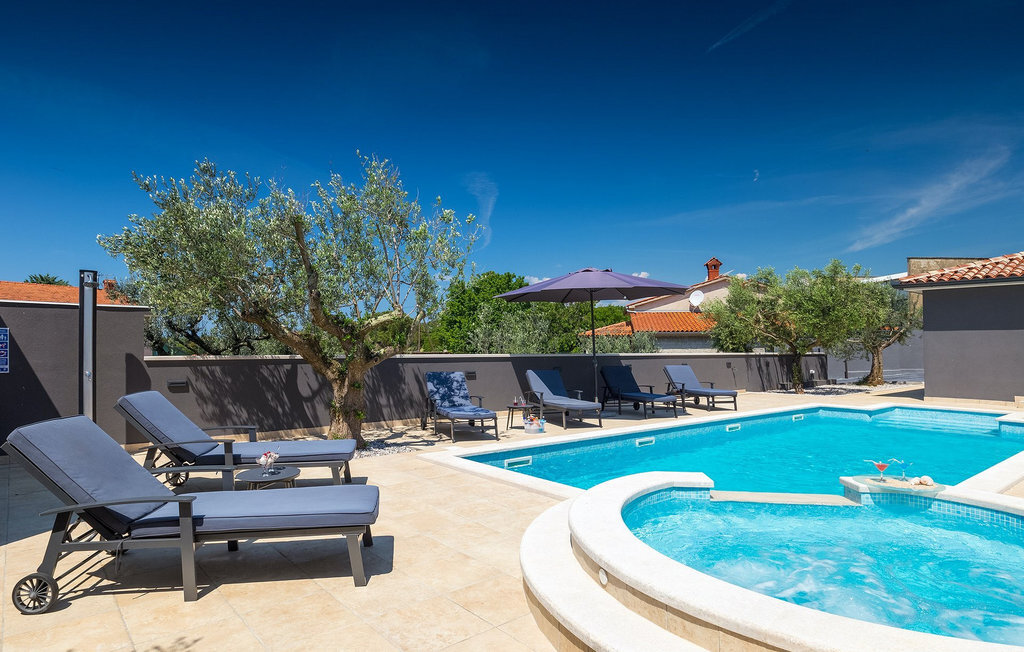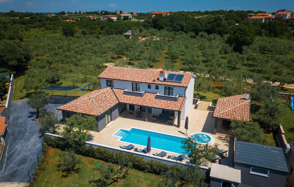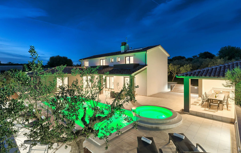 La Villa San Demich est une ravissante villa moderne qui vous offrira une expérience de vacances parfaite. La villa est située à Pula, à proximité de toutes les attractions historiques, des bars, des restaurants, etc. Elle est entourée d'un assez grand terrain - environ 1600 m2 - avec un grand jardin, une salle à manger en plein air, un jacuzzi extérieur et une piscine de 60m2. L'espace extérieur est assez grand pour accueillir 10 personnes. La villa dispose de 5 chambres, chacune avec de grands lits doubles, TV, climatisation et salle de bain en suite. Il y a également une sixième salle de bain. L'espace de vie comprend une cuisine moderne entièrement équipée, une salle à manger élégante et un salon confortable. Dans le salon se trouve un canapé-lit qui peut être utilisé comme couchage pour deux personnes. Depuis le salon, vous avez un accès direct à la piscine et au jardin, où vous pourrez passer des journées d'été inoubliables - soit dans la piscine, où vous pourrez vous rafraîchir du soleil, soit sur l'aire de jeux pour enfants, où vous pourrez passer de bons moments avec vos enfants, ou tout simplement à l'ombre de la cuisine extérieure, en lisant votre roman d'été préféré ou en savourant un délicieux repas. C'est à vous de choisir !