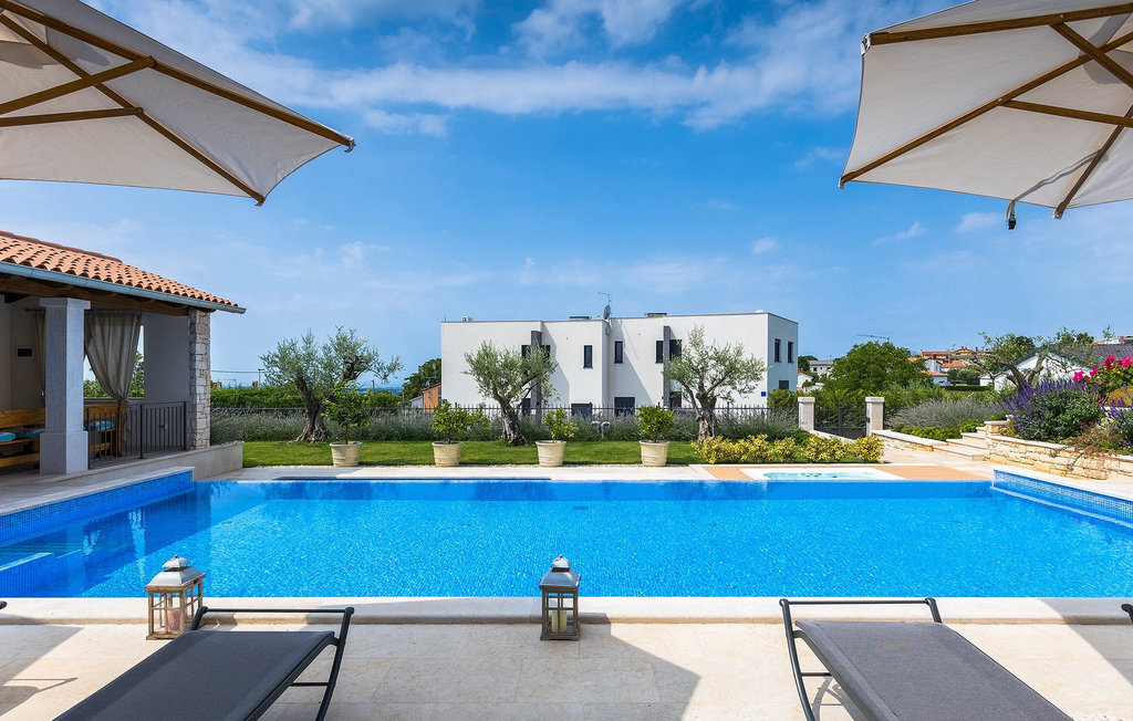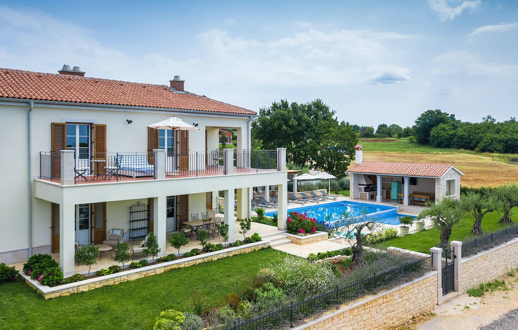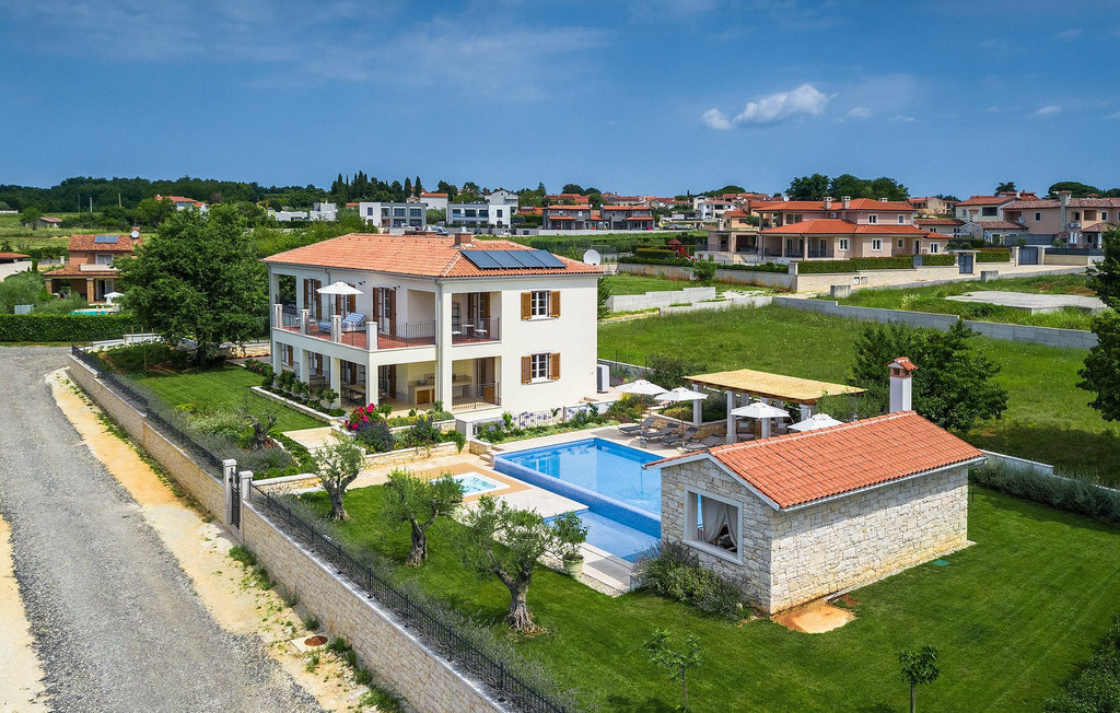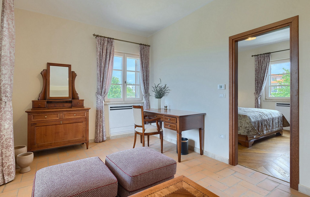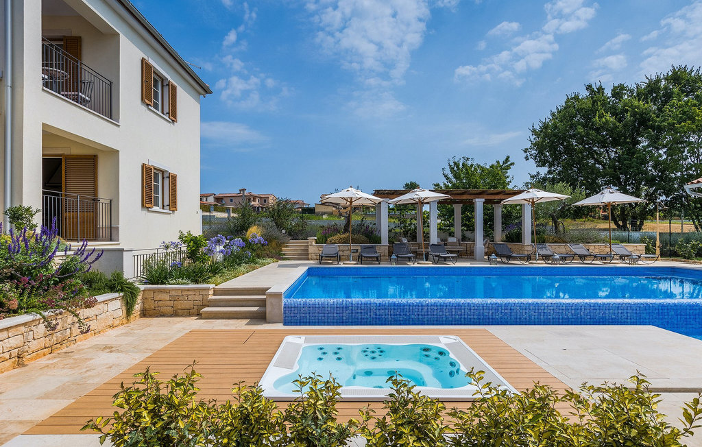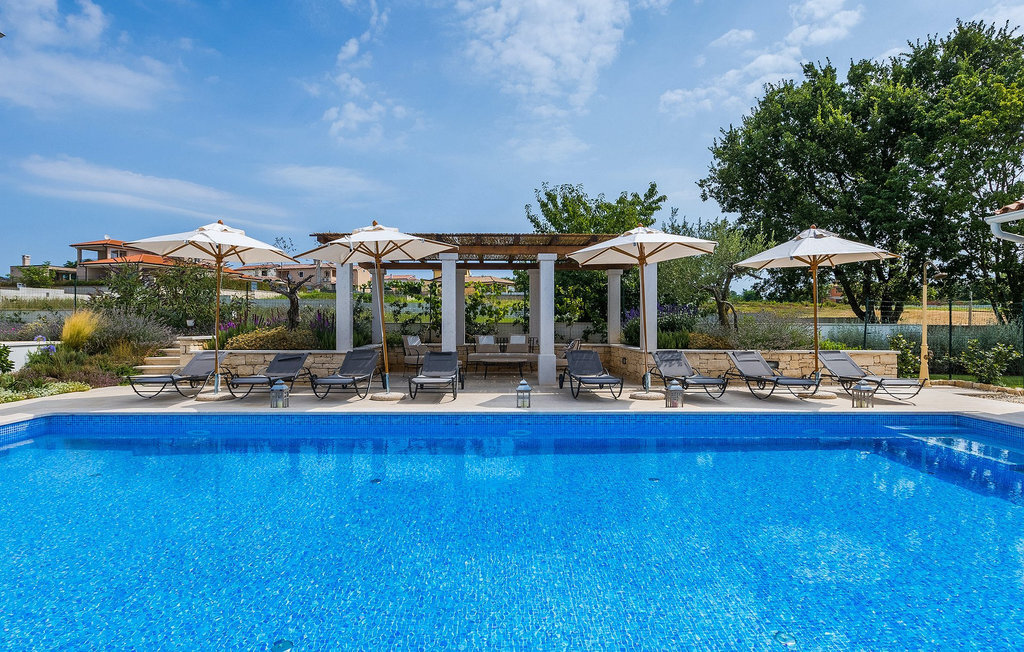 La belle villa Terrarossa Katelir est un bon choix pour des vacances reposantes en famille ou entre amis en Istrie. La villa est située dans un petit village, Kastelir, à seulement 10 kilomètres du joyau touristique qu'est Porec. Lorsque vous verrez cette imposante construction, vous ne resterez certainement pas indifférent. La villa est entourée d'un jardin de style méditerranéen soigneusement aménagé avec de la végétation locale. Outre la terrasse, il y a un jacuzzi extérieur et deux piscines. La plus grande fait 55 mètres carrés et la plus petite 12. Les chaises longues et les parasols près de la piscine sont un bon choix si vous avez besoin de calme et de détente ou si vous voulez simplement savourer une boisson fraîche avec votre livre préféré. À côté de la terrasse se trouve une salle à manger extérieure couverte. Il y a également une cuisine extérieure avec cheminée où vous pourrez préparer un délicieux repas. La villa elle-même est construite en matériaux naturels et peut accueillir un total de 10 hôtes dans quatre chambres. Au rez-de-chaussée de la villa se trouvent une chambre et une salle de bain en suite, des toilettes communes, un espace de vie ouvert avec une salle à manger. Au premier étage se trouvent les trois chambres restantes, chacune avec une salle de bain en suite. Dans chacune des deux suites juniors, il y a un canapé-lit. La terrasse du premier étage offre une vue magnifique sur les vignobles et les oliveraies qui font la renommée de ce petit village. Tous ceux qui veulent rester actifs même en vacances passeront certainement une partie de leur temps dans la cave. Il y a une salle de fitness et un sauna ainsi qu'une cuisine avec cheminée et table à manger. Lors de la décoration de la villa de luxe Terrasossa Katelir, une grande attention a été portée aux détails, aux matériaux naturels et au travail manuel. Choisir cette villa pour des vacances parfaites est la bonne décision et vous voudrez certainement y revenir!La villa Terrarossa Katelir se trouve dans la ville du même nom, Katelir, qui n'est qu'à 10 kilomètres de Porec. Kastelir se trouve sur la côte ouest de l'Istrie. Le petit village est entouré d'oliveraies et de vignobles, il n'est donc pas surprenant que vous puissiez y déguster, mais aussi acheter, de l'huile d'olive et du vin très savoureux et de grande qualité. De nombreux habitants travaillent dans l'agriculture, ce qui se répercute naturellement sur l'excellente offre gastronomique. Visitez l'un des restaurants locaux et choisissez l'un des plats traditionnels d'Istrie, nous sommes sûrs que vous vous régalerez !