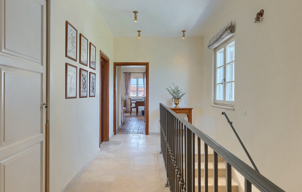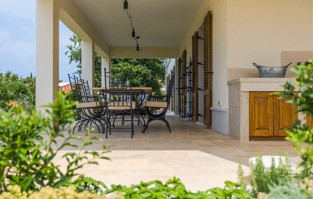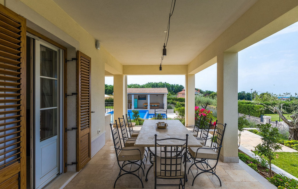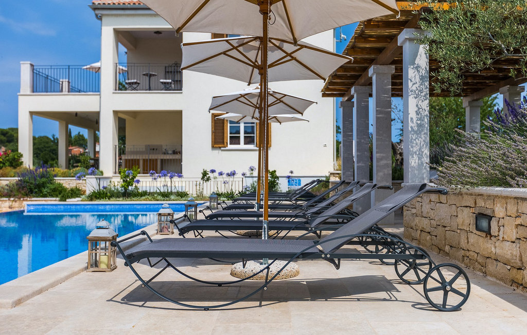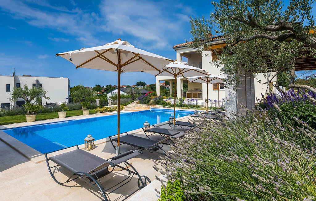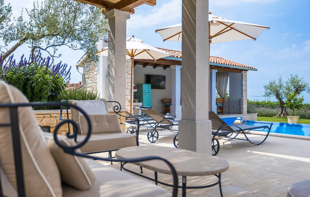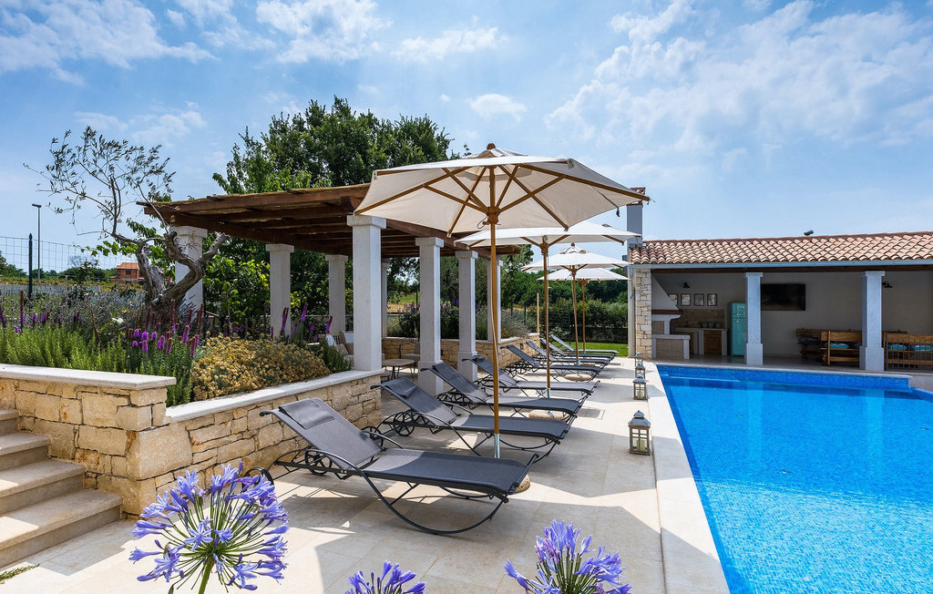 La belle villa Terrarossa Katelir est un bon choix pour des vacances reposantes en famille ou entre amis en Istrie. La villa est située dans un petit village, Kastelir, à seulement 10 kilomètres du joyau touristique qu'est Porec. Lorsque vous verrez cette imposante construction, vous ne resterez certainement pas indifférent. La villa est entourée d'un jardin de style méditerranéen soigneusement aménagé avec de la végétation locale. Outre la terrasse, il y a un jacuzzi extérieur et deux piscines. La plus grande fait 55 mètres carrés et la plus petite 12. Les chaises longues et les parasols près de la piscine sont un bon choix si vous avez besoin de calme et de détente ou si vous voulez simplement savourer une boisson fraîche avec votre livre préféré. À côté de la terrasse se trouve une salle à manger extérieure couverte. Il y a également une cuisine extérieure avec cheminée où vous pourrez préparer un délicieux repas. La villa elle-même est construite en matériaux naturels et peut accueillir un total de 10 hôtes dans quatre chambres. Au rez-de-chaussée de la villa se trouvent une chambre et une salle de bain en suite, des toilettes communes, un espace de vie ouvert avec une salle à manger. Au premier étage se trouvent les trois chambres restantes, chacune avec une salle de bain en suite. Dans chacune des deux suites juniors, il y a un canapé-lit. La terrasse du premier étage offre une vue magnifique sur les vignobles et les oliveraies qui font la renommée de ce petit village. Tous ceux qui veulent rester actifs même en vacances passeront certainement une partie de leur temps dans la cave. Il y a une salle de fitness et un sauna ainsi qu'une cuisine avec cheminée et table à manger. Lors de la décoration de la villa de luxe Terrasossa Katelir, une grande attention a été portée aux détails, aux matériaux naturels et au travail manuel. Choisir cette villa pour des vacances parfaites est la bonne décision et vous voudrez certainement y revenir!La villa Terrarossa Katelir se trouve dans la ville du même nom, Katelir, qui n'est qu'à 10 kilomètres de Porec. Kastelir se trouve sur la côte ouest de l'Istrie. Le petit village est entouré d'oliveraies et de vignobles, il n'est donc pas surprenant que vous puissiez y déguster, mais aussi acheter, de l'huile d'olive et du vin très savoureux et de grande qualité. De nombreux habitants travaillent dans l'agriculture, ce qui se répercute naturellement sur l'excellente offre gastronomique. Visitez l'un des restaurants locaux et choisissez l'un des plats traditionnels d'Istrie, nous sommes sûrs que vous vous régalerez !