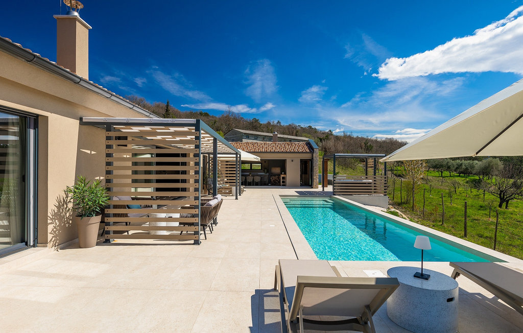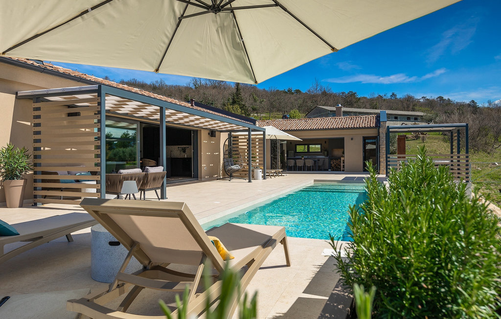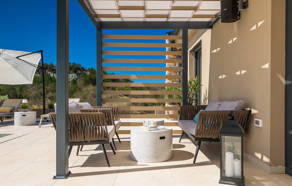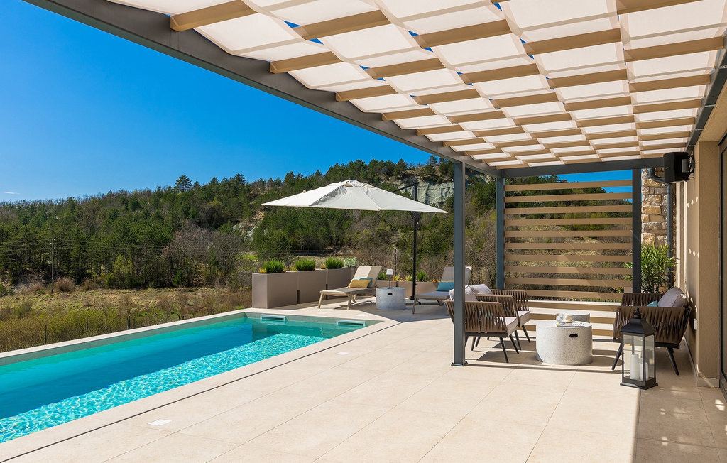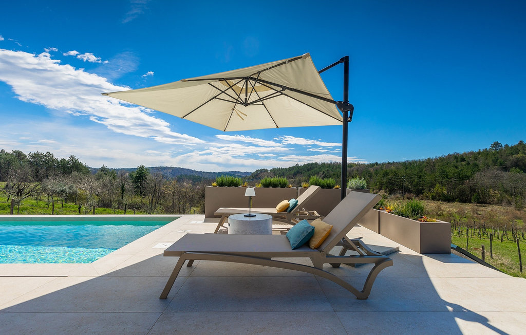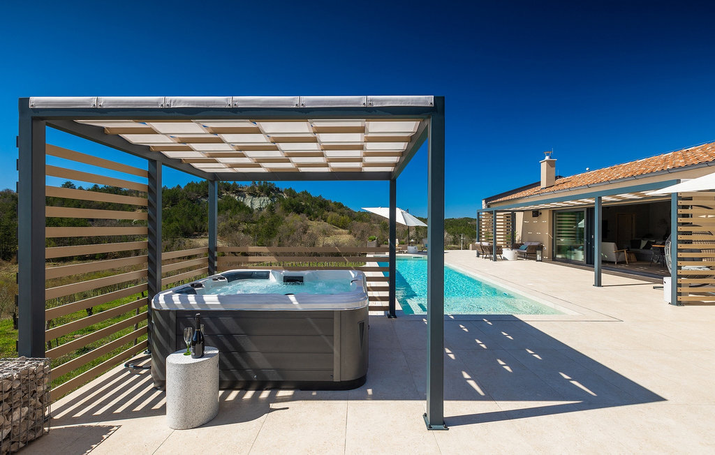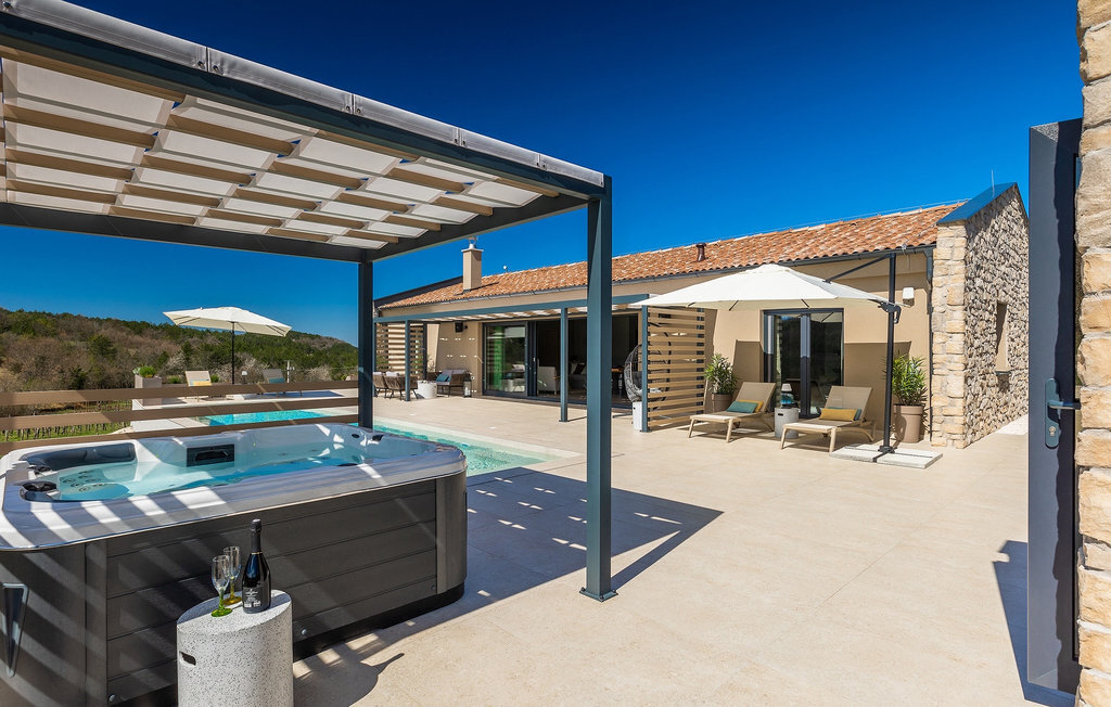 Bien-être à l'extérieur : Location de vacances disposant de chaises-longues et d'un ou plusieurs équipements tels que piscine extérieure, jacuzzi extérieur, lit à baldaquin de jardin etc...