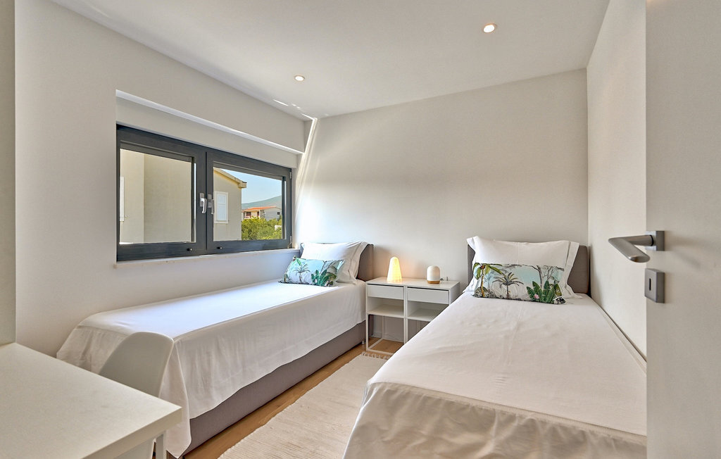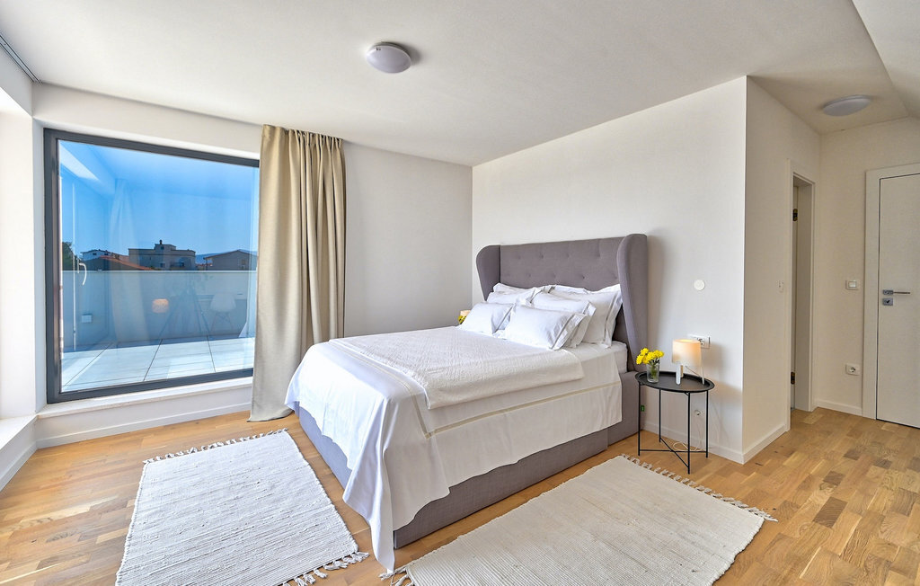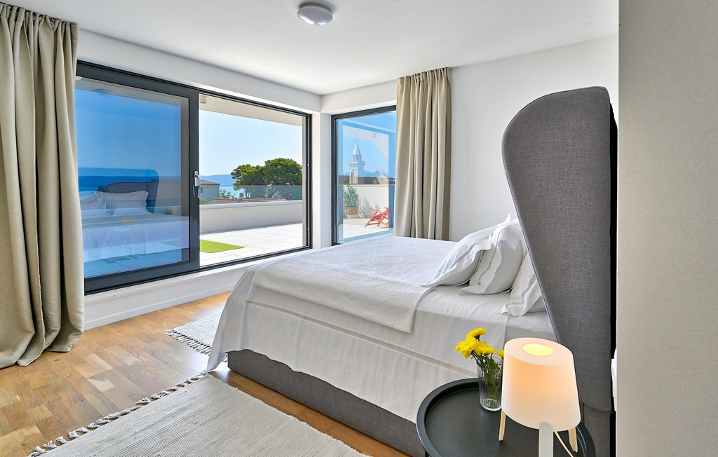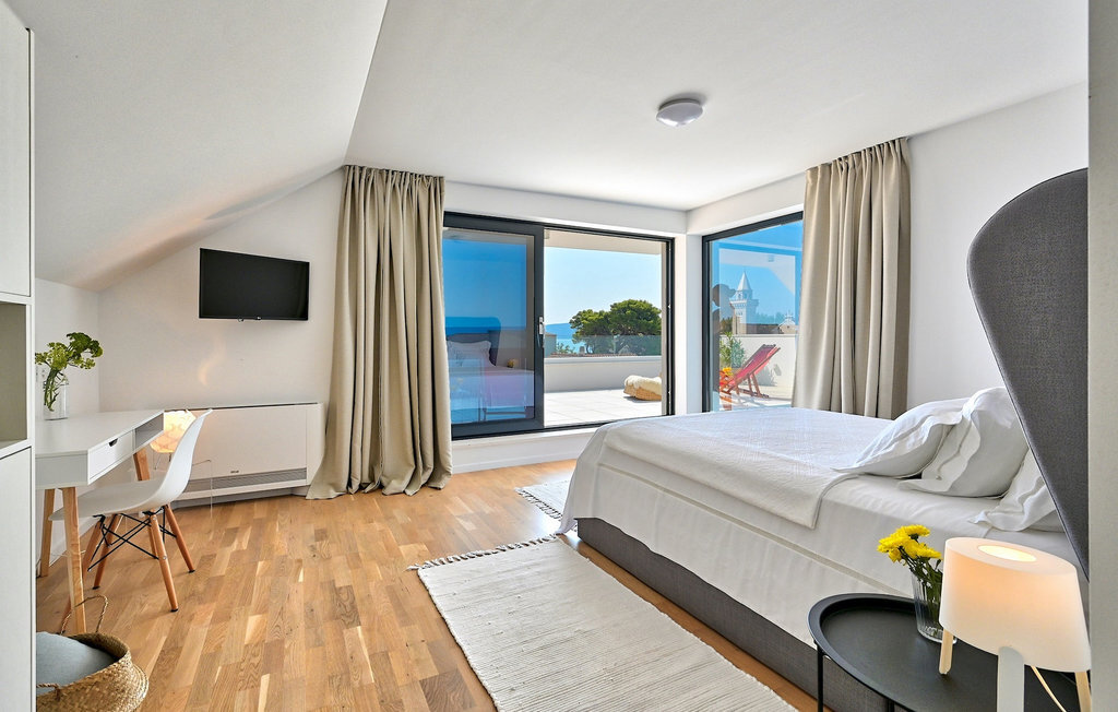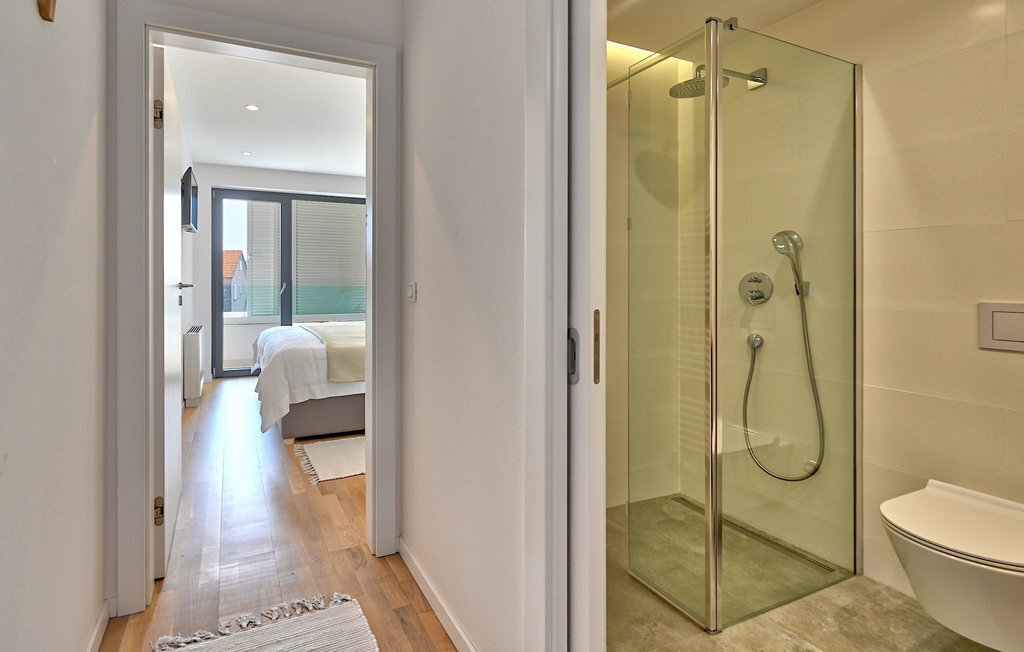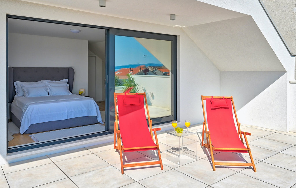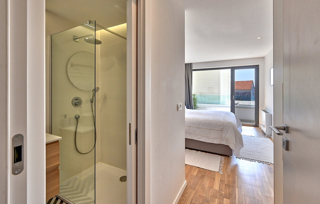 Deux des chambres disposent chacune d'un lit double et d'une salle de bain privée ainsi que d'un balcon. Les deux autres chambres et une salle de bain sont plutôt conçues comme un espace familial. Il se compose d'une chambre à coucher avec un lit double et un balcon, tandis que la deuxième chambre comporte deux lits simples qui peuvent être réunis si nécessaire. Ces deux chambres partagent une salle de bain. Au dernier étage, vous pourrez vous détendre dans une chambre confortable avec salle de bain et grande terrasse avec vue sur la mer.