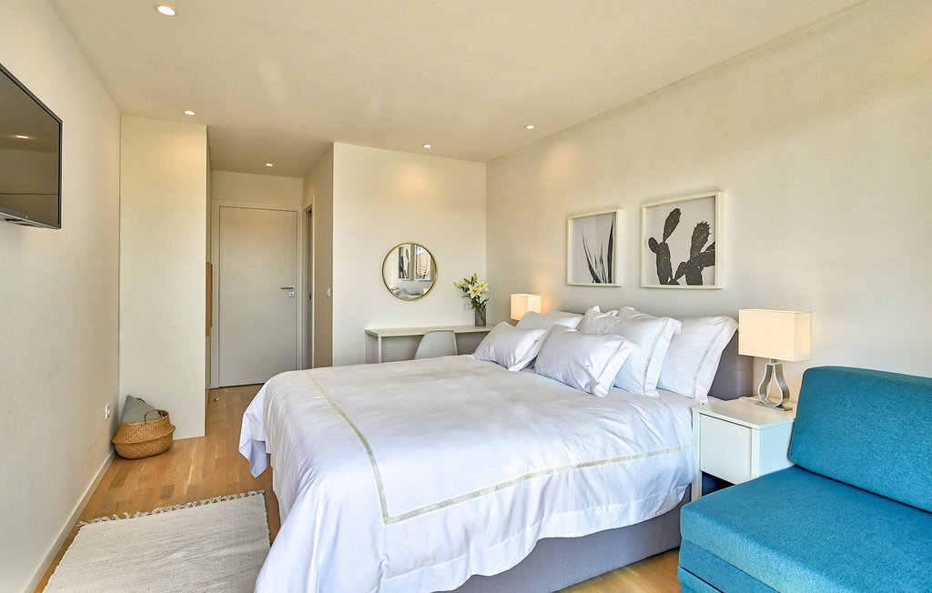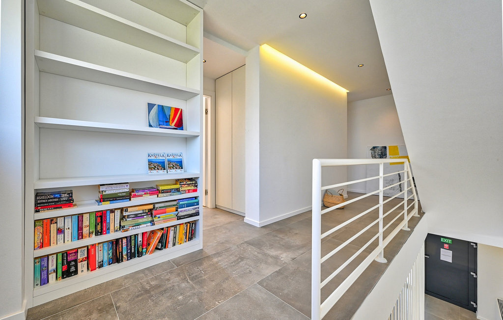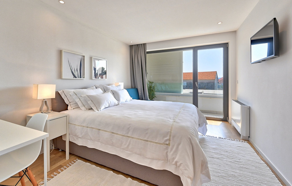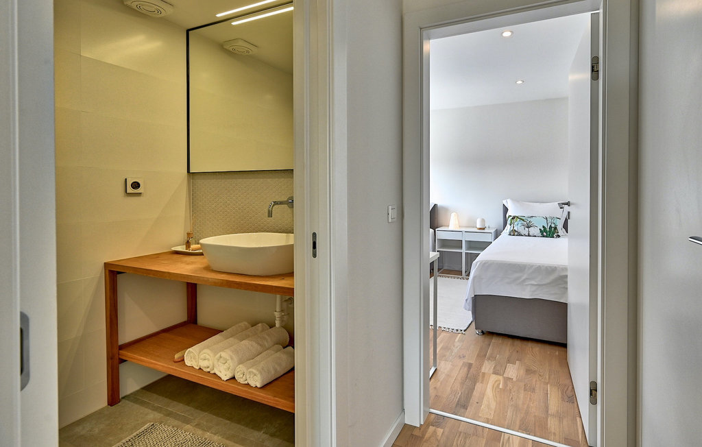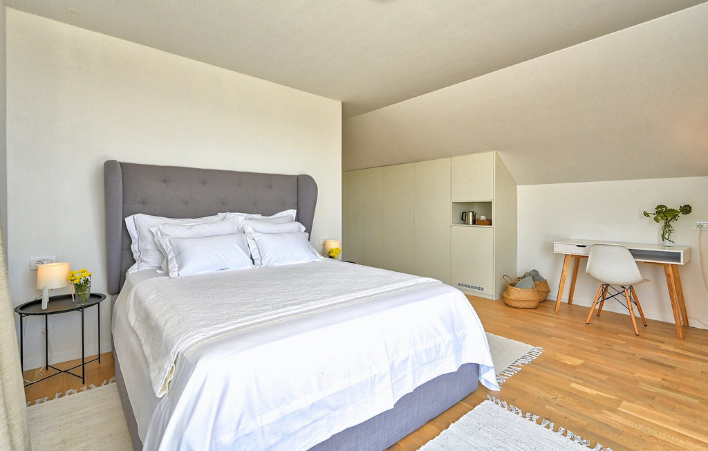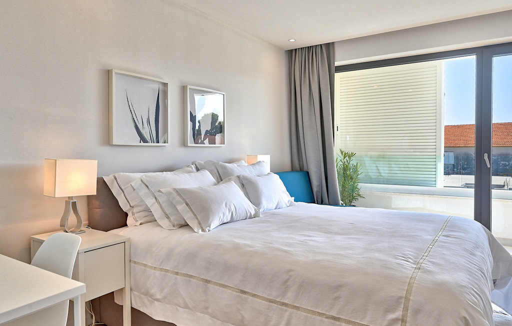 Deux des chambres disposent chacune d'un lit double et d'une salle de bain privée ainsi que d'un balcon. Les deux autres chambres et une salle de bain sont plutôt conçues comme un espace familial. Il se compose d'une chambre à coucher avec un lit double et un balcon, tandis que la deuxième chambre comporte deux lits simples qui peuvent être réunis si nécessaire. Ces deux chambres partagent une salle de bain. Au dernier étage, vous pourrez vous détendre dans une chambre confortable avec salle de bain et grande terrasse avec vue sur la mer.