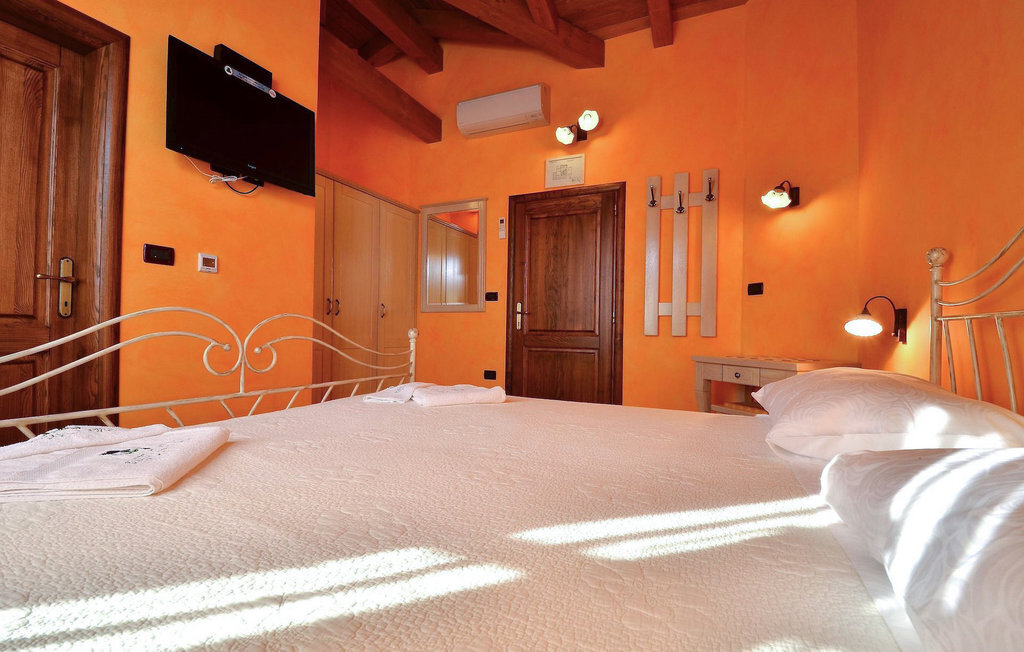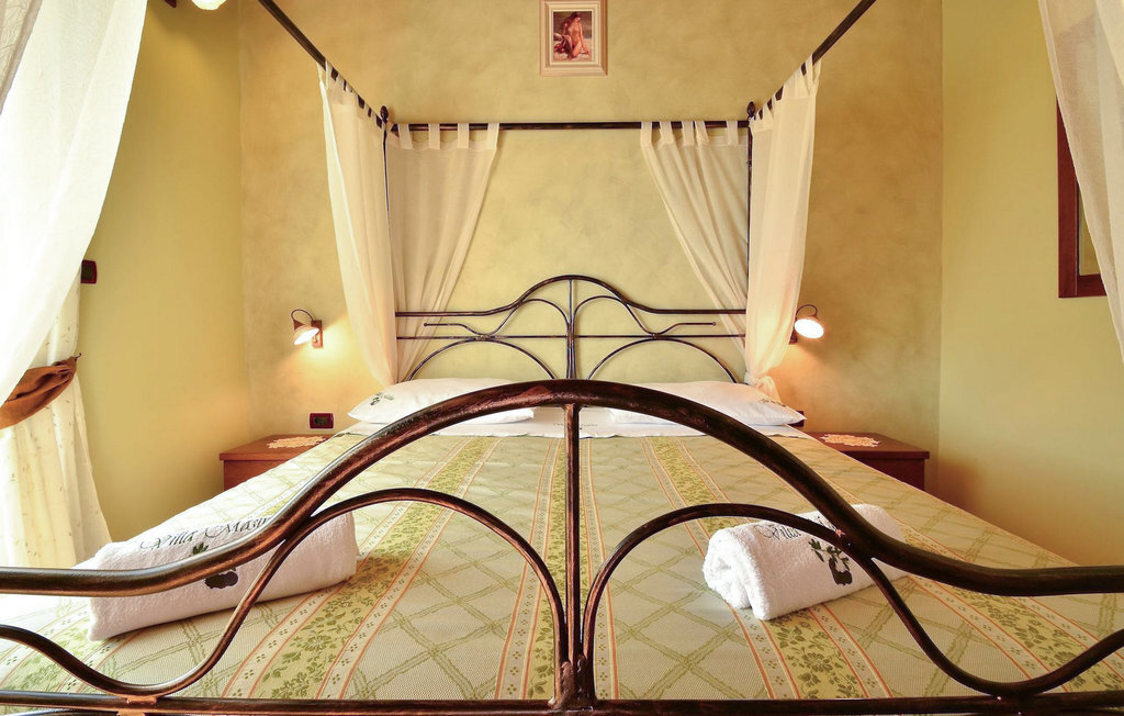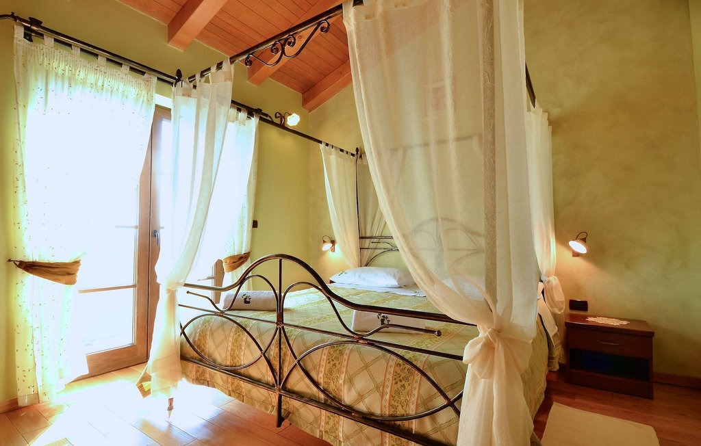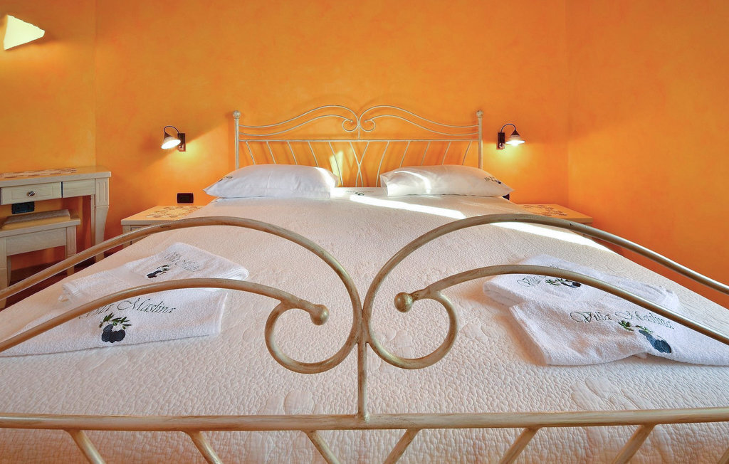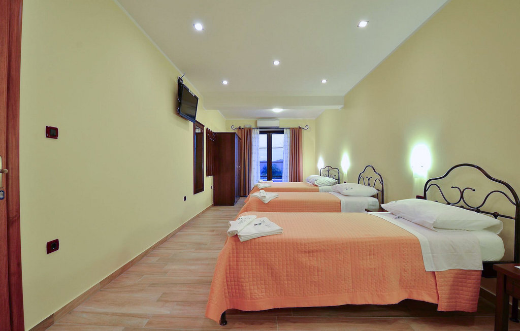 La cinquième chambre, la plus grande, se trouve au rez-de-chaussée. Elle dispose d'un lit double et de deux lits simples, d'une salle de bain moderne et d'une sortie directe sur le jardin.