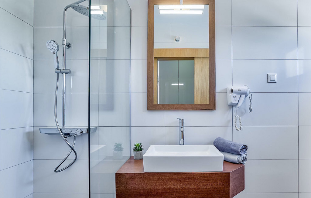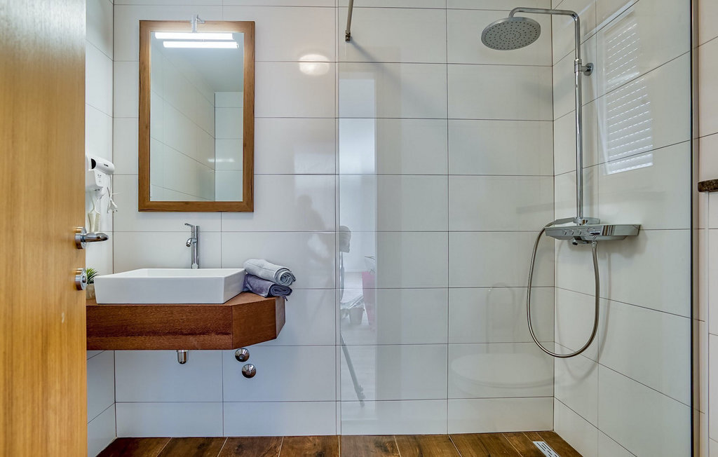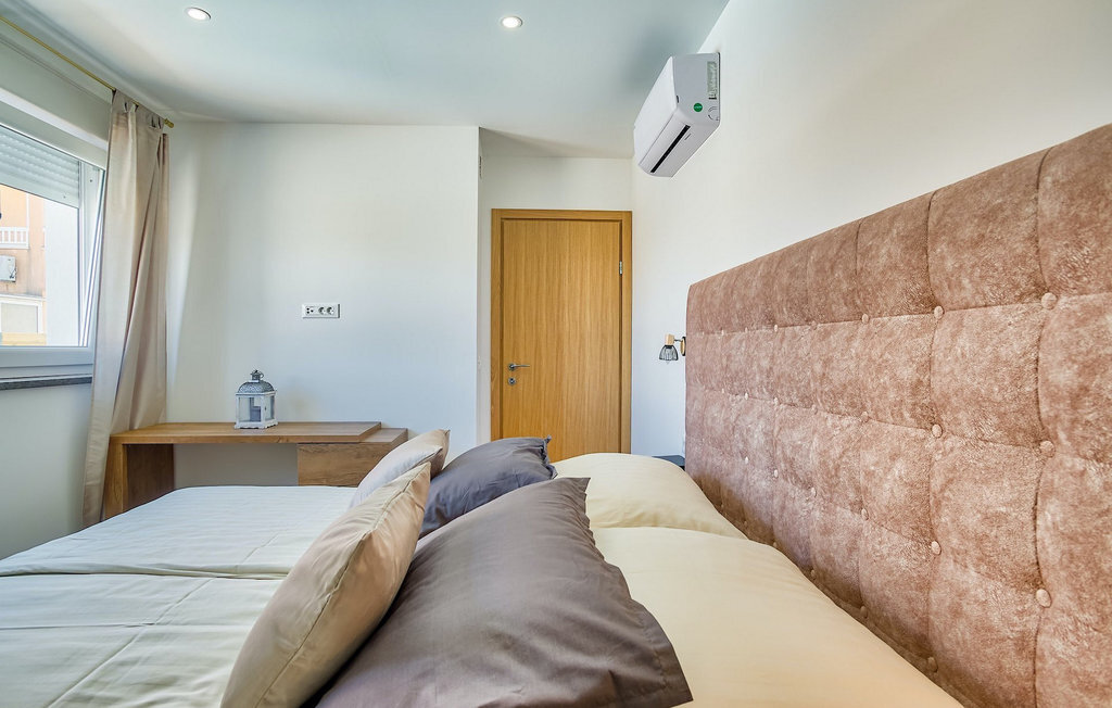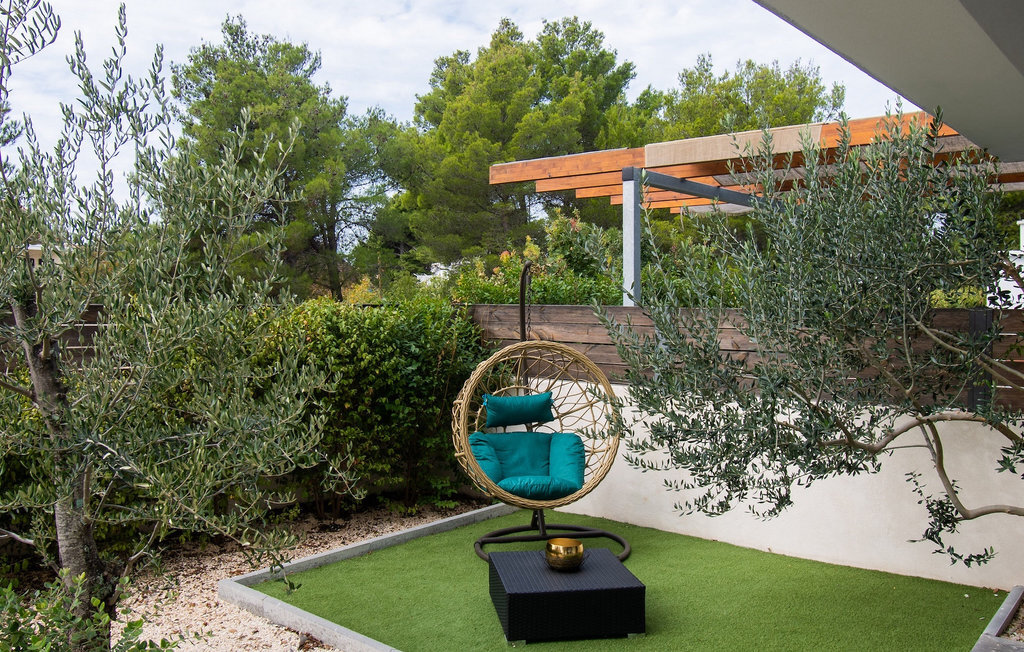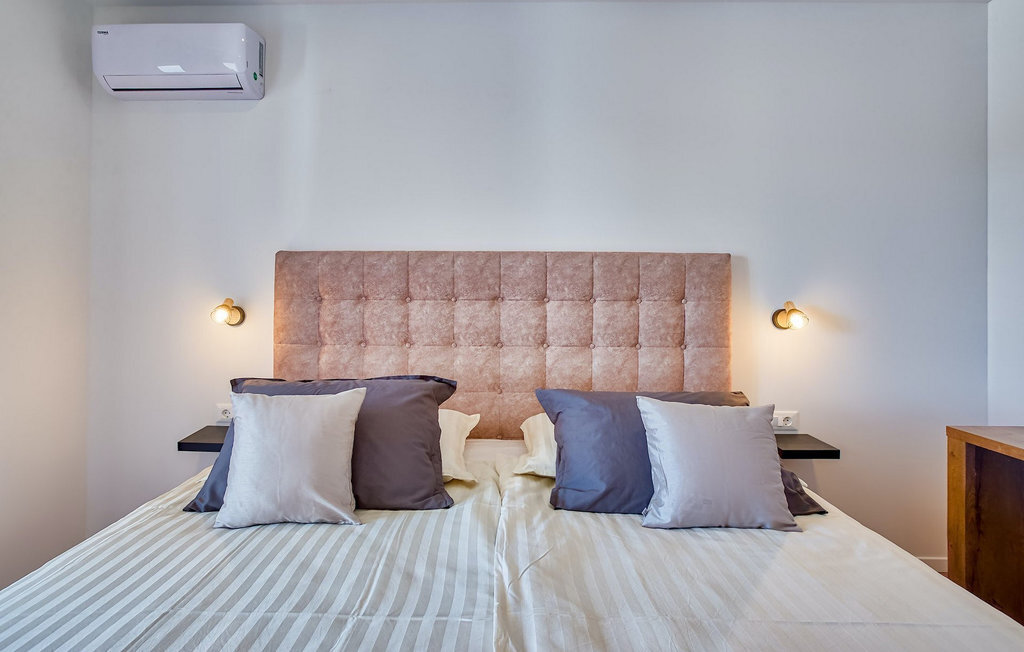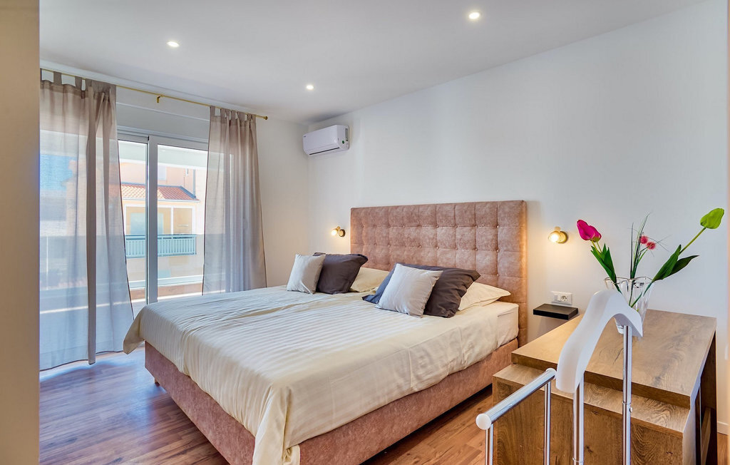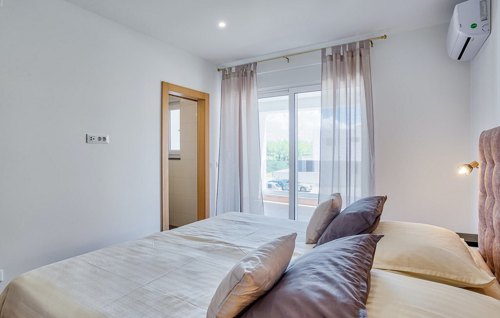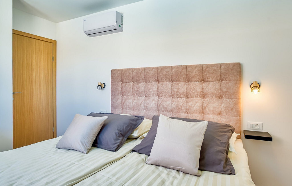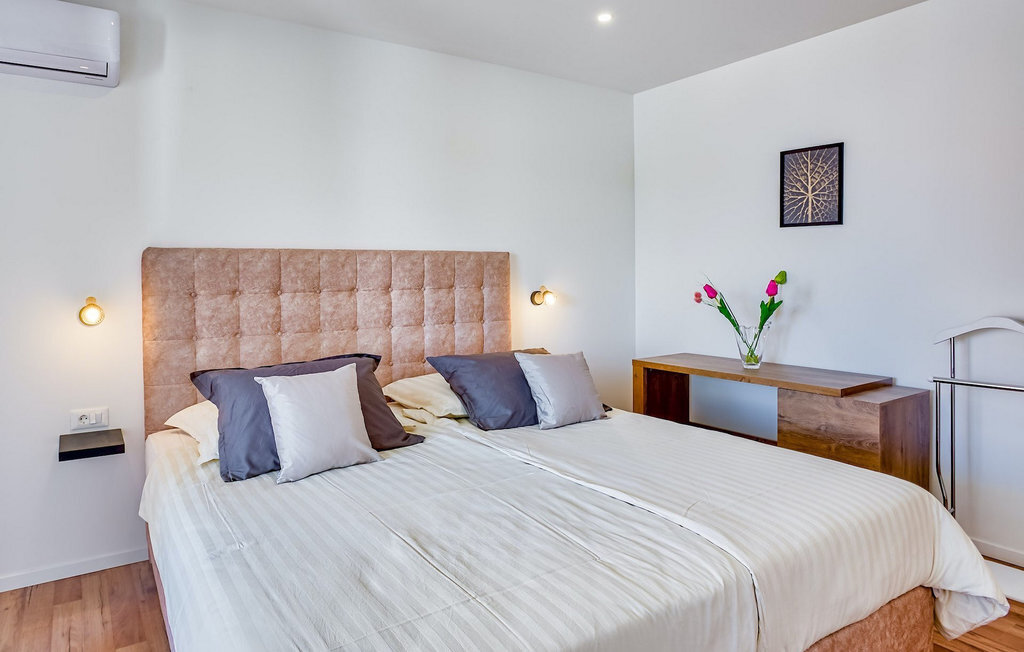 Les trois autres chambres à coucher baignées de lumière, toutes avec un lit double et une salle de bain privée, se trouvent au premier étage, où se trouve également une terrasse moderne et spacieuse. La quatrième salle de bains se trouve au rez-de-chaussée et toutes les chambres ainsi que le salon sont climatisés.