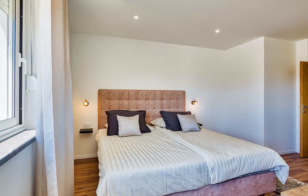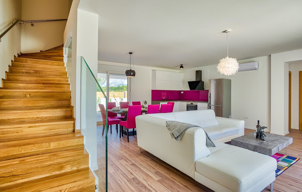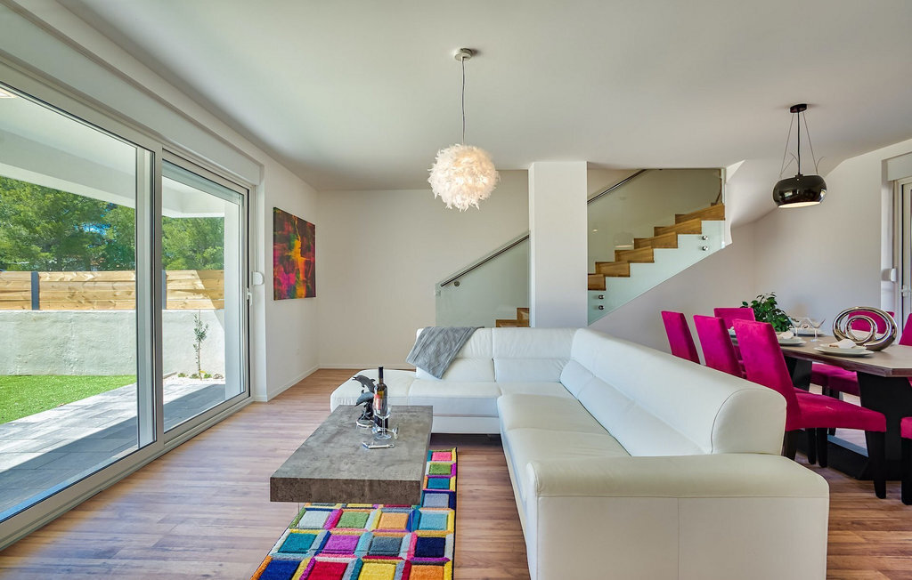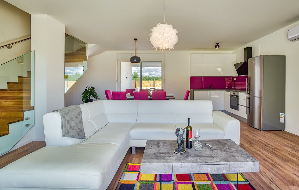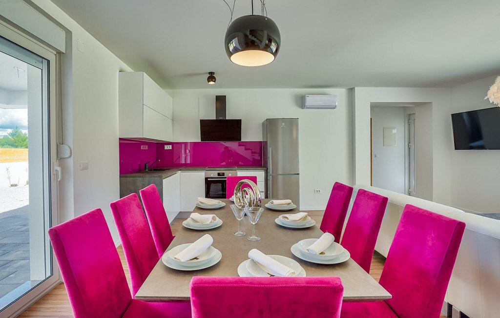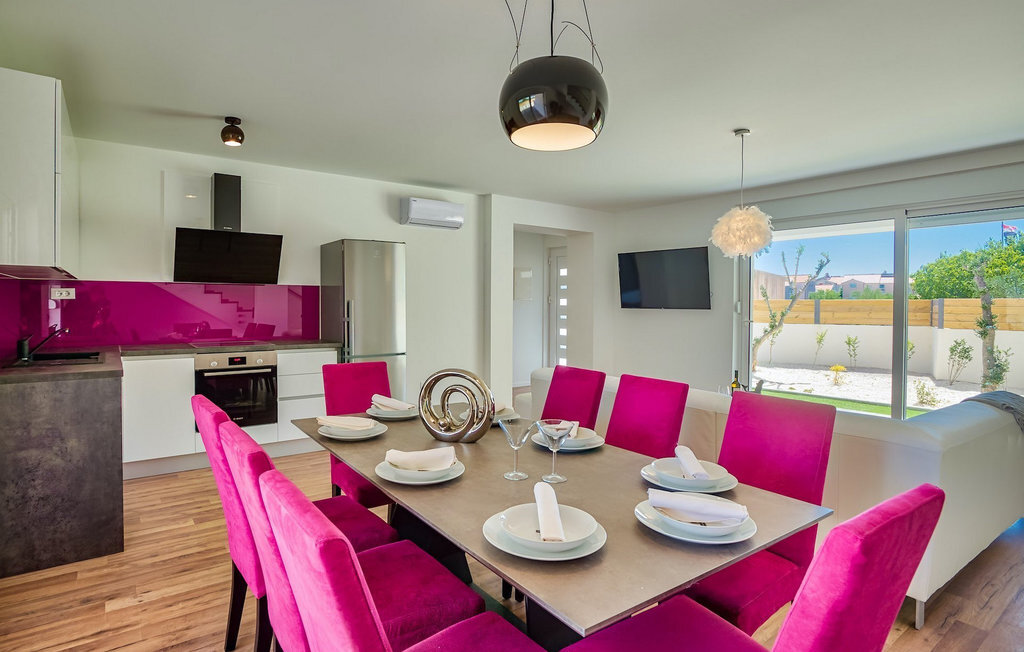 L'intérieur clair et lumineux offre un espace de vie ouvert avec cuisine et salle à manger aux détails roses, avec un accès direct à l'espace extérieur avec piscine privée, où vous pourrez vous détendre sur les chaises longues ou dans le confortable espace salon. La chambre spacieuse du rez-de-chaussée offre également un accès direct à la piscine, ce qui est très pratique pour tous les lève-tôt qui souhaitent avoir la piscine pour eux le matin.