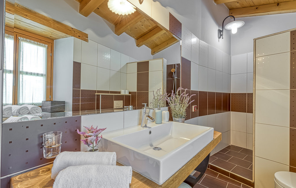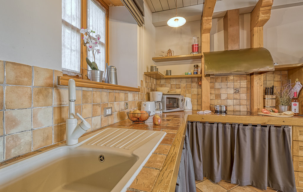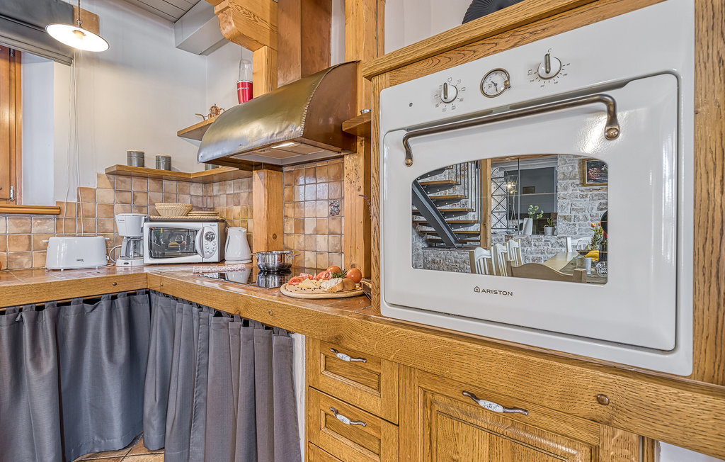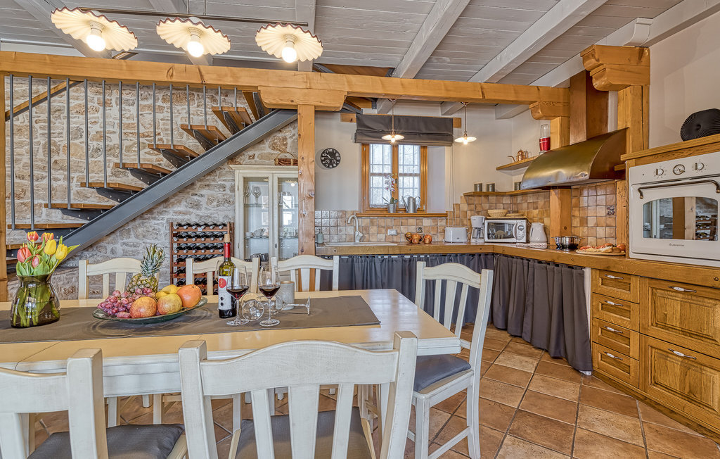 Mais entrons Le rez-de-chaussée comprend un salon confortable avec une cheminée et une cuisine avec une table à manger pouvant accueillir jusqu'à 8 personnes. Tout est conçu dans un style chaleureux et rustique, ce qui vous donne un sentiment d'être chez vous. Au même niveau, vous trouverez une chambre à coucher avec sa propre salle de bain.