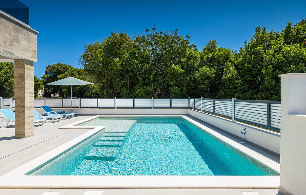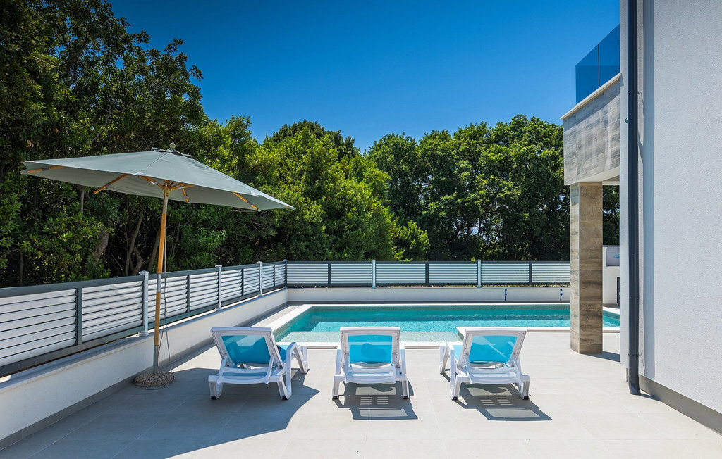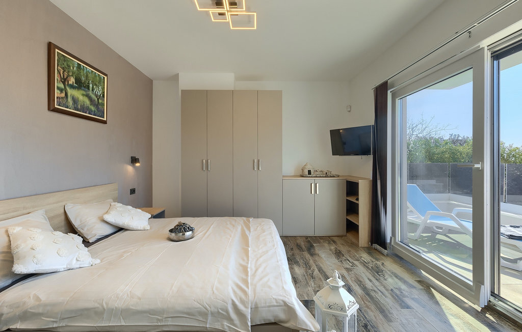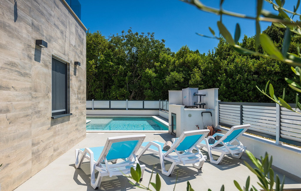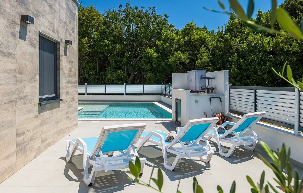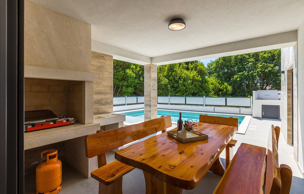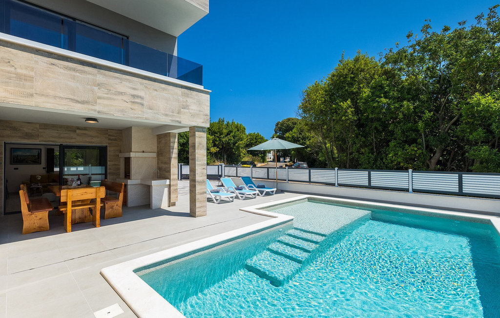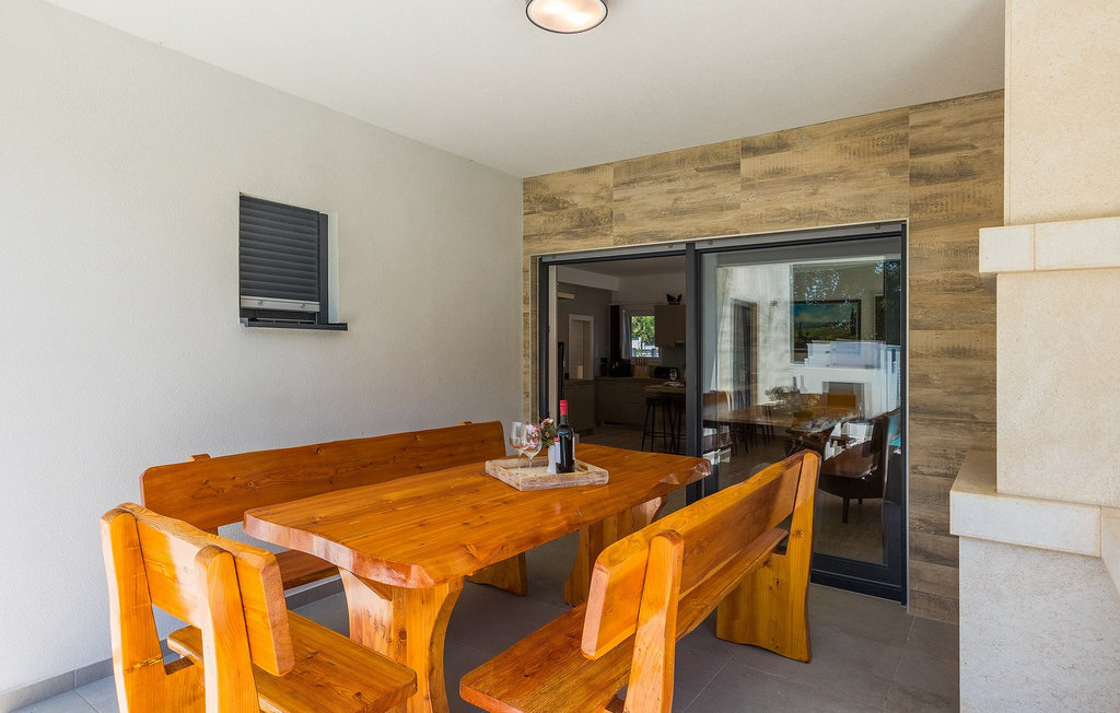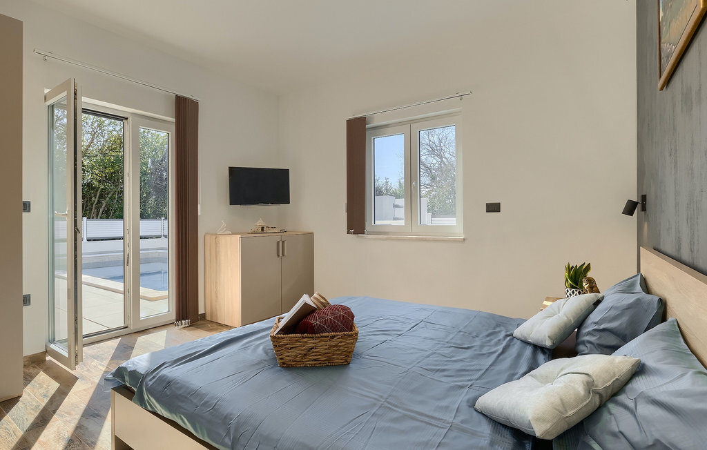 La villa Pervan est divisée en deux étages. Le rez-de-chaussée dispose d'un salon ouvert, d'une salle à manger, d'une cuisine équipée et d'une chambre à coucher avec salle de bain privée. La cuisine entièrement équipée permet de préparer de délicieuses spécialités. Profitez de la vue sur la piscine privée depuis le confortable salon. Des chaises longues et des parasols sont disponibles autour de la piscine. Depuis le salon, vous avez accès à la terrasse avec une table à manger et un barbecue à gaz pour des soirées inoubliables avec votre famille et vos amis. Au premier étage de la villa se trouvent deux chambres confortables avec salle de bain privée.