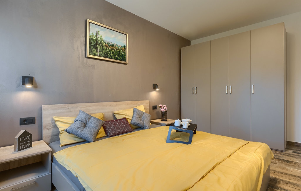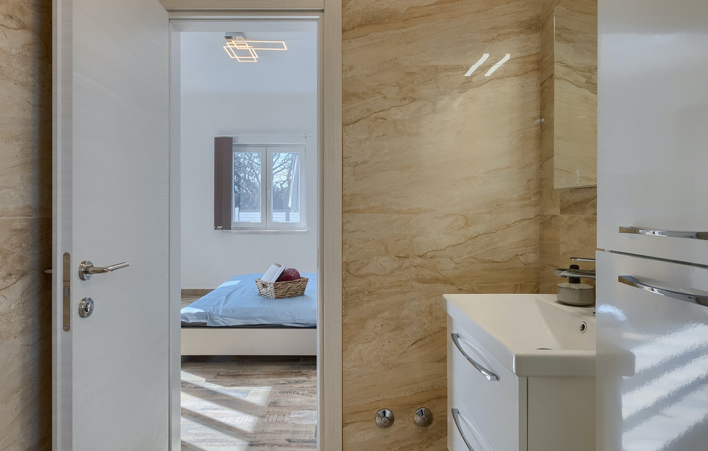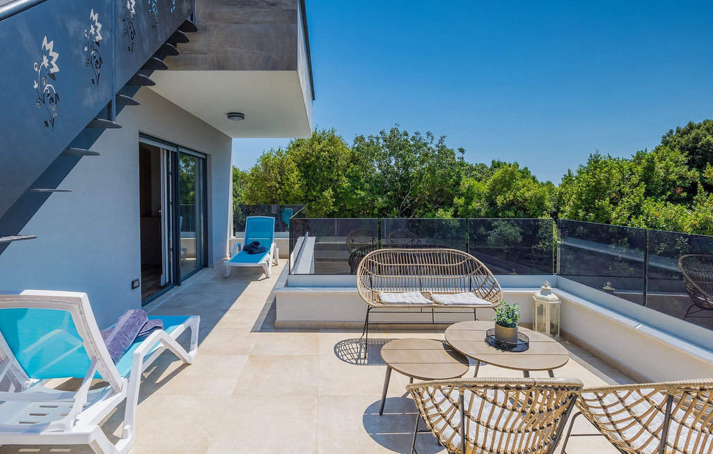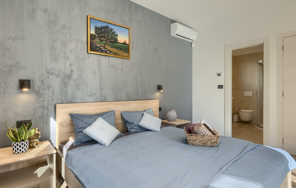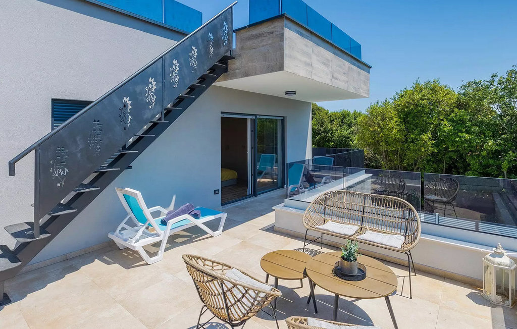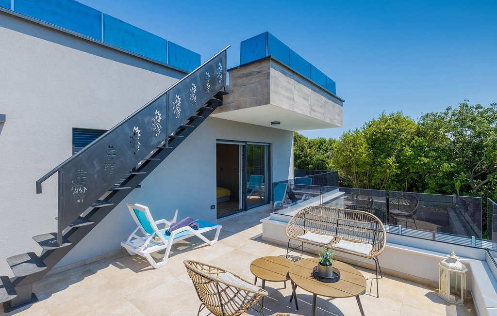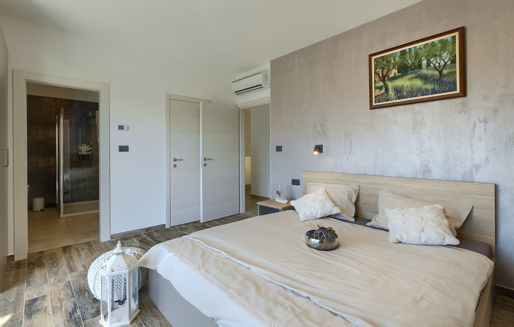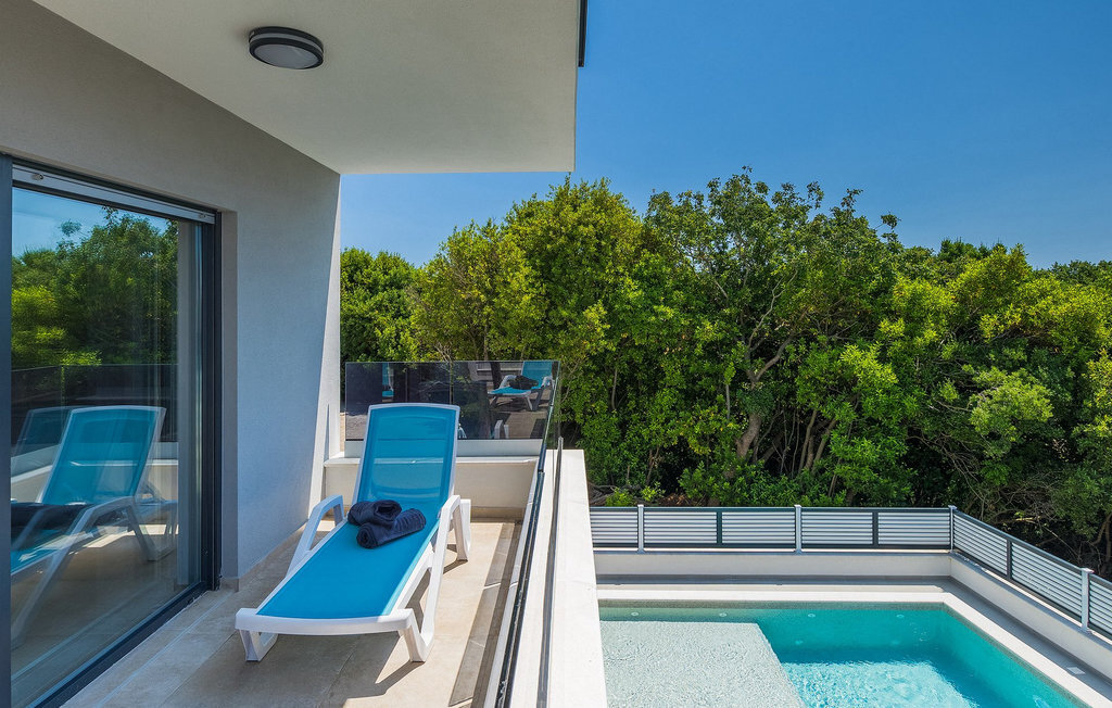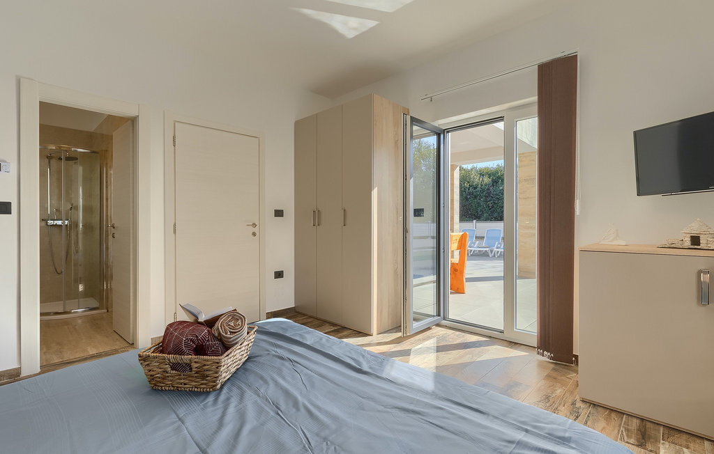 La villa Pervan est divisée en deux étages. Le rez-de-chaussée dispose d'un salon ouvert, d'une salle à manger, d'une cuisine équipée et d'une chambre à coucher avec salle de bain privée. La cuisine entièrement équipée permet de préparer de délicieuses spécialités. Profitez de la vue sur la piscine privée depuis le confortable salon. Des chaises longues et des parasols sont disponibles autour de la piscine. Depuis le salon, vous avez accès à la terrasse avec une table à manger et un barbecue à gaz pour des soirées inoubliables avec votre famille et vos amis. Au premier étage de la villa se trouvent deux chambres confortables avec salle de bain privée.