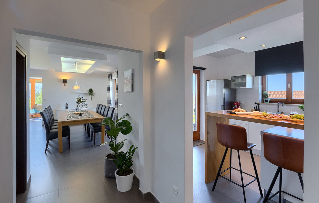 Réservez la Villa Brdo et passez des vacances reposantes en famille en Istrie ! La Villa Brdo est exclusivement destinée aux vacances en famille et non aux fêtes sauvages & aux groupes de jeunes visiteurs.La Villa Brdo est située dans un petit village de Katun Trviski au cœur de l'Istrie, près de la ville de Pazin, où vous passerez des vacances tranquilles. Bien que la villa se trouve dans un quartier calme, vous trouverez dans les environs de nombreuses curiosités qui valent certainement le détour. Près de la petite ville de Trviz, sur la colline de Piloscak, se trouve l'un des plus beaux points de vue d'Istrie. Comme la villa est située au milieu de l'Istrie, elle constitue un point de départ idéal pour explorer cette magnifique région. De nombreux villages et villes situés au sommet des collines vous enchanteront par leur authenticité, leur architecture intéressante et leurs traditions. Vous apprécierez la ville de Pazin, où le château de Pazin vaut particulièrement le détour. Si vous vous dirigez vers la côte, une visite des villes de Porec et Novigrad, situées à seulement 30 kilomètres de la villa, est un élément indispensable de votre séjour. Pendant les mois d'été, Porec et Novigrad proposent de nombreuses manifestations culturelles et de divertissement. La dégustation des spécialités istriennes les plus célèbres, comme l'huile d'olive, le jambon d'Istrie (prsut) et les truffes, est également un élément important de votre visite en Istrie. Vous les trouverez dans tous les restaurants et toutes les tavernes d'Istrie. Cette région est également idéale pour tous les vacanciers actifs, car l'Istrie centrale dispose de nombreuses pistes cyclables et de sentiers de randonnée.